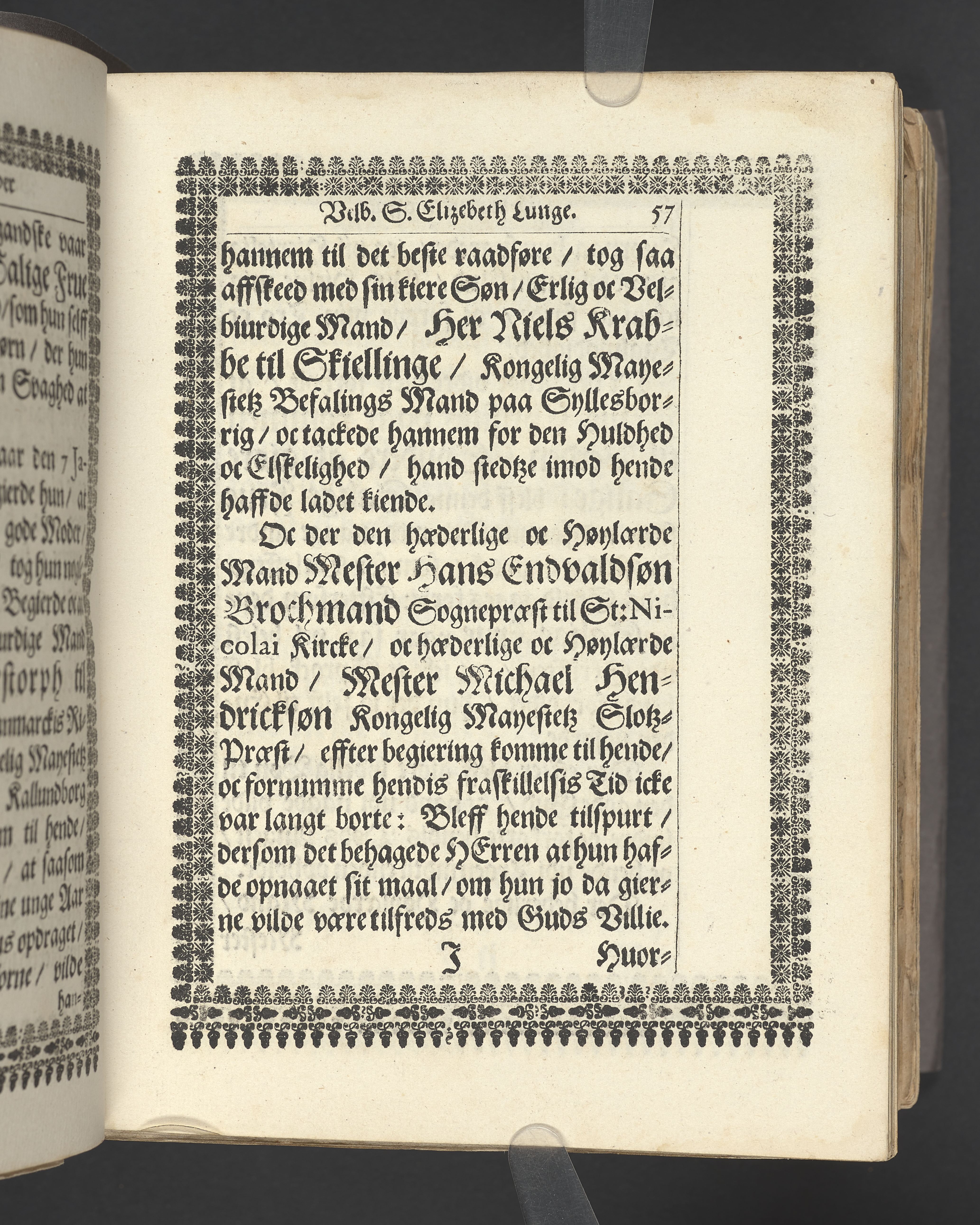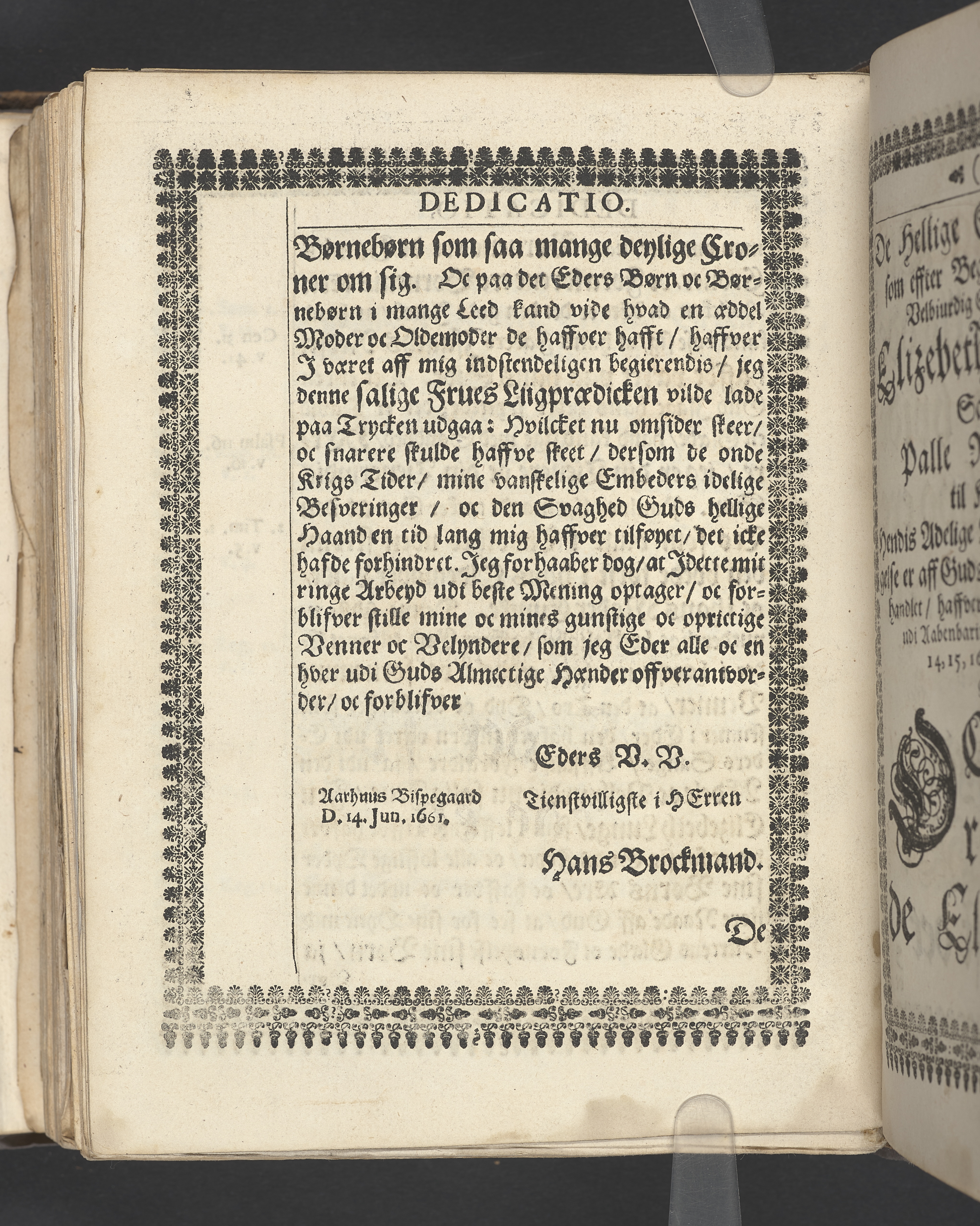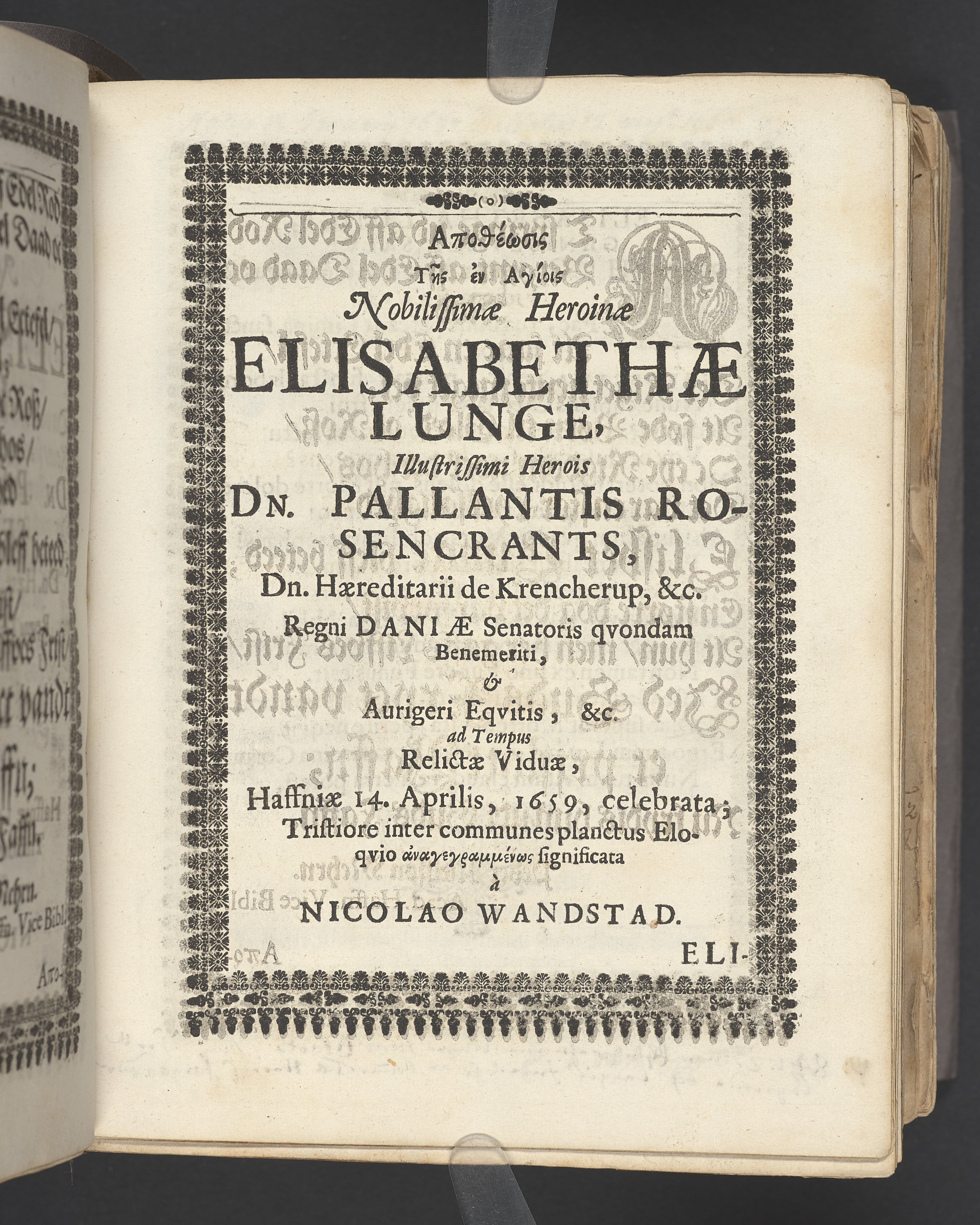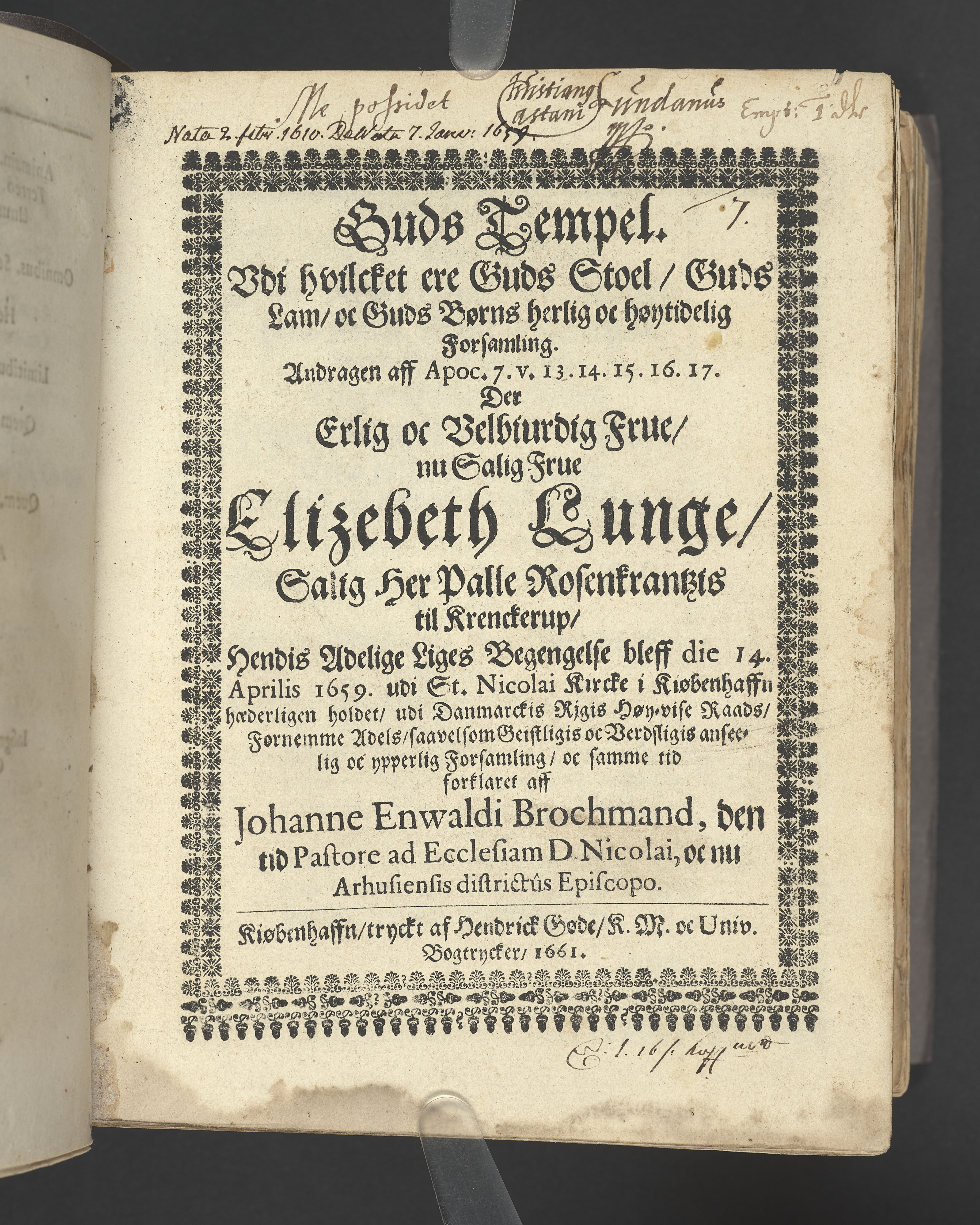 Guds Tempel, vdi hvilcket ere Guds Stoel, Guds Lam, oc Guds Børns herlig oc høytidelig Forsamling. Andragen ... der erlig oc velbiurdig Frue, nu salig frue, Elizebeth Lunge, salig Her Palle Rosenkrantzis til Krenckerup, hendis Liges Begengelse bleff die 14 Aprilis 1659 udi St. Nicolai kircke i Kiøbenhaffn hederligen holdet ... Forklaret aff Johanne Enwaldi Brochmand ... Kiøbenhaffn, tryckt af Hendrick Göde ... 1661.