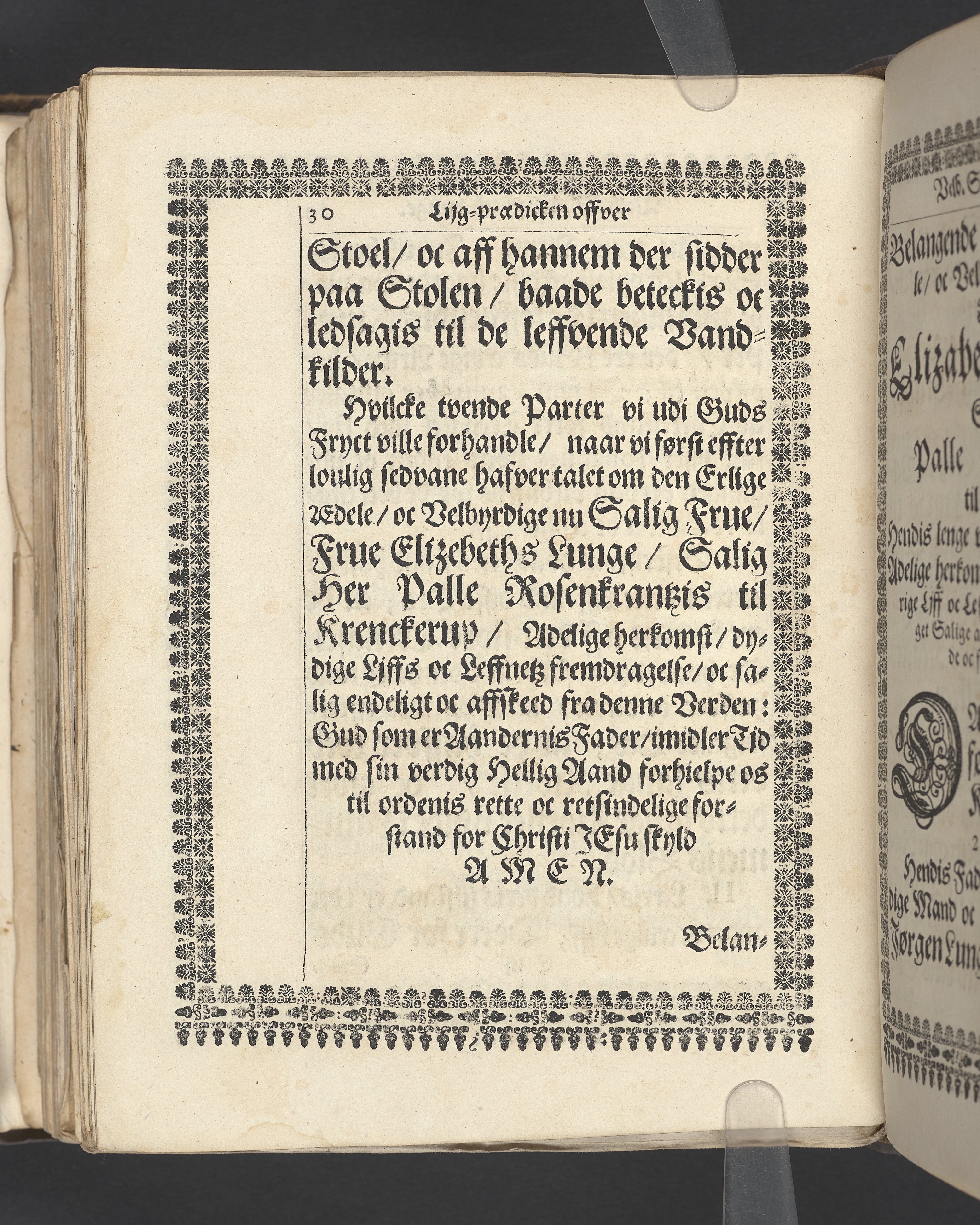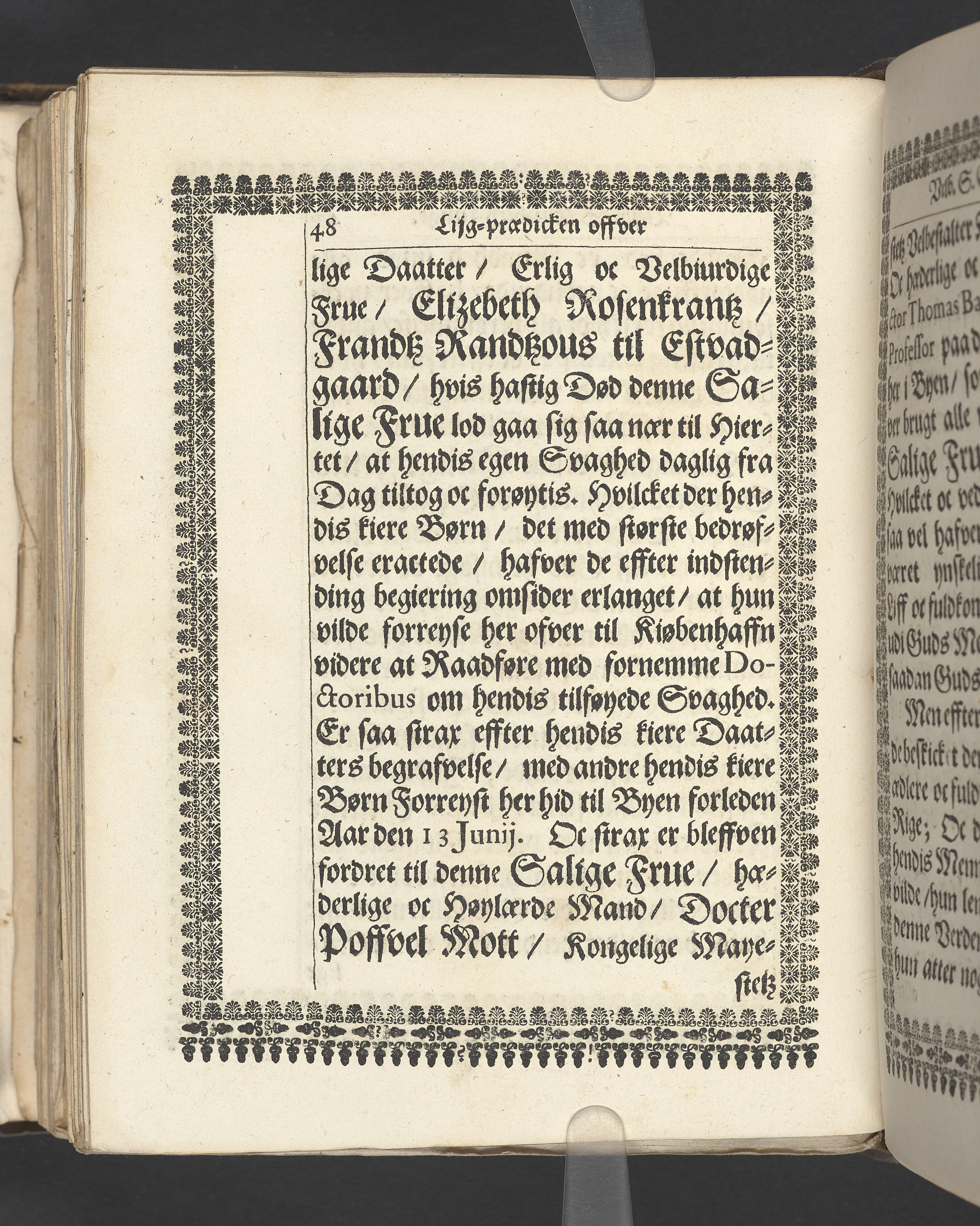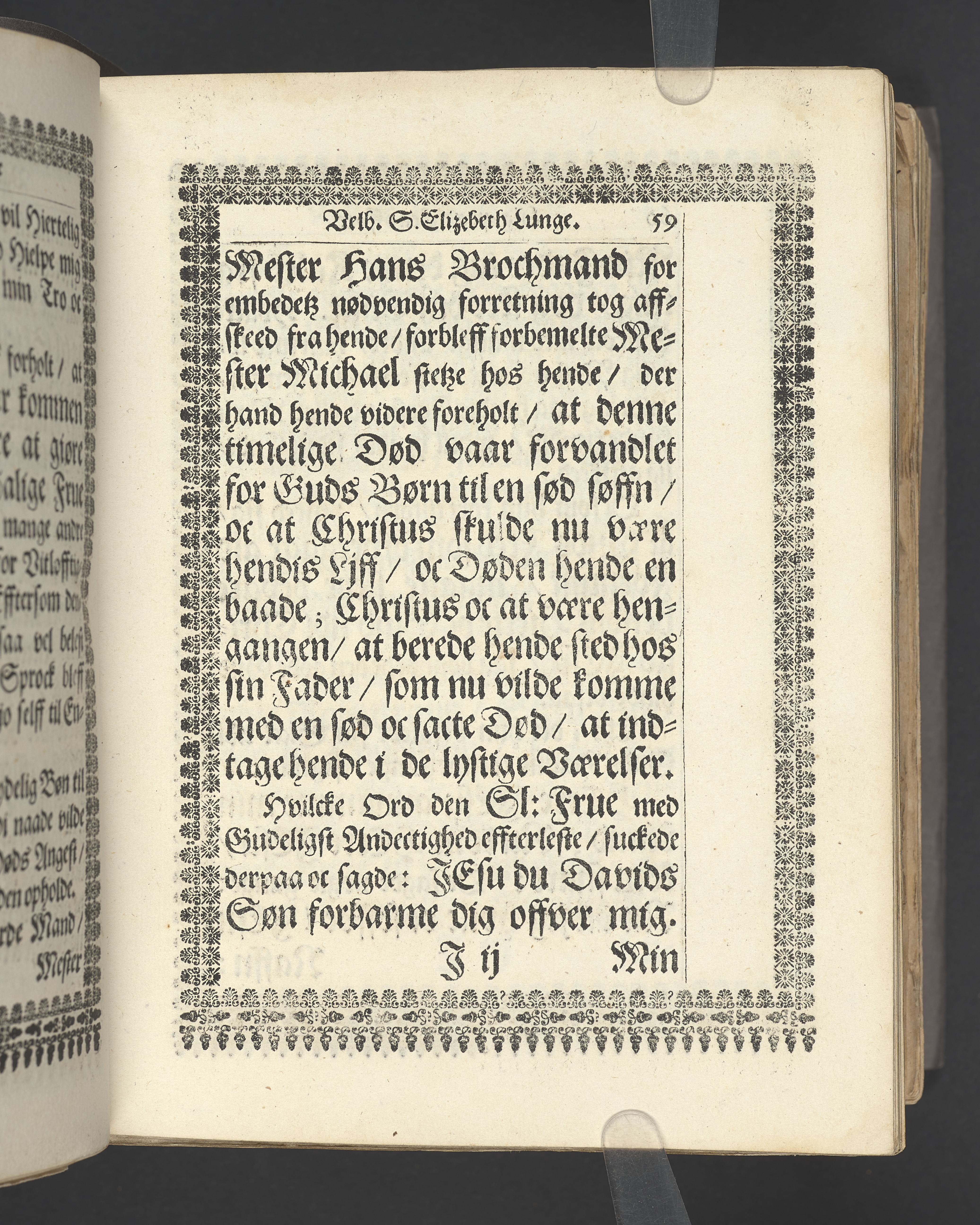 Guds Tempel, vdi hvilcket ere Guds Stoel, Guds Lam, oc Guds Børns herlig oc høytidelig Forsamling. Andragen ... der erlig oc velbiurdig Frue, nu salig frue, Elizebeth Lunge, salig Her Palle Rosenkrantzis til Krenckerup, hendis Liges Begengelse bleff die 14 Aprilis 1659 udi St. Nicolai kircke i Kiøbenhaffn hederligen holdet ... Forklaret aff Johanne Enwaldi Brochmand ... Kiøbenhaffn, tryckt af Hendrick Göde ... 1661.