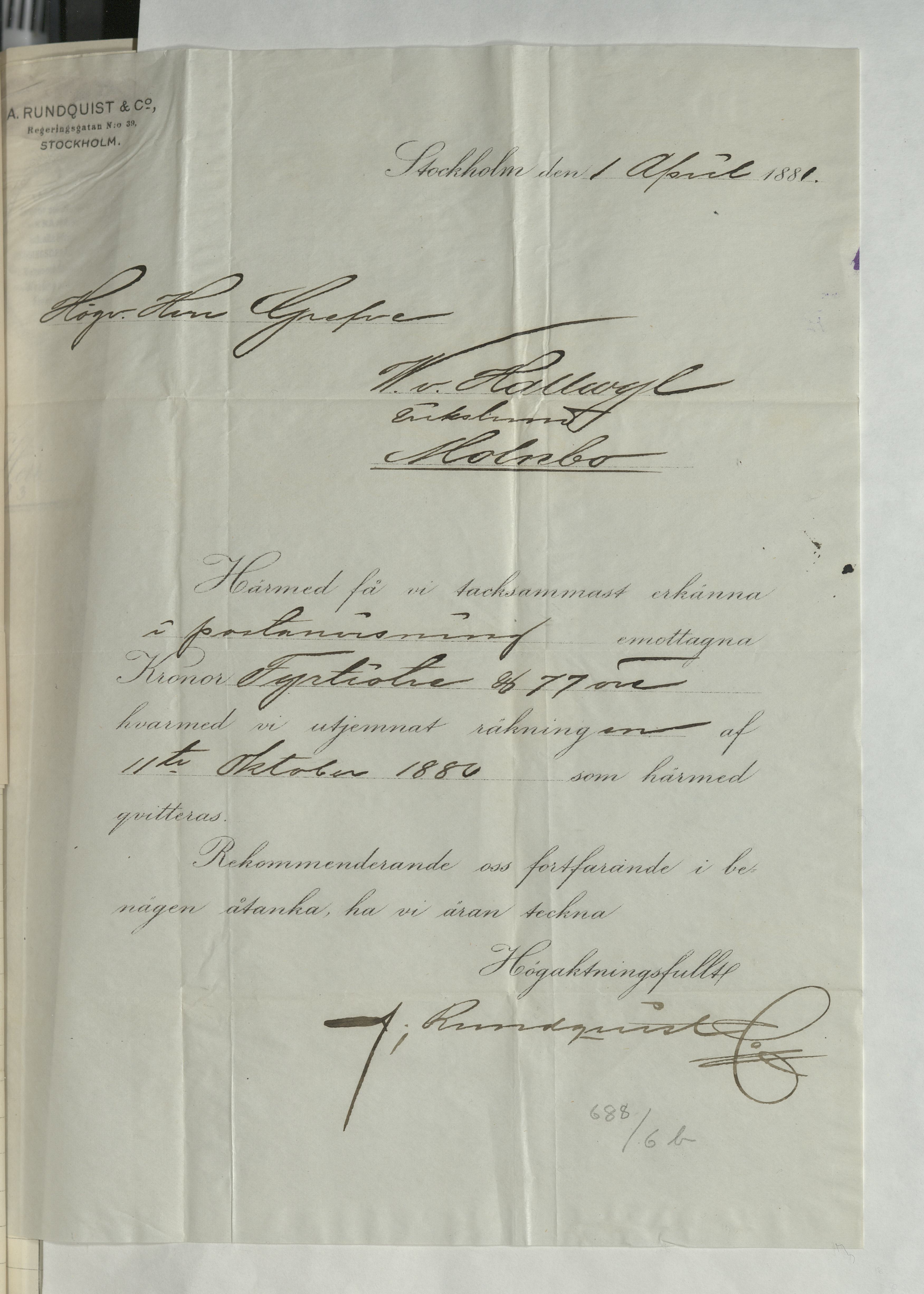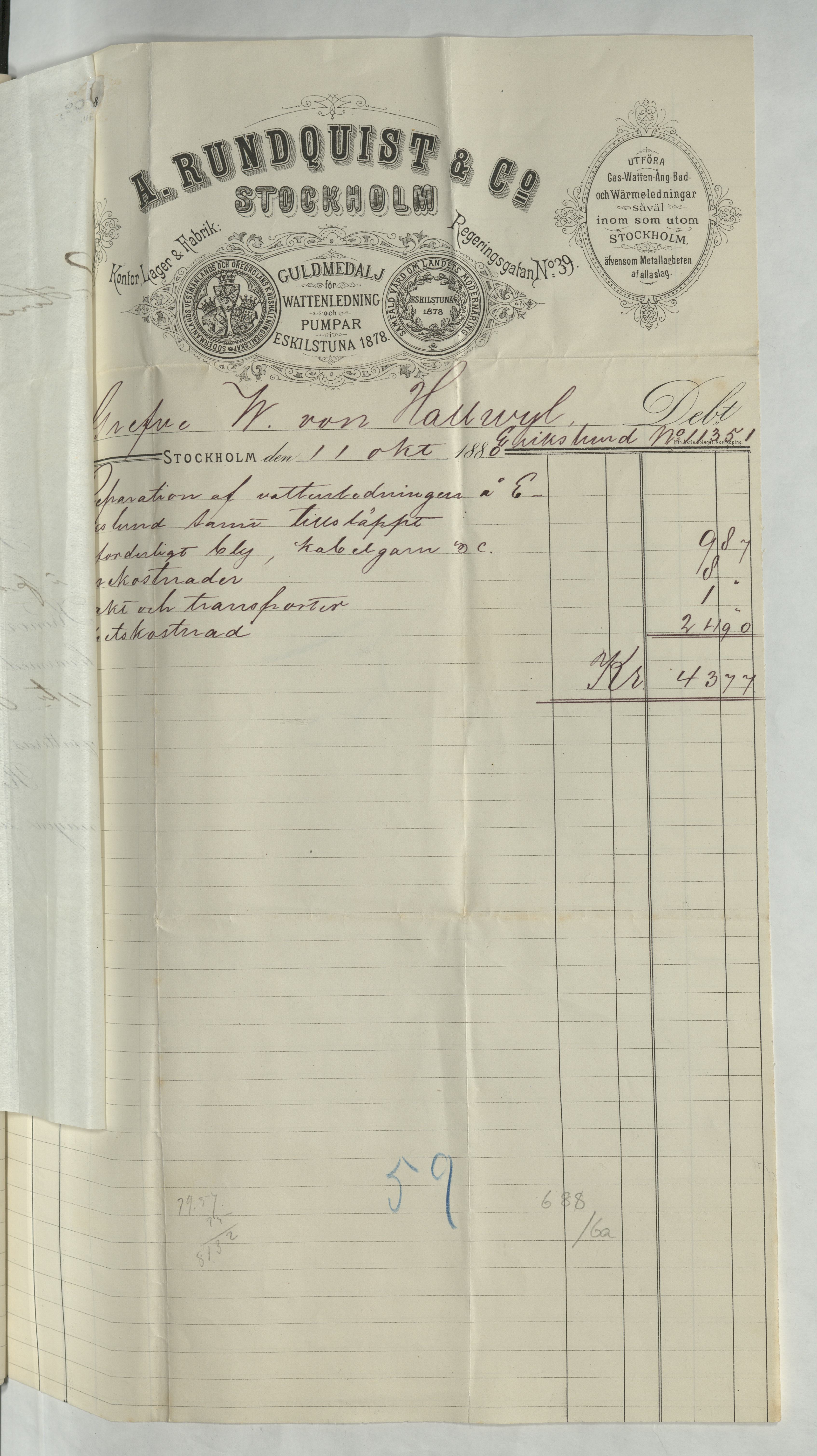 Kvitto från A. Rosberg & Co, ang "rörarbeten", till Greve W. von Hallwyl på Erikslund. Totalsumma 43:77Kr. Stockholm 11 oktober 1888.