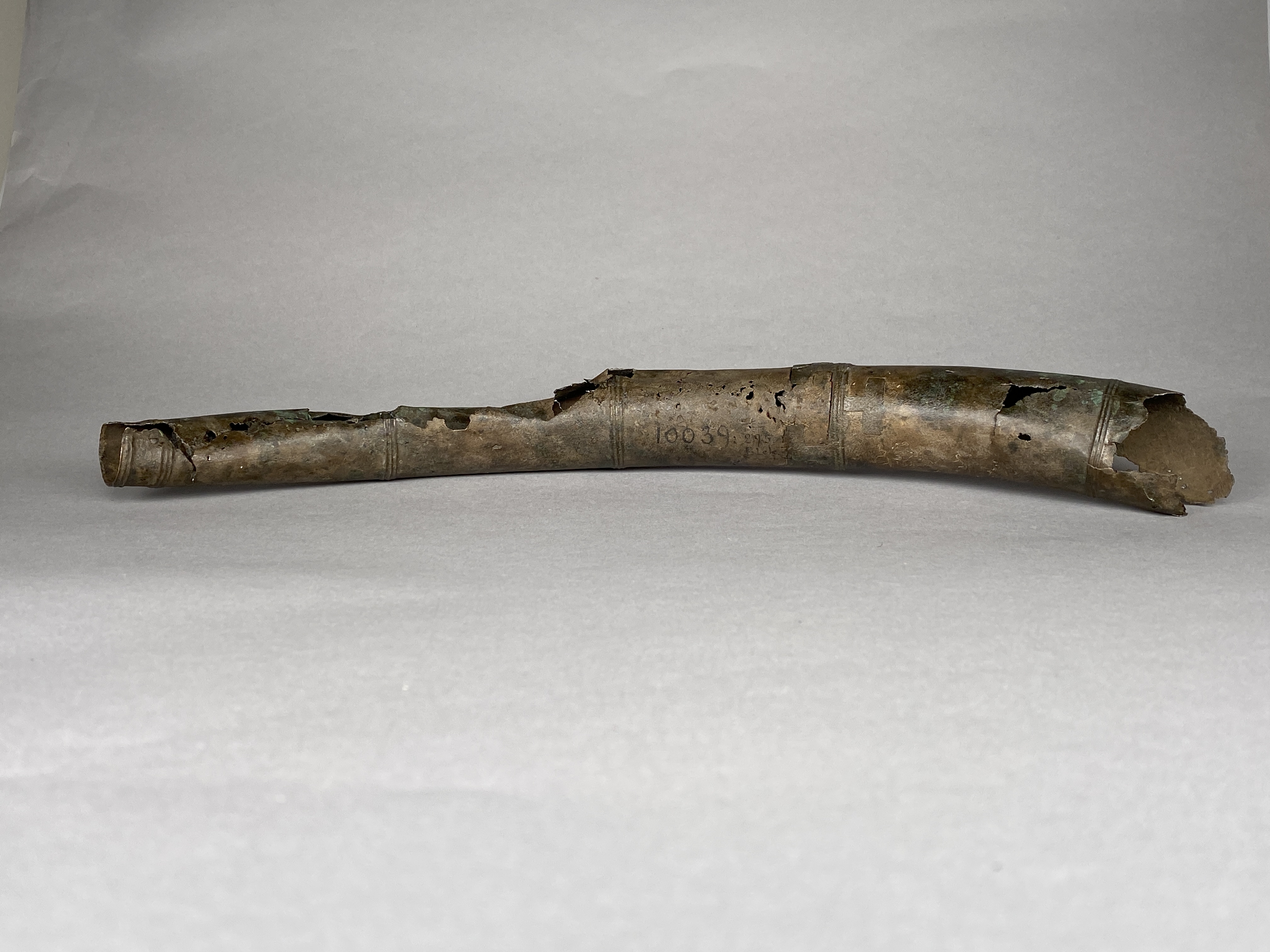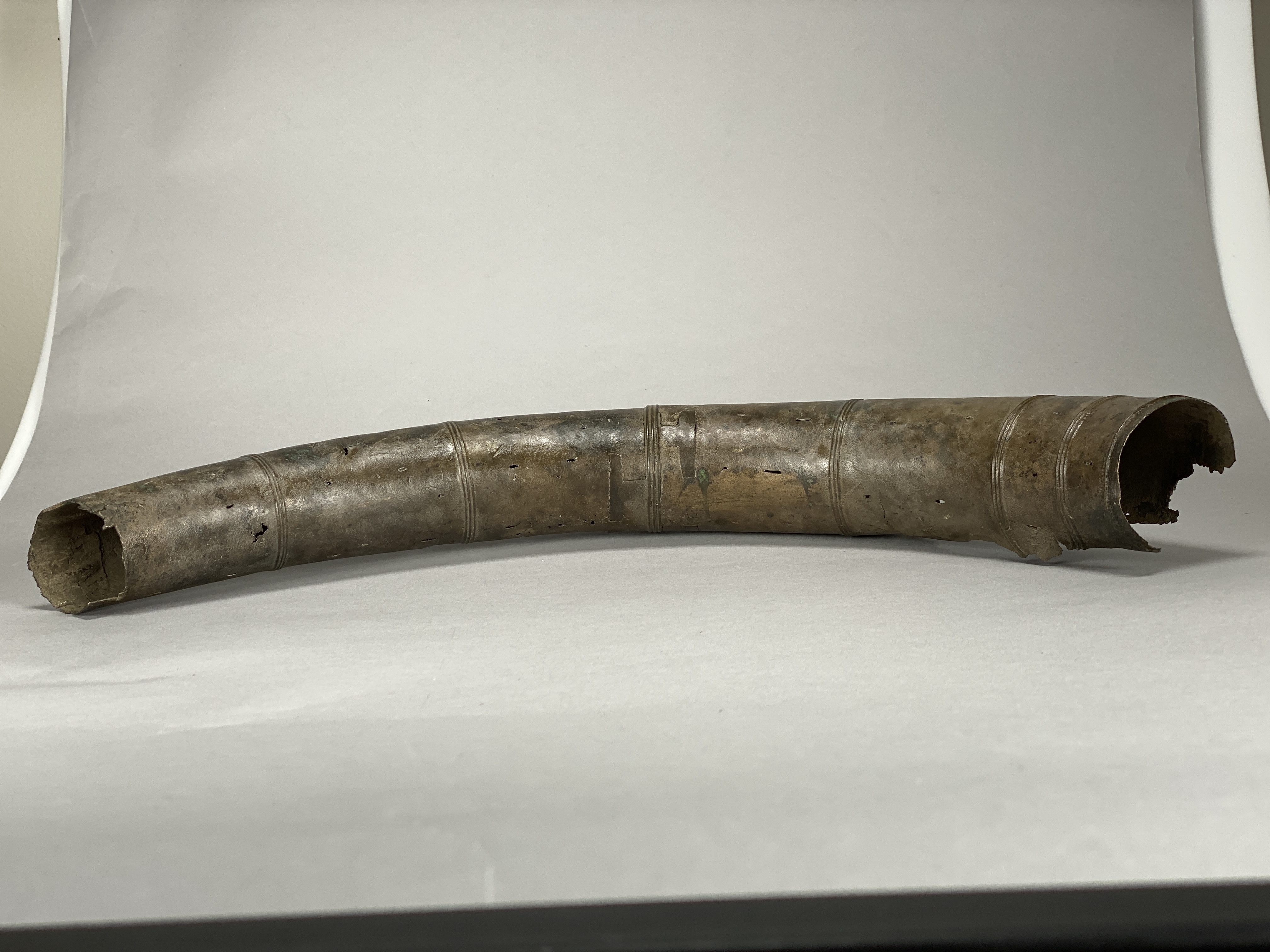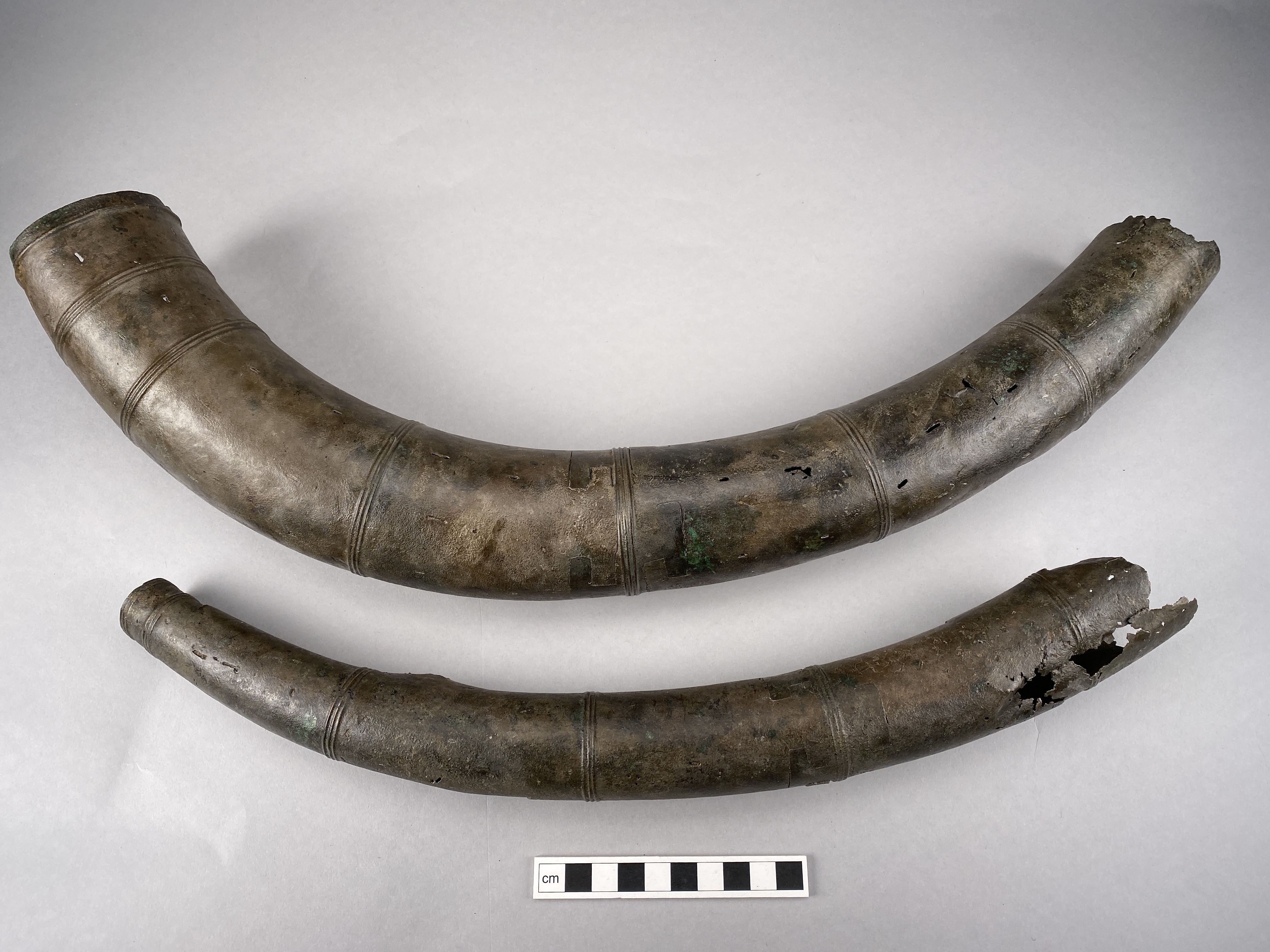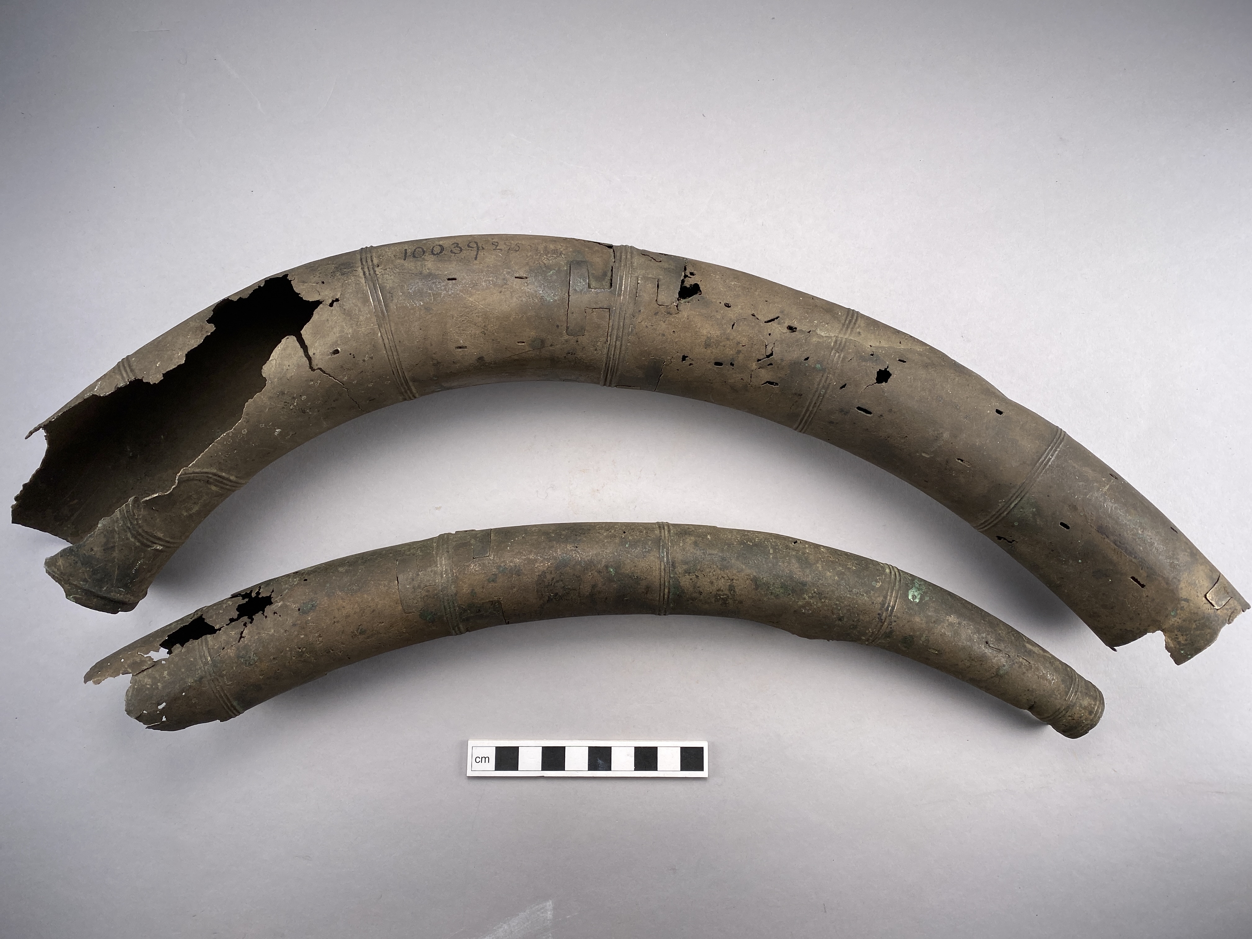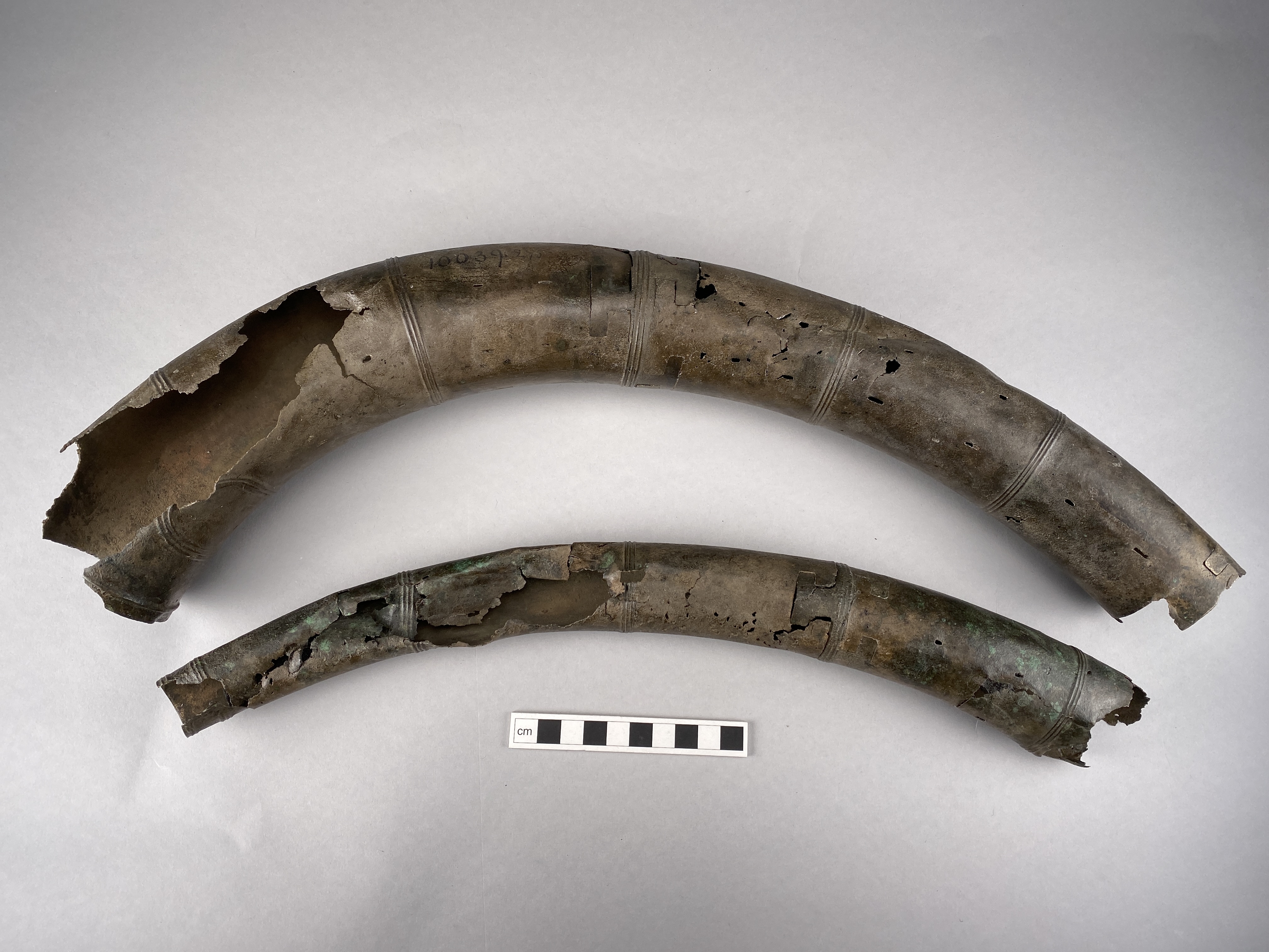Två större stycken av en bronslur. Dekor av tvärgående smala vulster, tre stycken, som återkommer på ca 8-10 cm avstånd. På den smalaste änden sitter vulsterna närmare. På den bredaste änden har två trippelvulster kombinerats med tungformiga avslutningar. Båda fragmenten har omfattande äldre skador. Det större fragmentet är hoplaskat med T-formiga laskar. Detta större fragment har också rester av ytterligare en laskning i den smala änden. De olika delarna i fragmentet har varit ca 25 cm långa. Den breda änden avslutas med en rak kant. Även det kortare fragmentet har hoplaskats ca 27 cm från den smala änden. Dess bredare ände är förstörd. På bägge fragmenten finns ovala hål i rader, hålen är 2-6 mm långa. Hålen kan vara rester av gjutstöd.