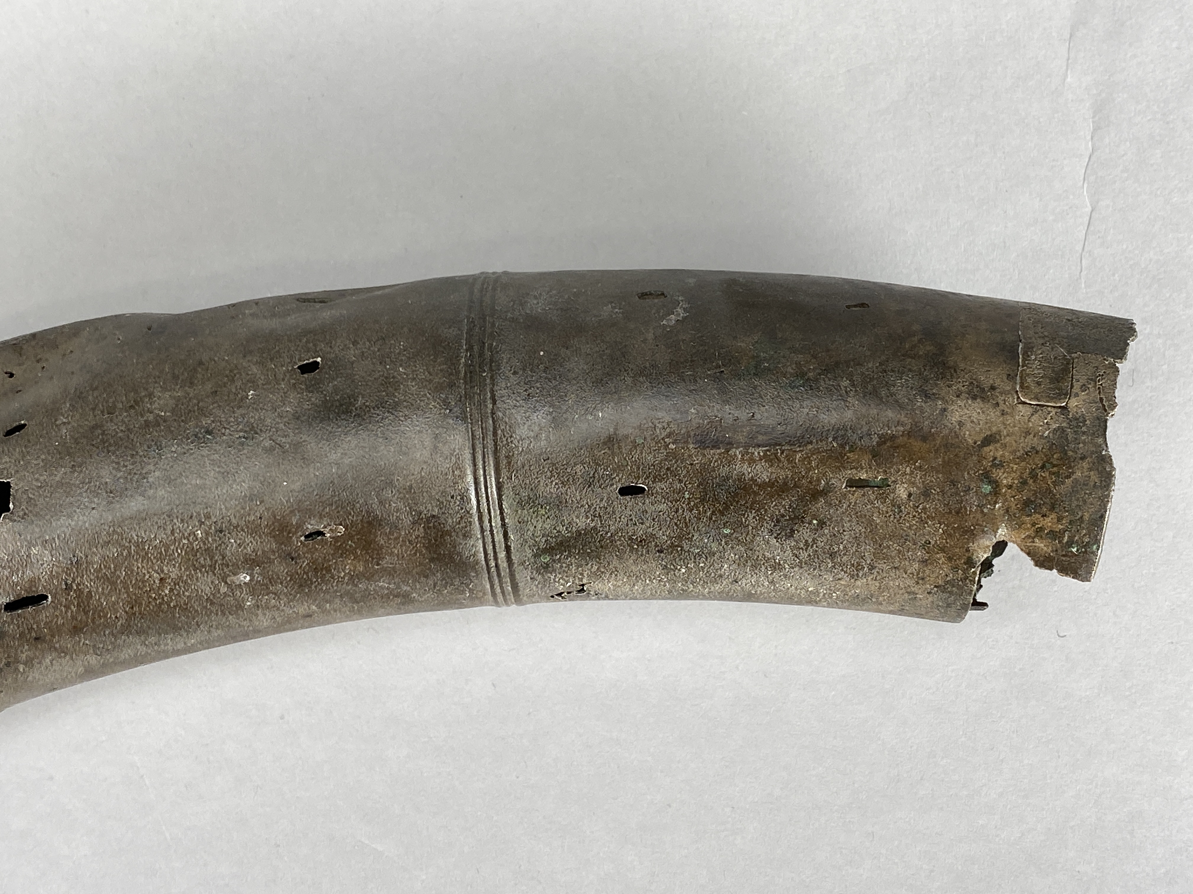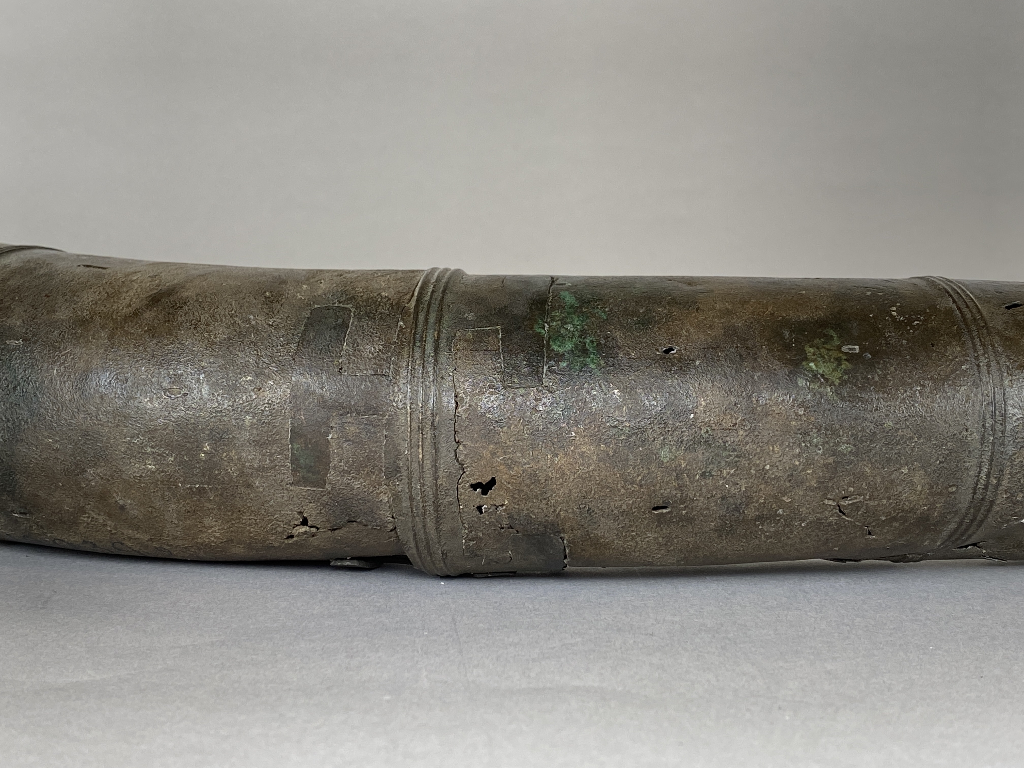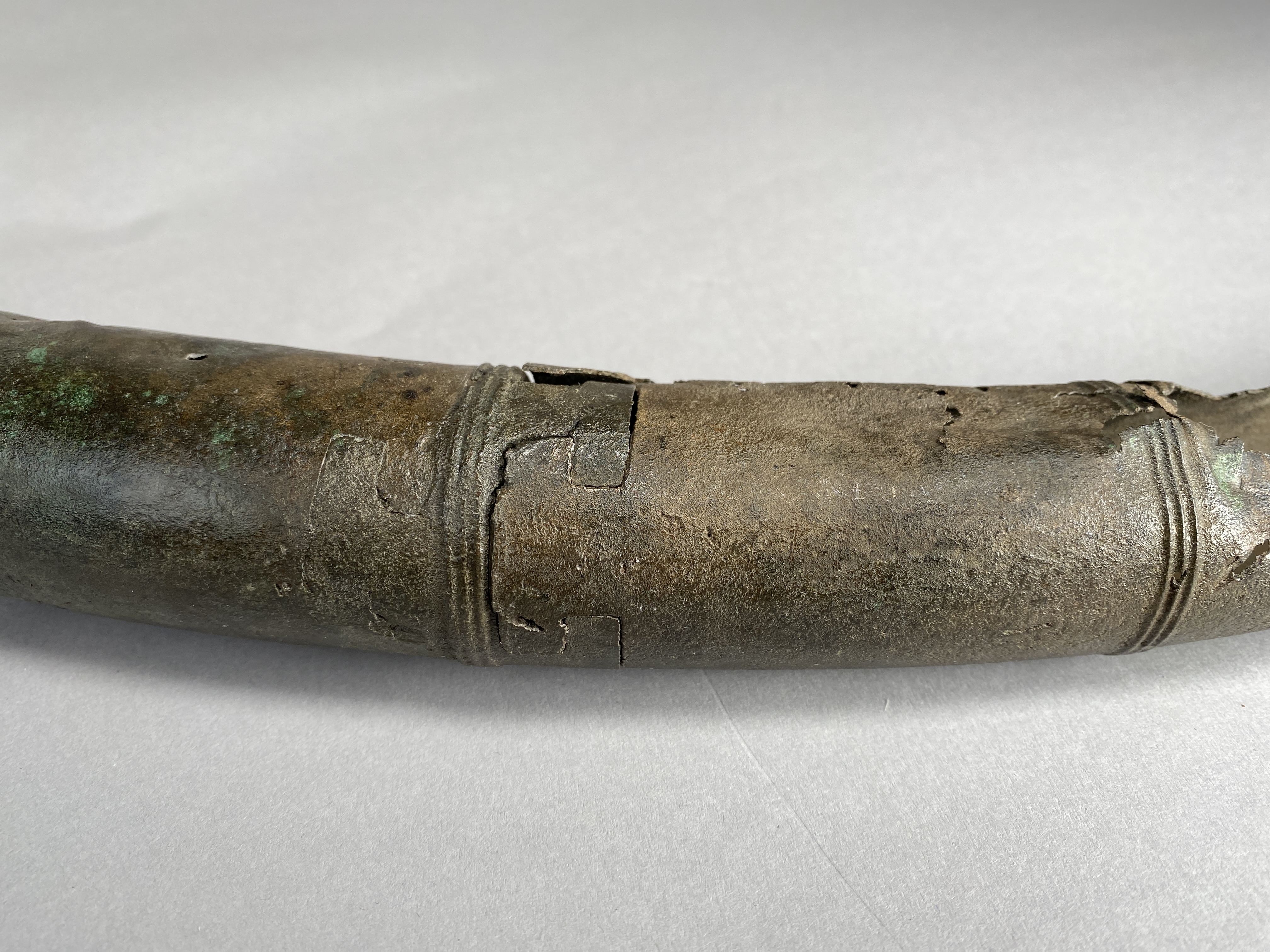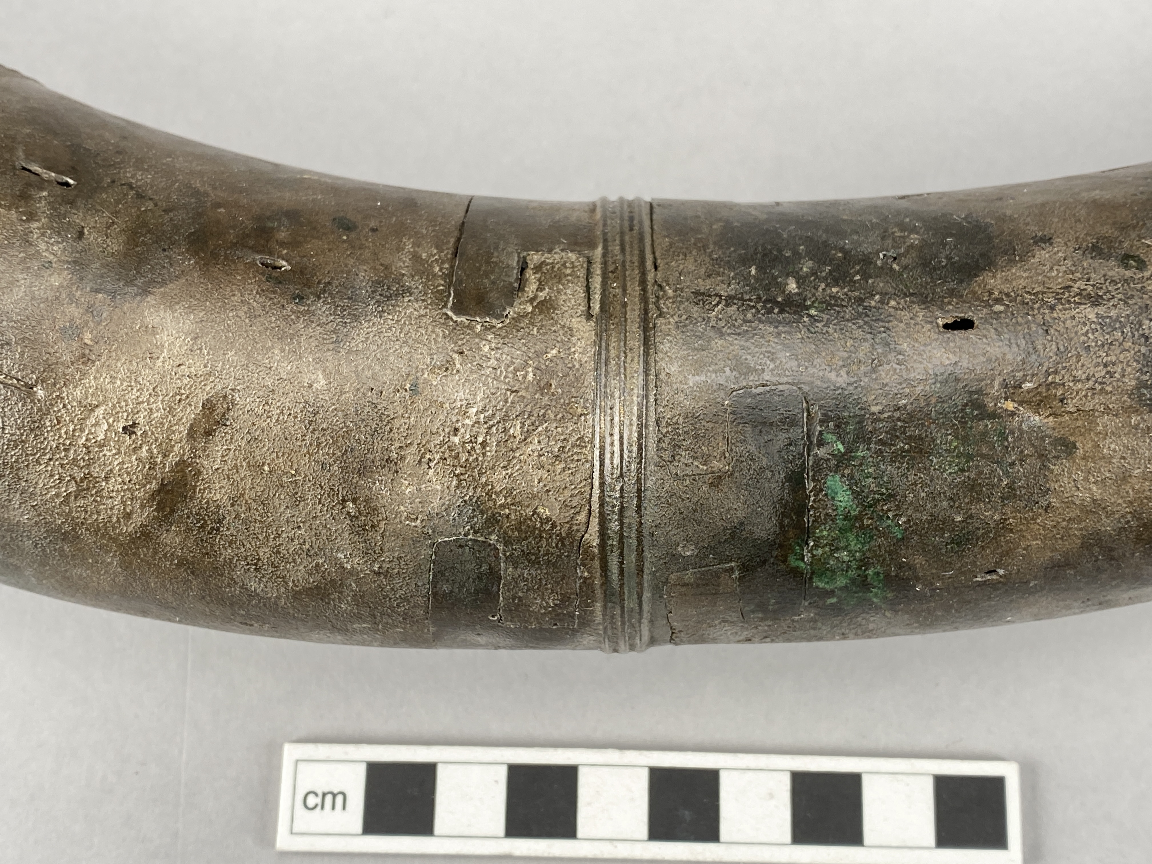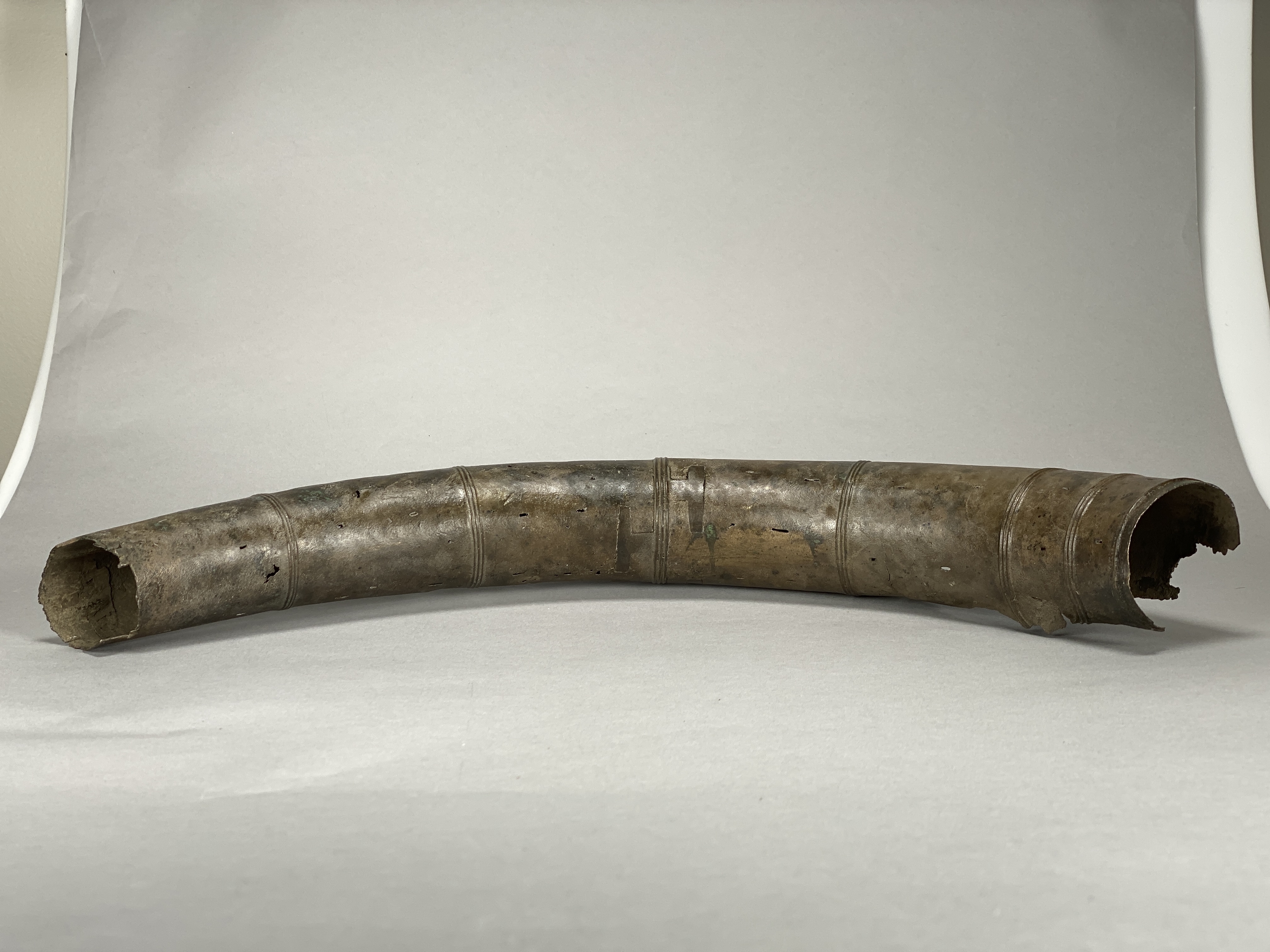 Två större stycken av en bronslur. Dekor av tvärgående smala vulster, tre stycken, som återkommer på ca 8-10 cm avstånd. På den smalaste änden sitter vulsterna närmare. På den bredaste änden har två trippelvulster kombinerats med tungformiga avslutningar. Båda fragmenten har omfattande äldre skador. Det större fragmentet är hoplaskat med T-formiga laskar. Detta större fragment har också rester av ytterligare en laskning i den smala änden. De olika delarna i fragmentet har varit ca 25 cm långa. Den breda änden avslutas med en rak kant. Även det kortare fragmentet har hoplaskats ca 27 cm från den smala änden. Dess bredare ände är förstörd. På bägge fragmenten finns ovala hål i rader, hålen är 2-6 mm långa. Hålen kan vara rester av gjutstöd.