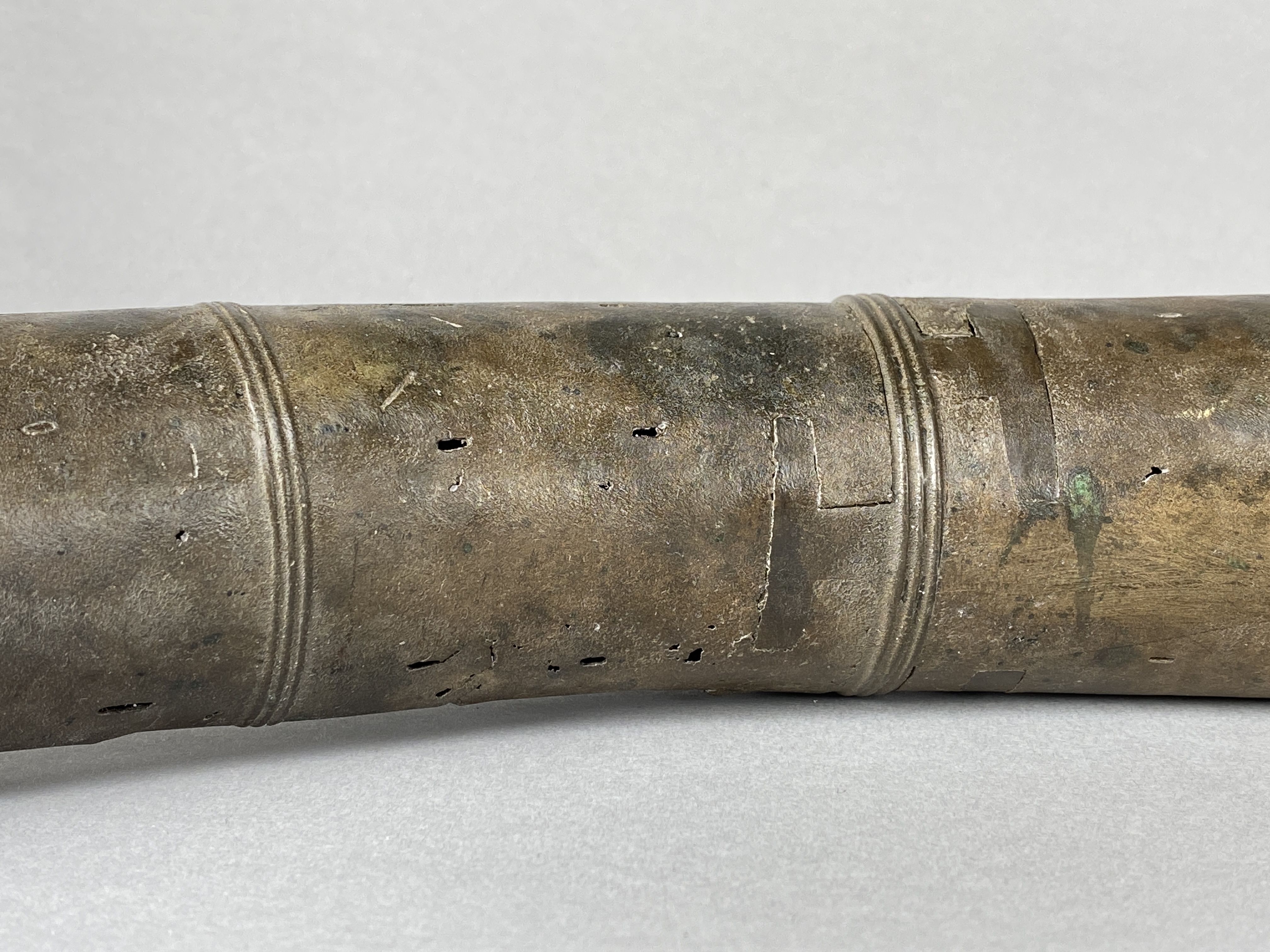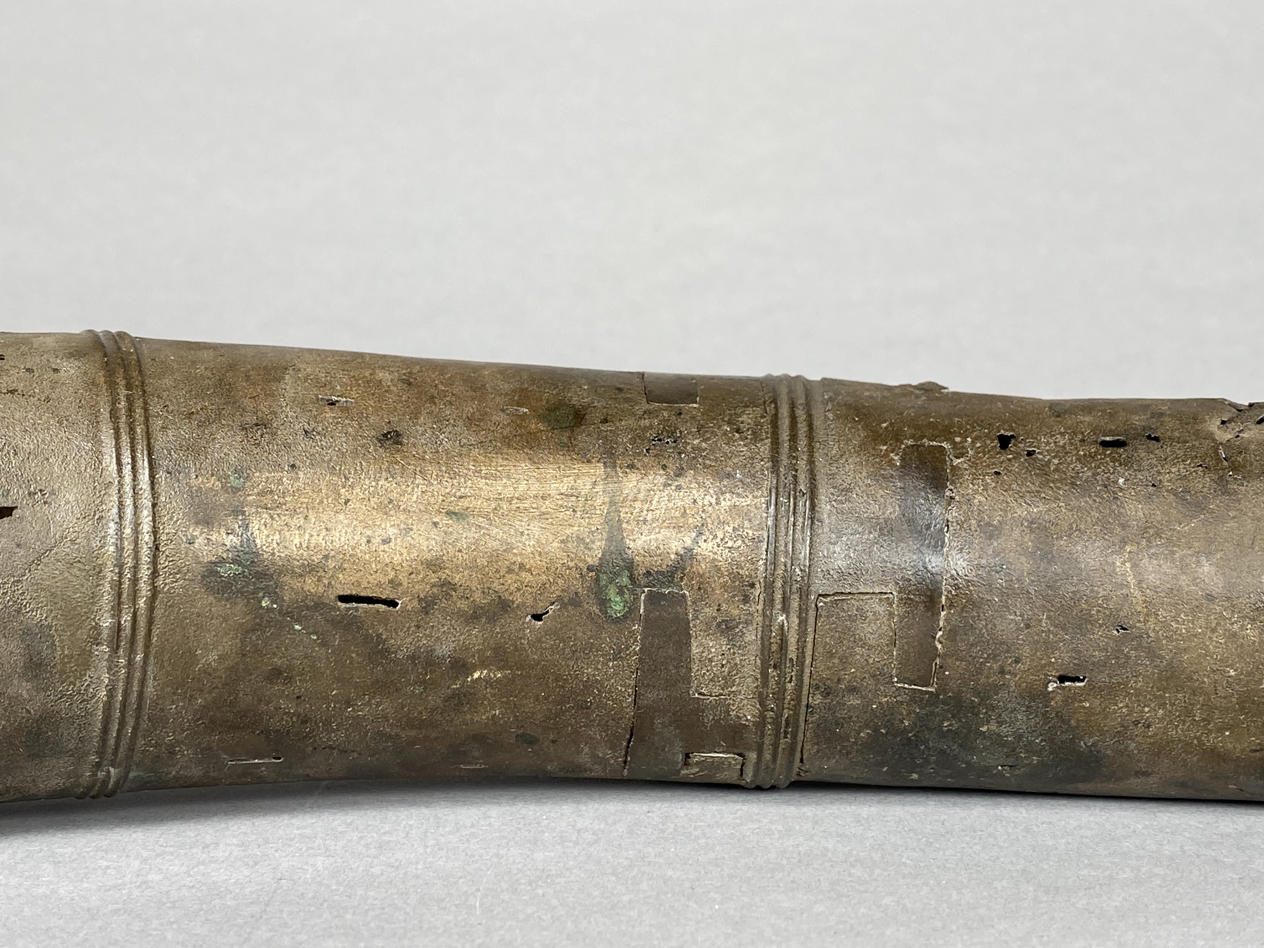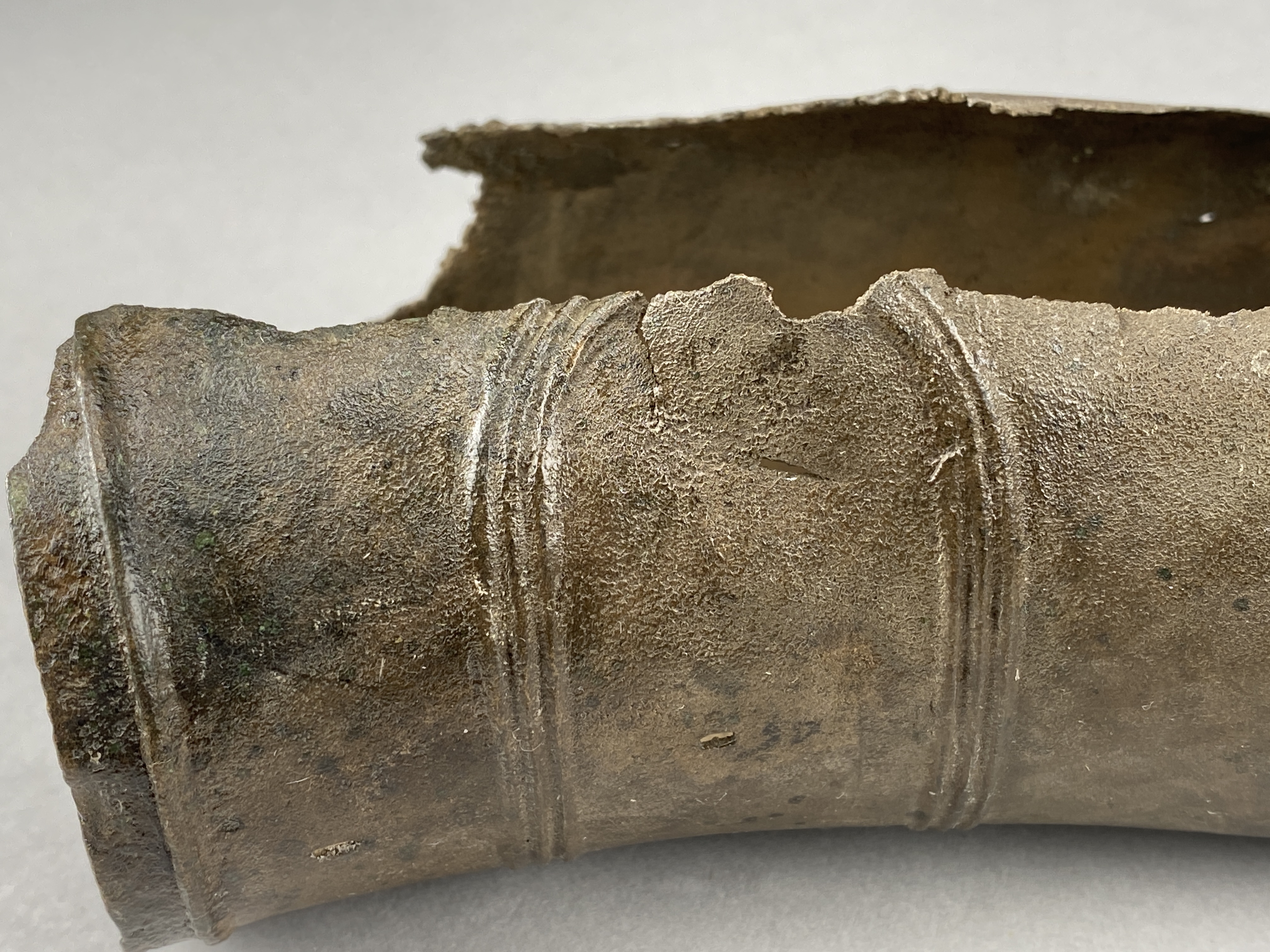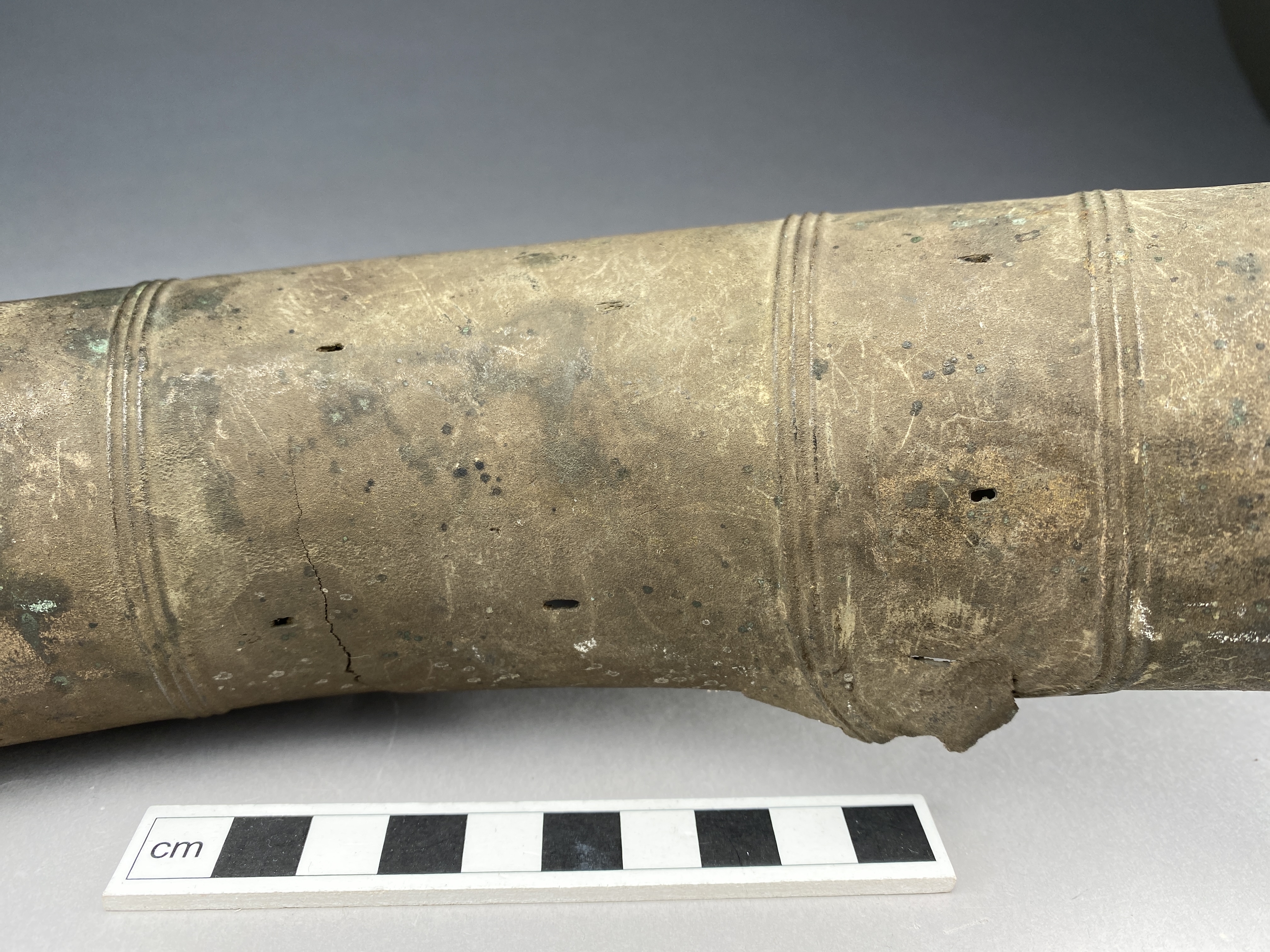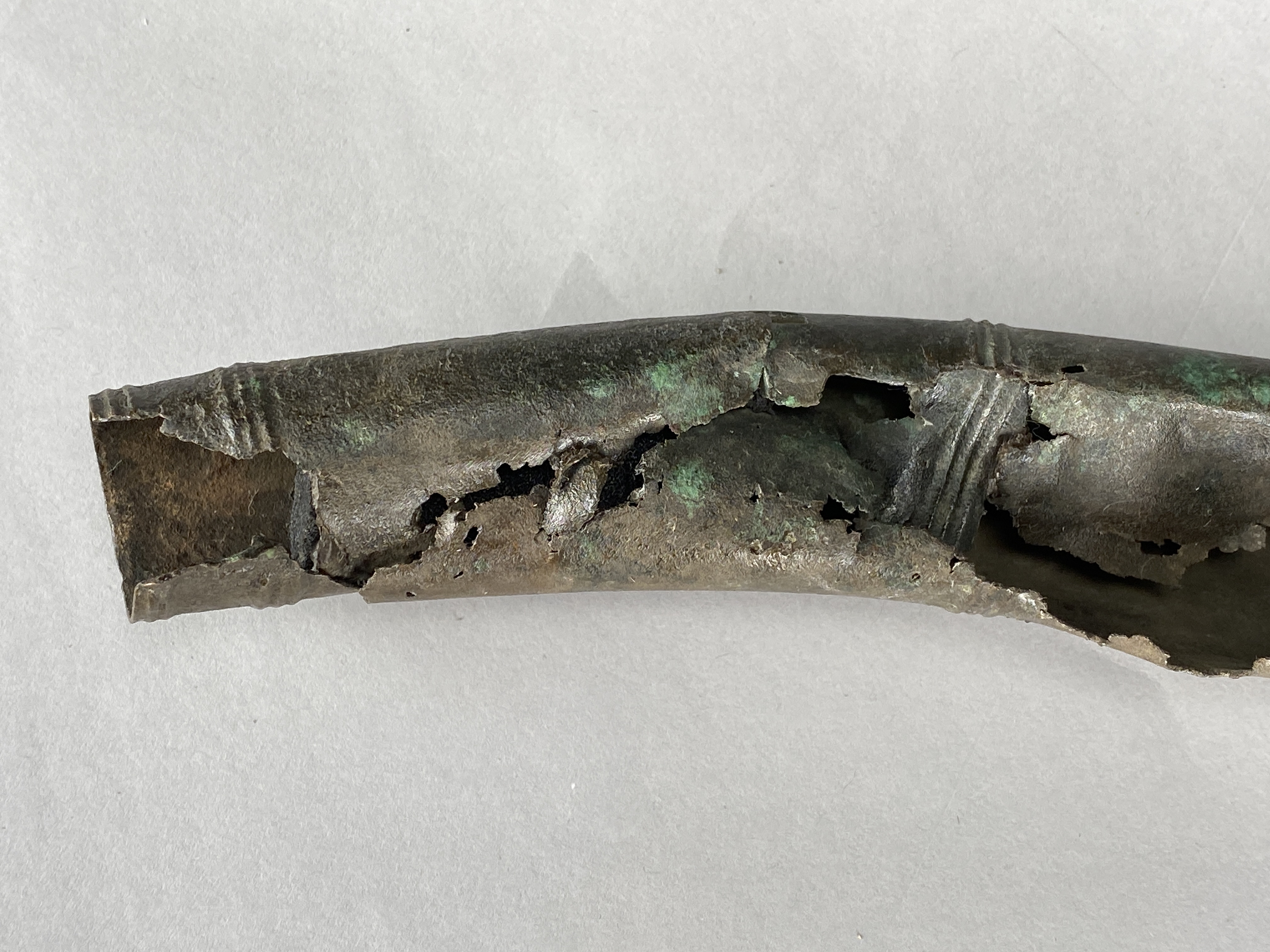 Två större stycken av en bronslur. Dekor av tvärgående smala vulster, tre stycken, som återkommer på ca 8-10 cm avstånd. På den smalaste änden sitter vulsterna närmare. På den bredaste änden har två trippelvulster kombinerats med tungformiga avslutningar. Båda fragmenten har omfattande äldre skador. Det större fragmentet är hoplaskat med T-formiga laskar. Detta större fragment har också rester av ytterligare en laskning i den smala änden. De olika delarna i fragmentet har varit ca 25 cm långa. Den breda änden avslutas med en rak kant. Även det kortare fragmentet har hoplaskats ca 27 cm från den smala änden. Dess bredare ände är förstörd. På bägge fragmenten finns ovala hål i rader, hålen är 2-6 mm långa. Hålen kan vara rester av gjutstöd.