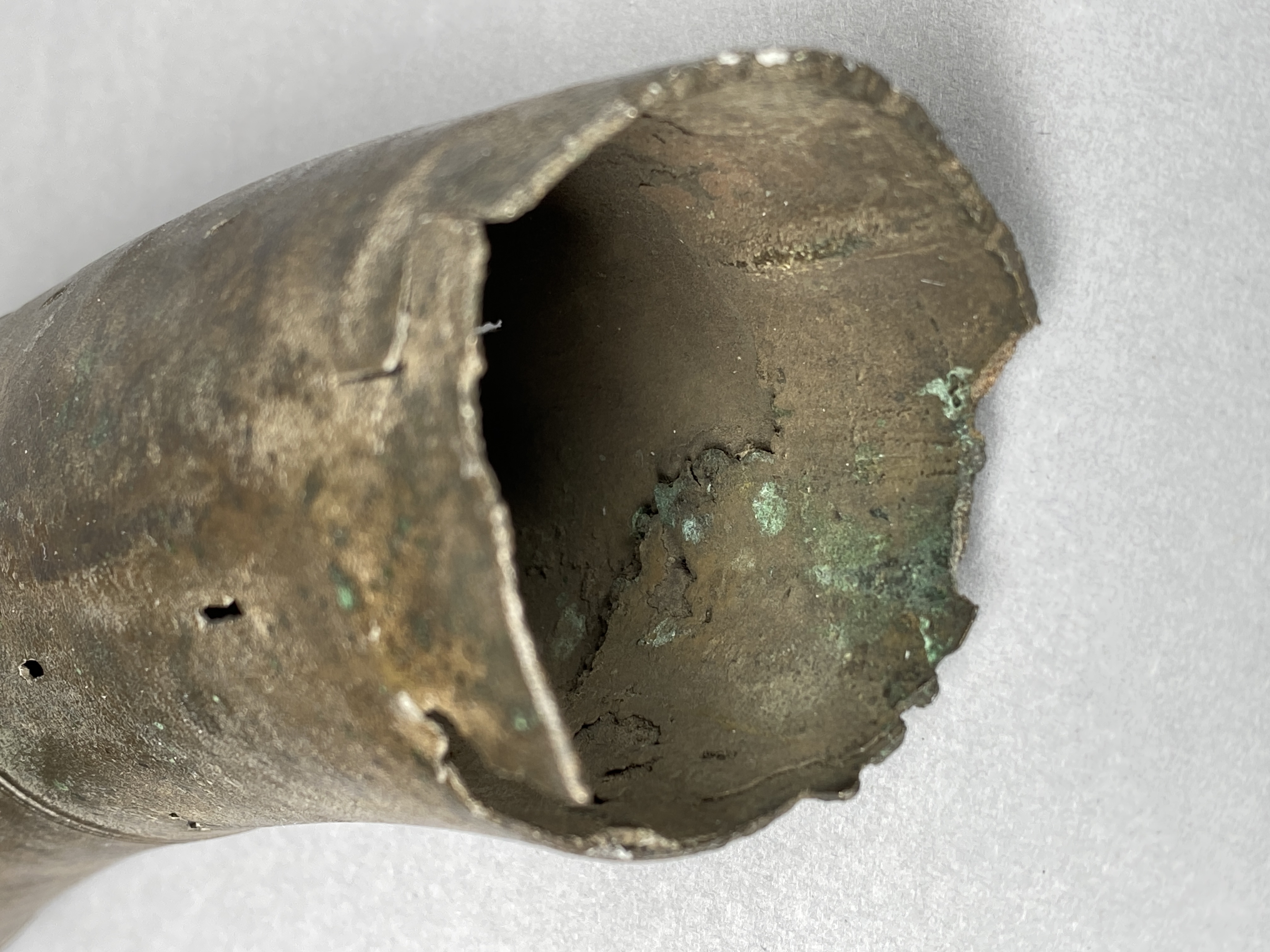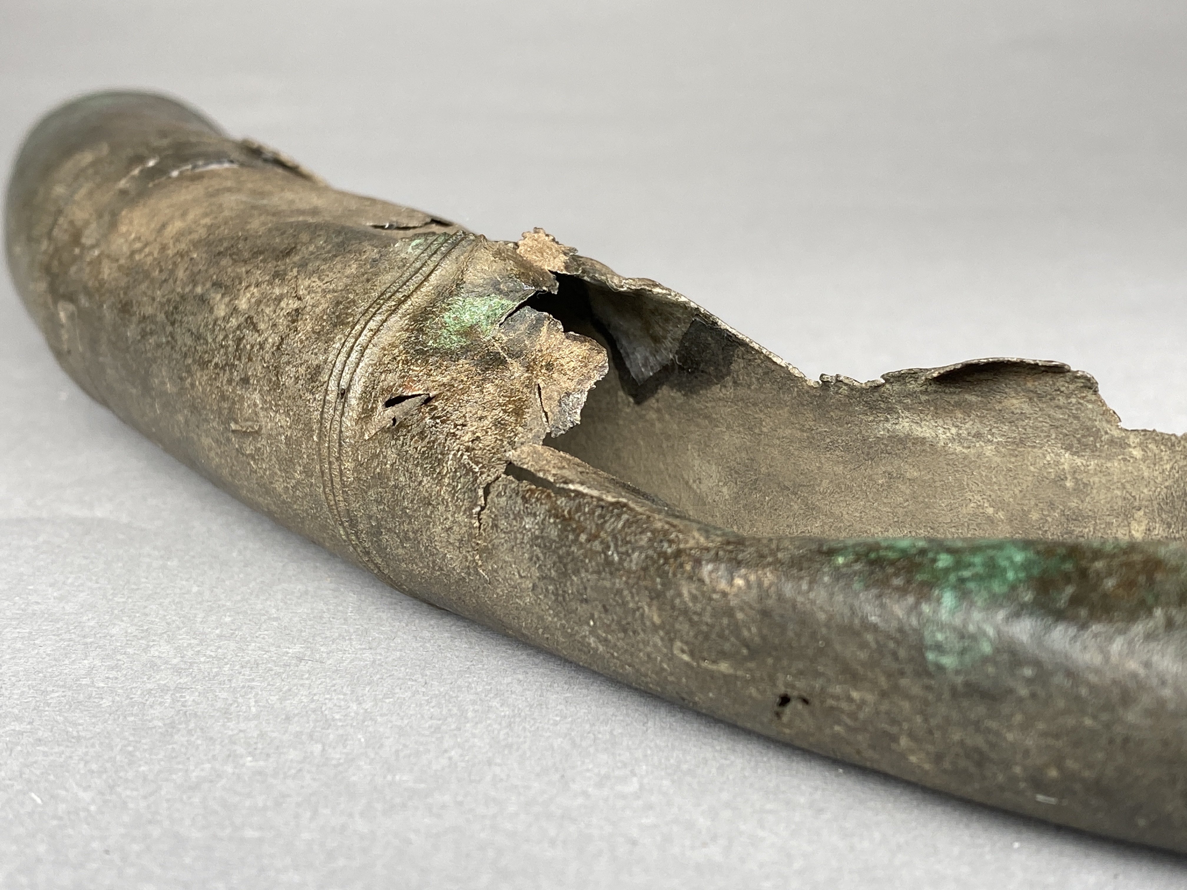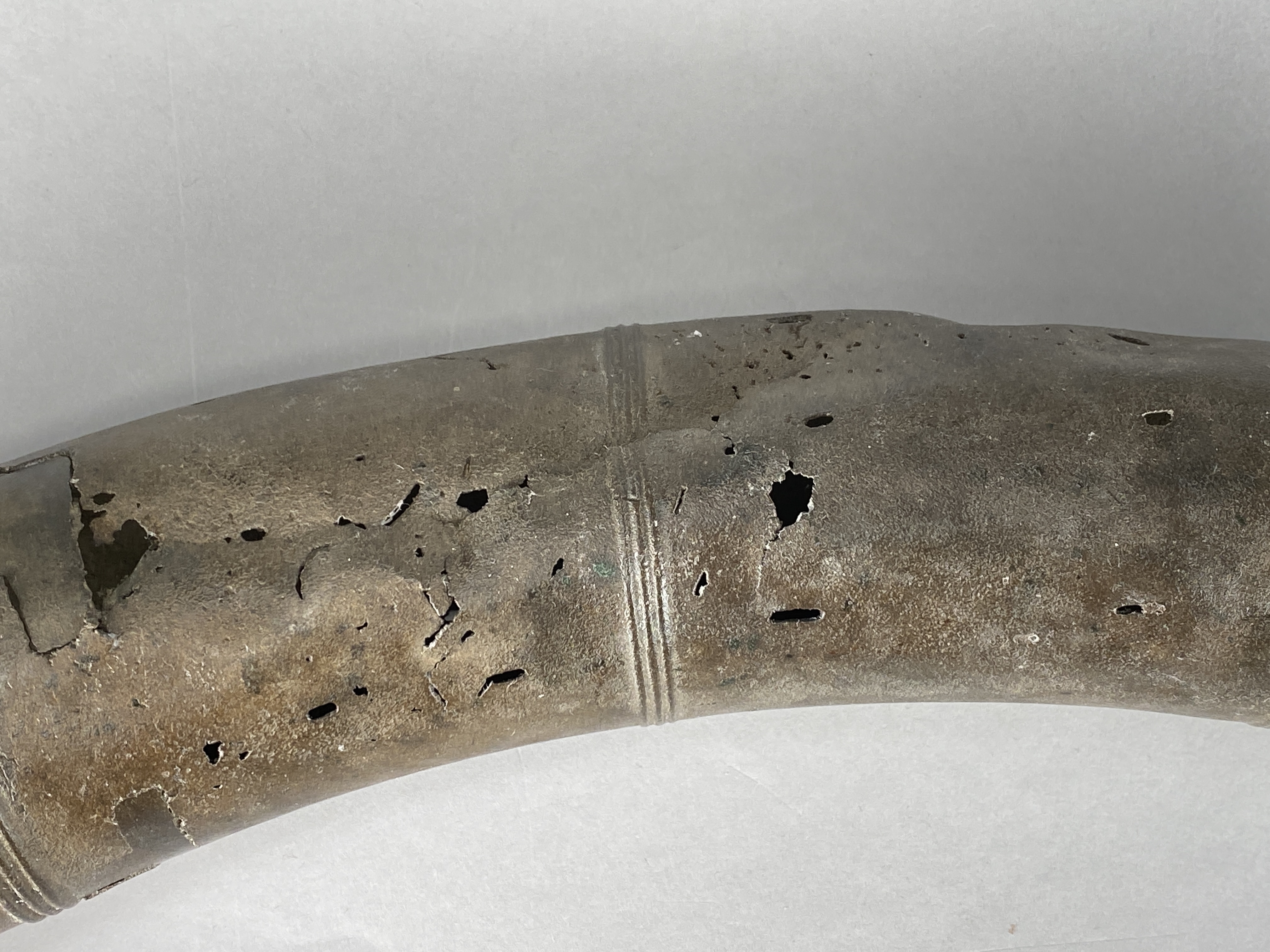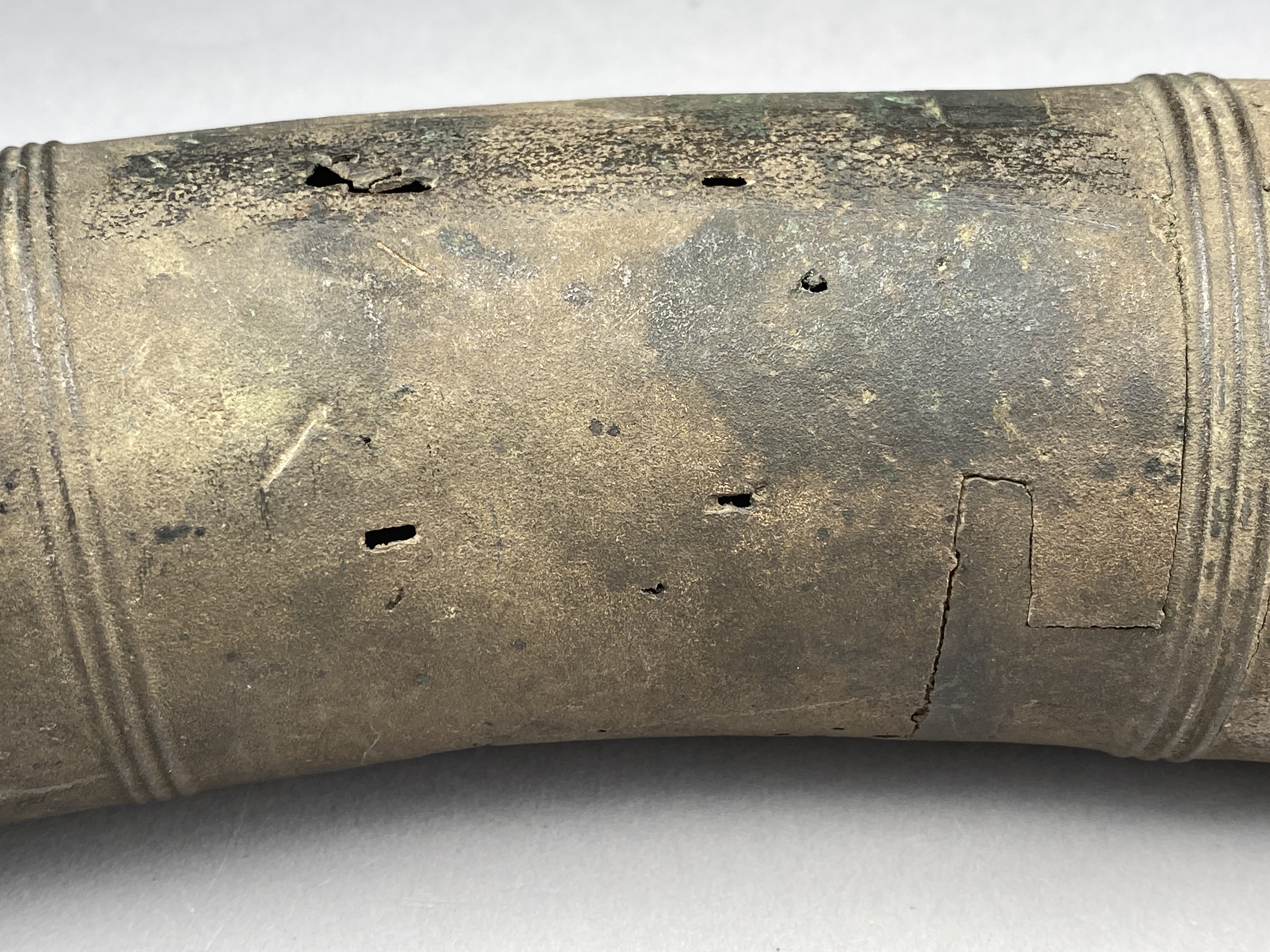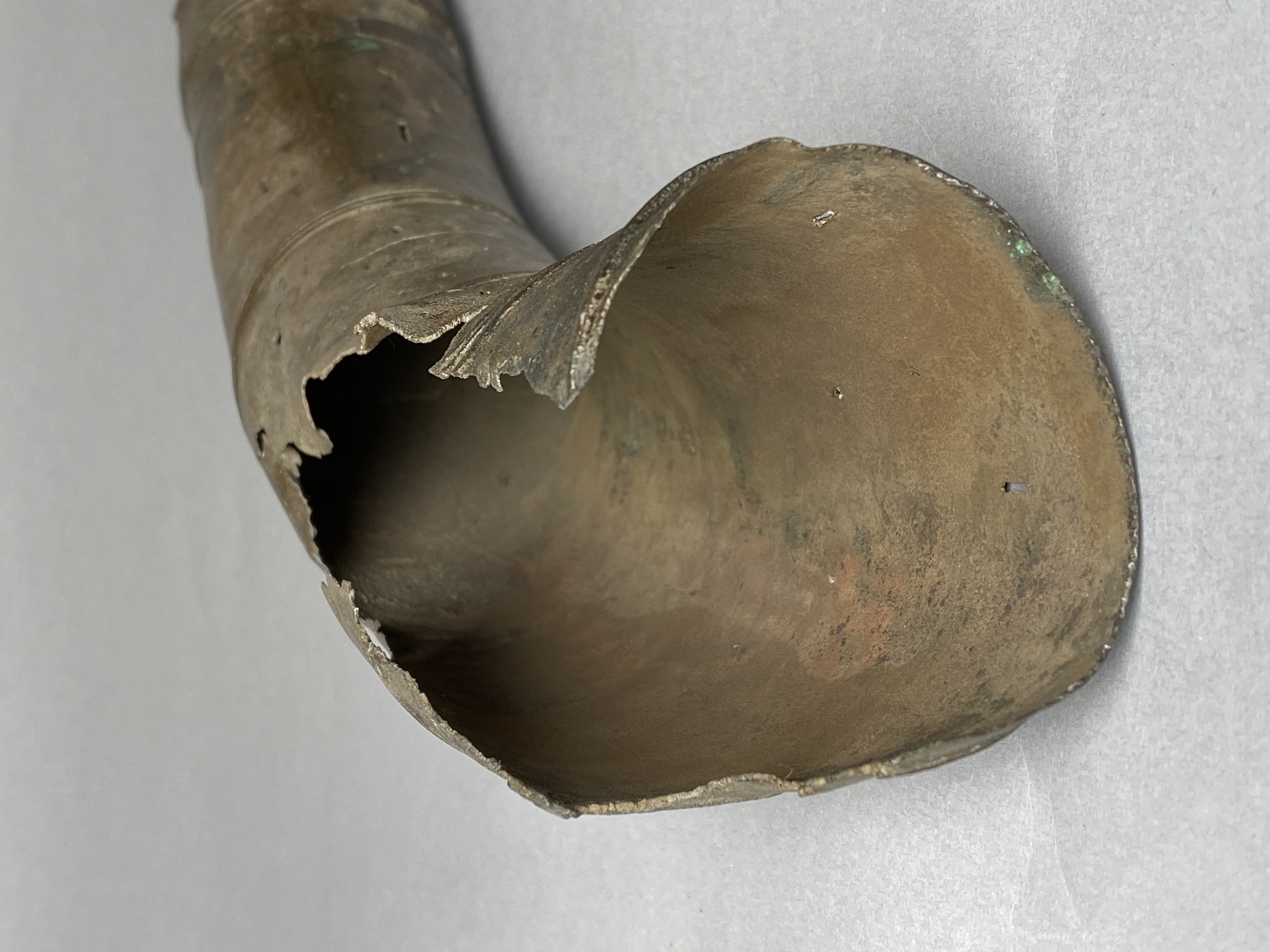 Två större stycken av en bronslur. Dekor av tvärgående smala vulster, tre stycken, som återkommer på ca 8-10 cm avstånd. På den smalaste änden sitter vulsterna närmare. På den bredaste änden har två trippelvulster kombinerats med tungformiga avslutningar. Båda fragmenten har omfattande äldre skador. Det större fragmentet är hoplaskat med T-formiga laskar. Detta större fragment har också rester av ytterligare en laskning i den smala änden. De olika delarna i fragmentet har varit ca 25 cm långa. Den breda änden avslutas med en rak kant. Även det kortare fragmentet har hoplaskats ca 27 cm från den smala änden. Dess bredare ände är förstörd. På bägge fragmenten finns ovala hål i rader, hålen är 2-6 mm långa. Hålen kan vara rester av gjutstöd.