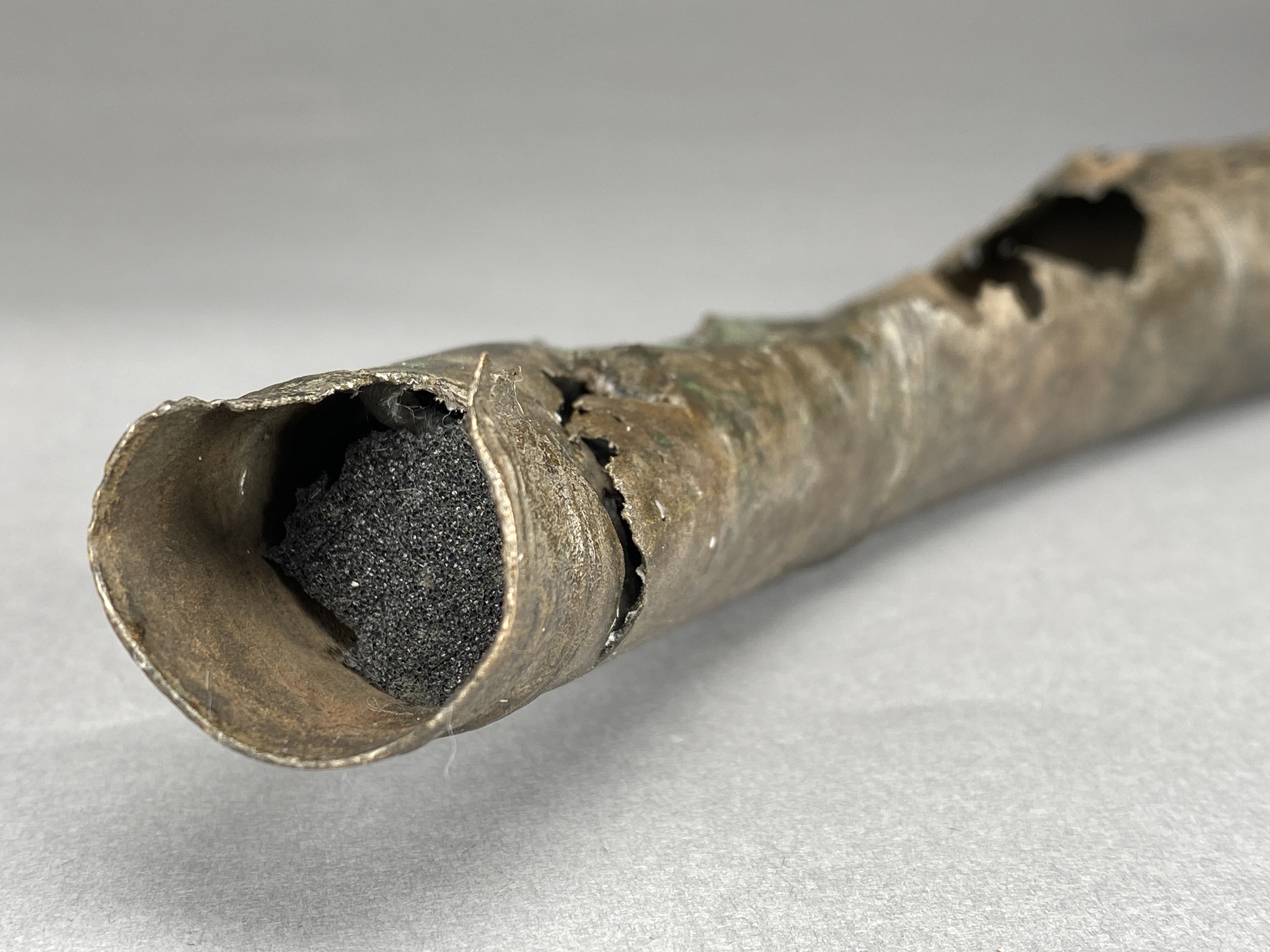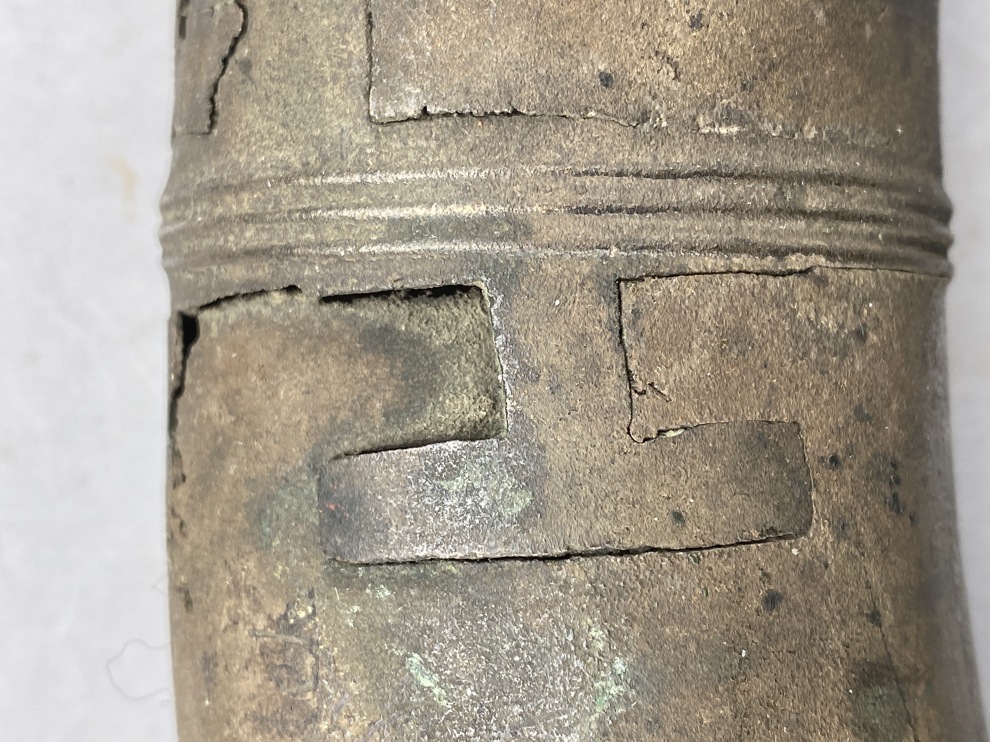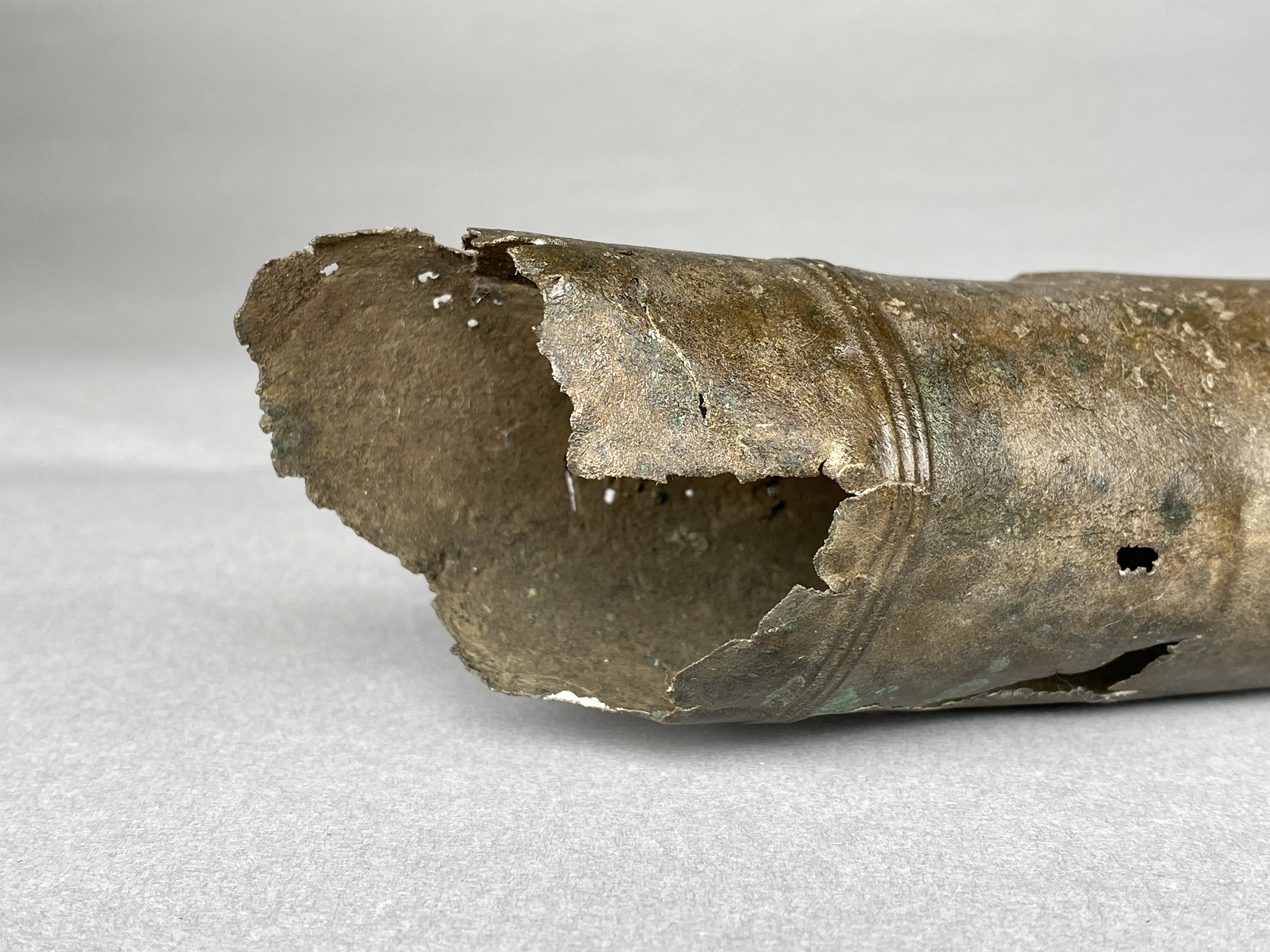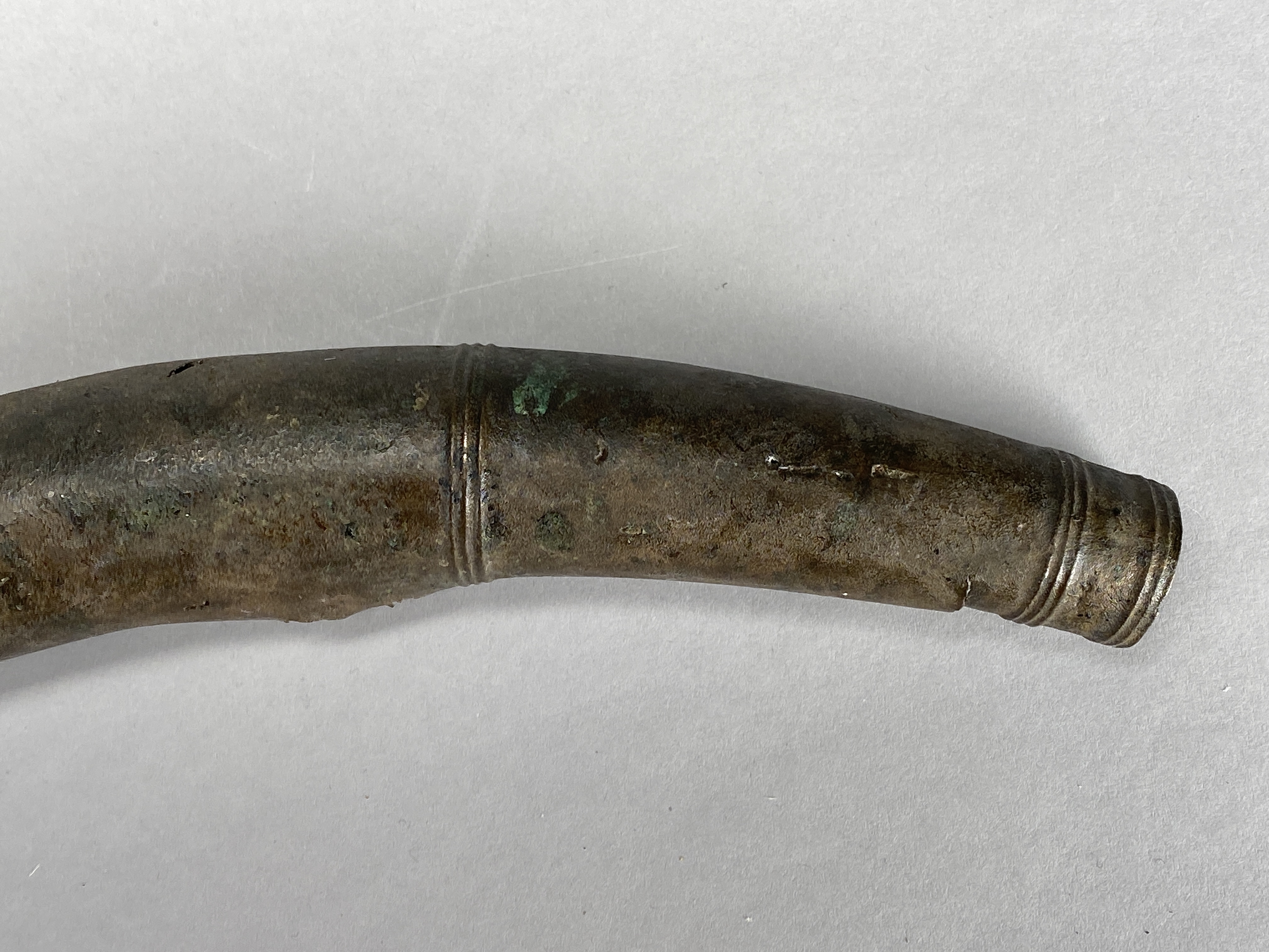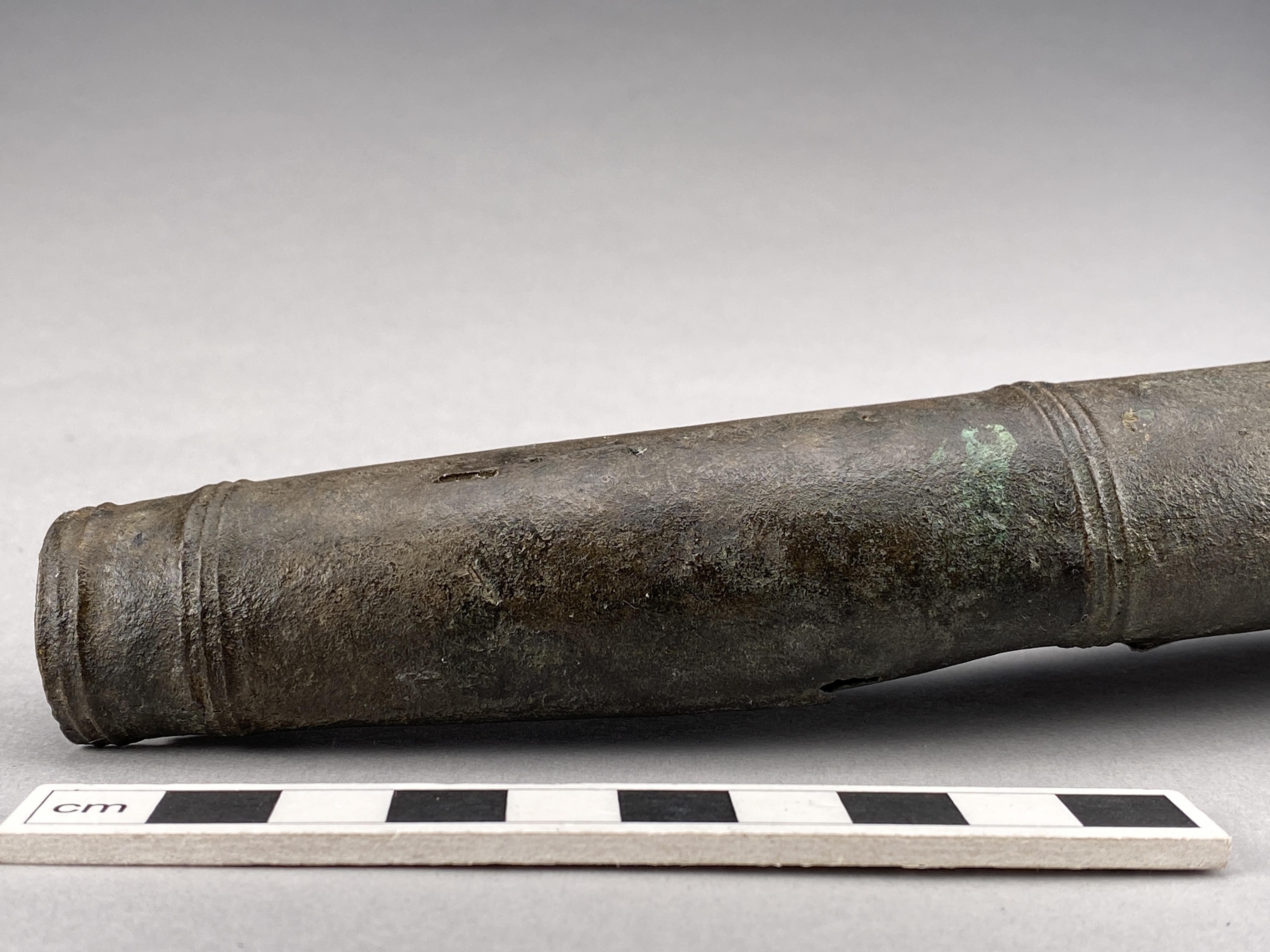 Två större stycken av en bronslur. Dekor av tvärgående smala vulster, tre stycken, som återkommer på ca 8-10 cm avstånd. På den smalaste änden sitter vulsterna närmare. På den bredaste änden har två trippelvulster kombinerats med tungformiga avslutningar. Båda fragmenten har omfattande äldre skador. Det större fragmentet är hoplaskat med T-formiga laskar. Detta större fragment har också rester av ytterligare en laskning i den smala änden. De olika delarna i fragmentet har varit ca 25 cm långa. Den breda änden avslutas med en rak kant. Även det kortare fragmentet har hoplaskats ca 27 cm från den smala änden. Dess bredare ände är förstörd. På bägge fragmenten finns ovala hål i rader, hålen är 2-6 mm långa. Hålen kan vara rester av gjutstöd.