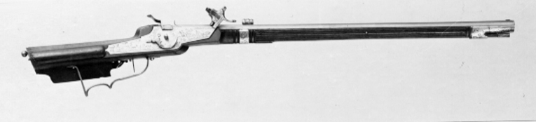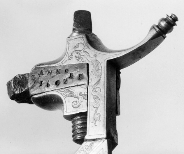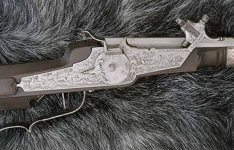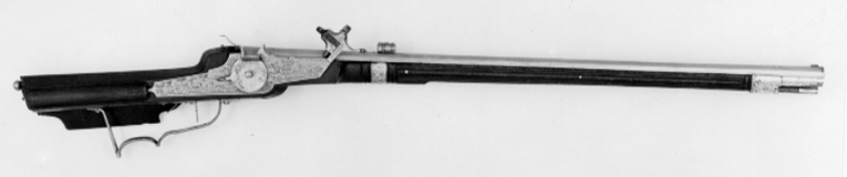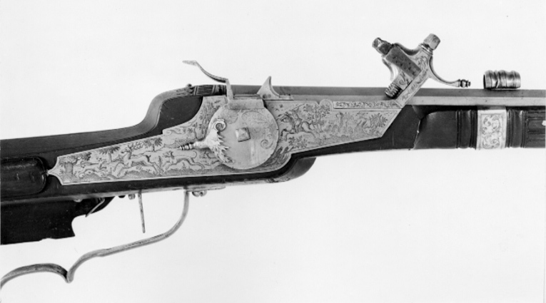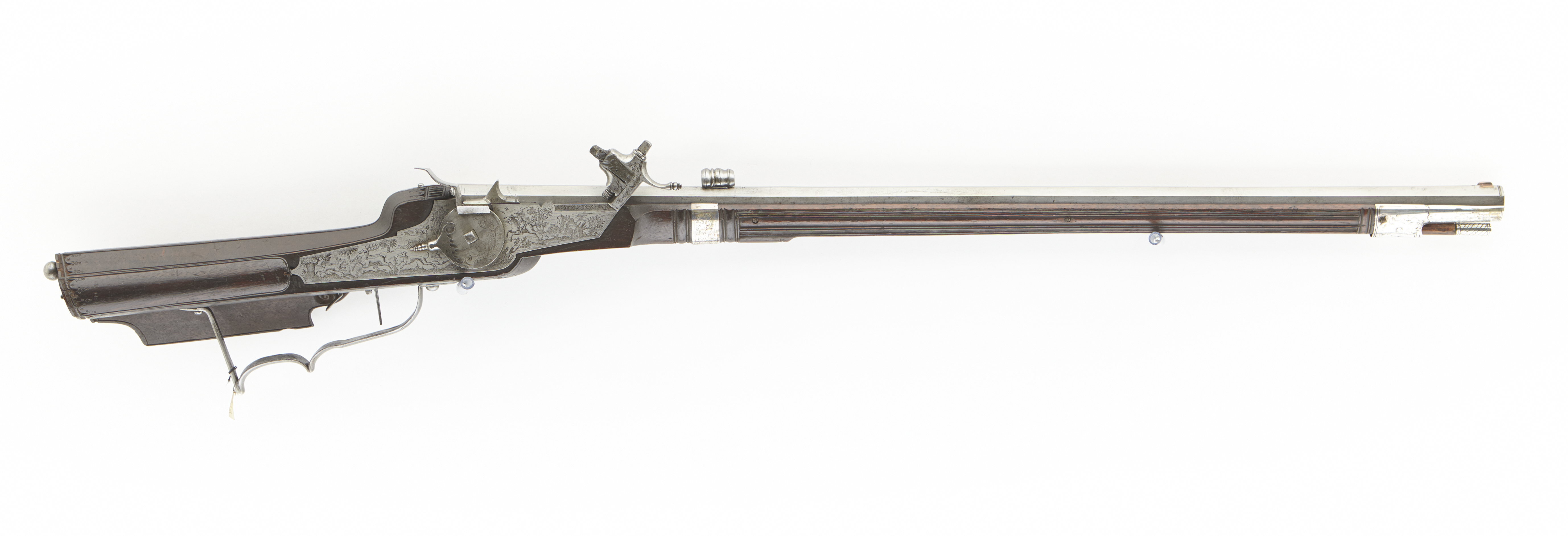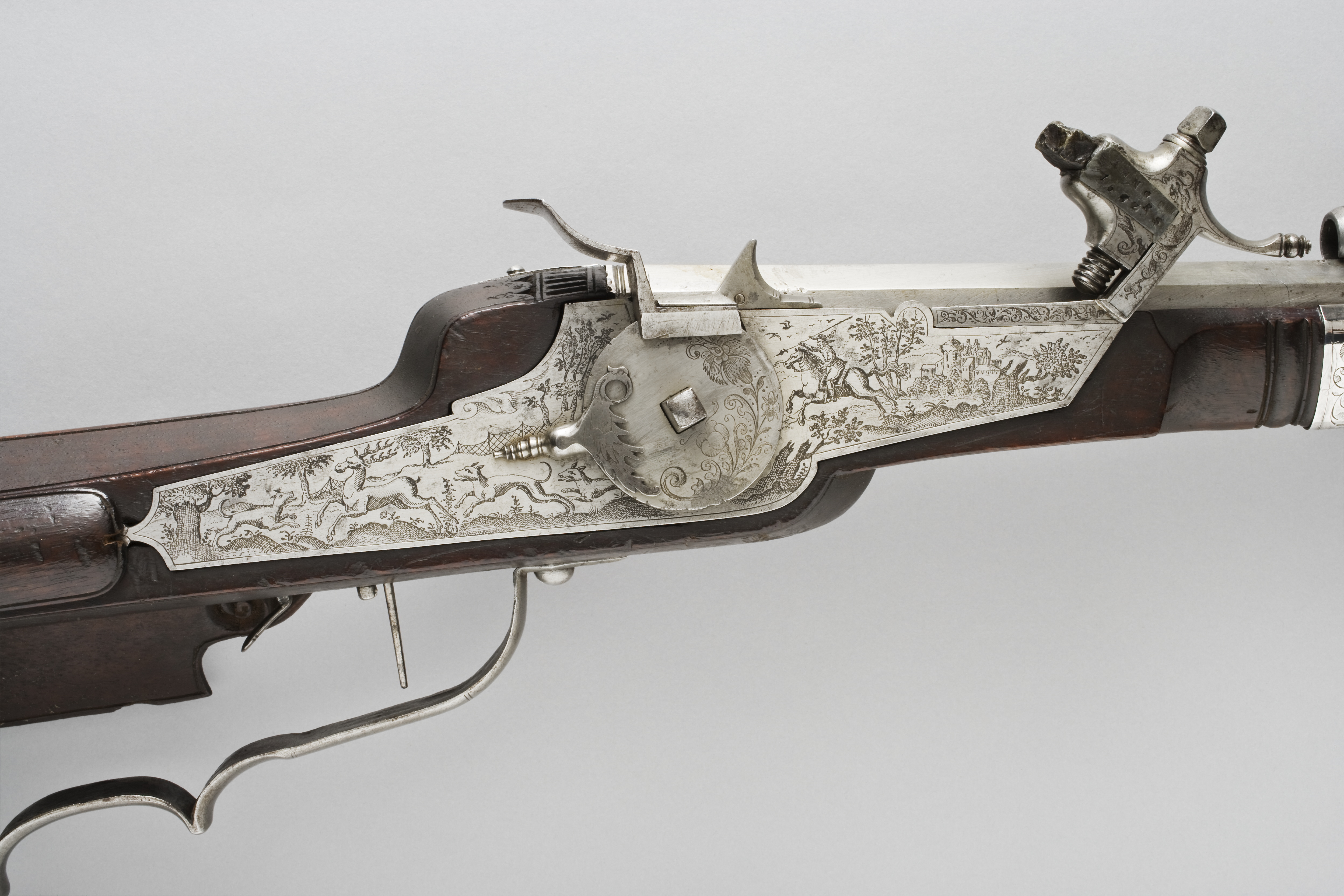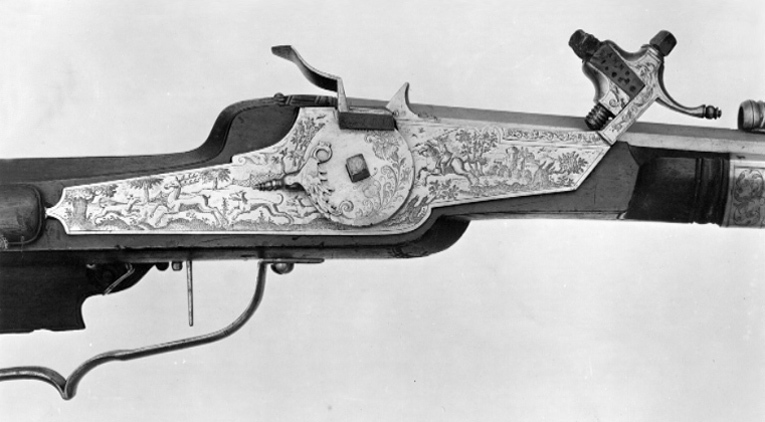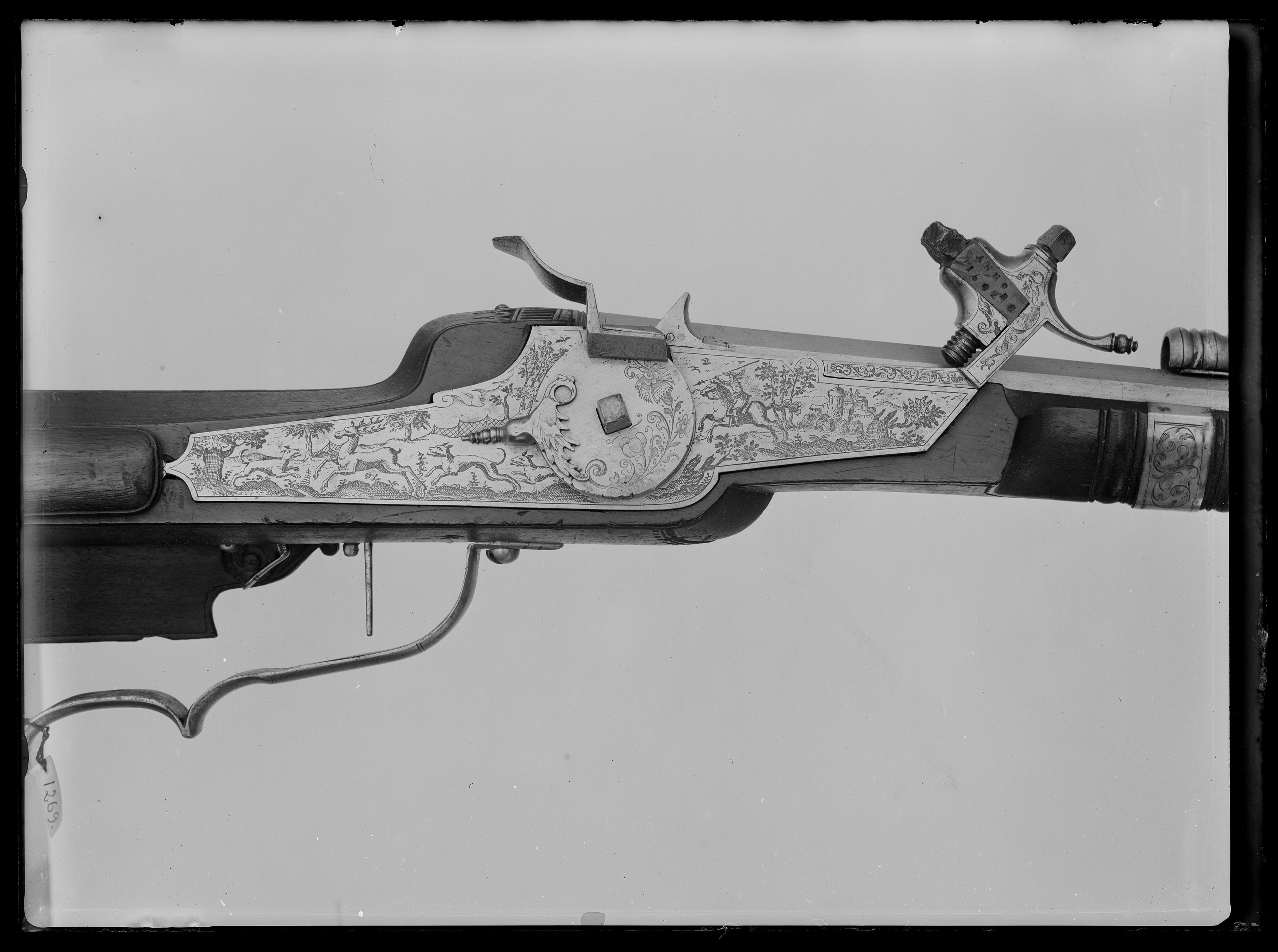 Åttsidig pipa av stål med 6 räfflor, skålade bommar. Graverade, parallella linjer på svansskruvbladet, pipans båda ändar bakom kornet och på ömse sidor om urtaget för siktet. Riktmedel: Siktet löst i kolvlådan. Inlaxat stolpkorn av koppar. Fästning: Tre häften. Pipan fäst med krysskruv underifrån (främre varbygelskruven) samt tre pipstift av stål. Hjullås av tysk typ med plant låsbleck med fint etsad dekor, landskap med träd borg i bakgrunden, ryttare med lyft spjut, hjort jagad av tre hundar, bakom dem ett jaktnät. Utvändigt hjul, fäst med en studel kl. 9 i form av en papegoja. Hjulet med etsad blomdekor på ena halvan. Fängpanna med fasad yttre nederkant, kantig, mycket uppåtböjd krutskärm, avslutad med horisontell platta.Kantigt fägpannelock med rörlig arm, etsad pegasus, toppigt fingergrepp. Kantig hane i flykt med låsblecket. Lös underkäke, käkskruv med kubiskt huvud. Kort, svagt uppåtböjt fingergrepp med knopp. Hals och käkar dekorerade som odjurshuvud. På hankroppen slingor . invändigt en blånerad och graverad hanfjäder med platt studel, blånerad stång och arm till fängpannelocket. Två låsskruvar med kort gänging, nötta gängor. Avtryckare med snälltryck. Brun helstock med kolv av tysk typ, kolvlåda och bred vinge. Bakplåt saknas. På kolvänden en limmad lapp med påskrift "1269". Stödkula av stål. Välvt kolvlådelock av stockens trä. Längs kolvens bakre kant och på locket en bård av utskurna uddar och punsade ringar, lika på kolvnacken samt ränder och ringar vid sidan av och under kammaren. Två runda, graverade låsskruvbrickor av silver med överliggande kors (stiliserade rosor?). Räfflad framstock, framför låset runt stocken ett pipband av silver med graverade rankor. Näsband och överrörka i ett stycke av silver med graverade rankor. Rektangulärt avtryckarbleck. Varbygel av stål med ett och ett halvt fingerläge, främre armen fäst med 4krysskruven. Tillbehör: Laddstock av stockens trä med graverad skoning av silver framtill.