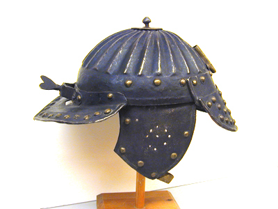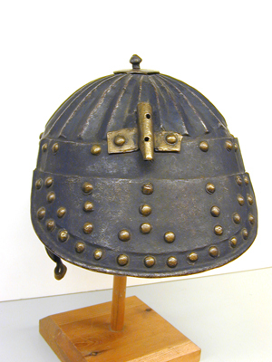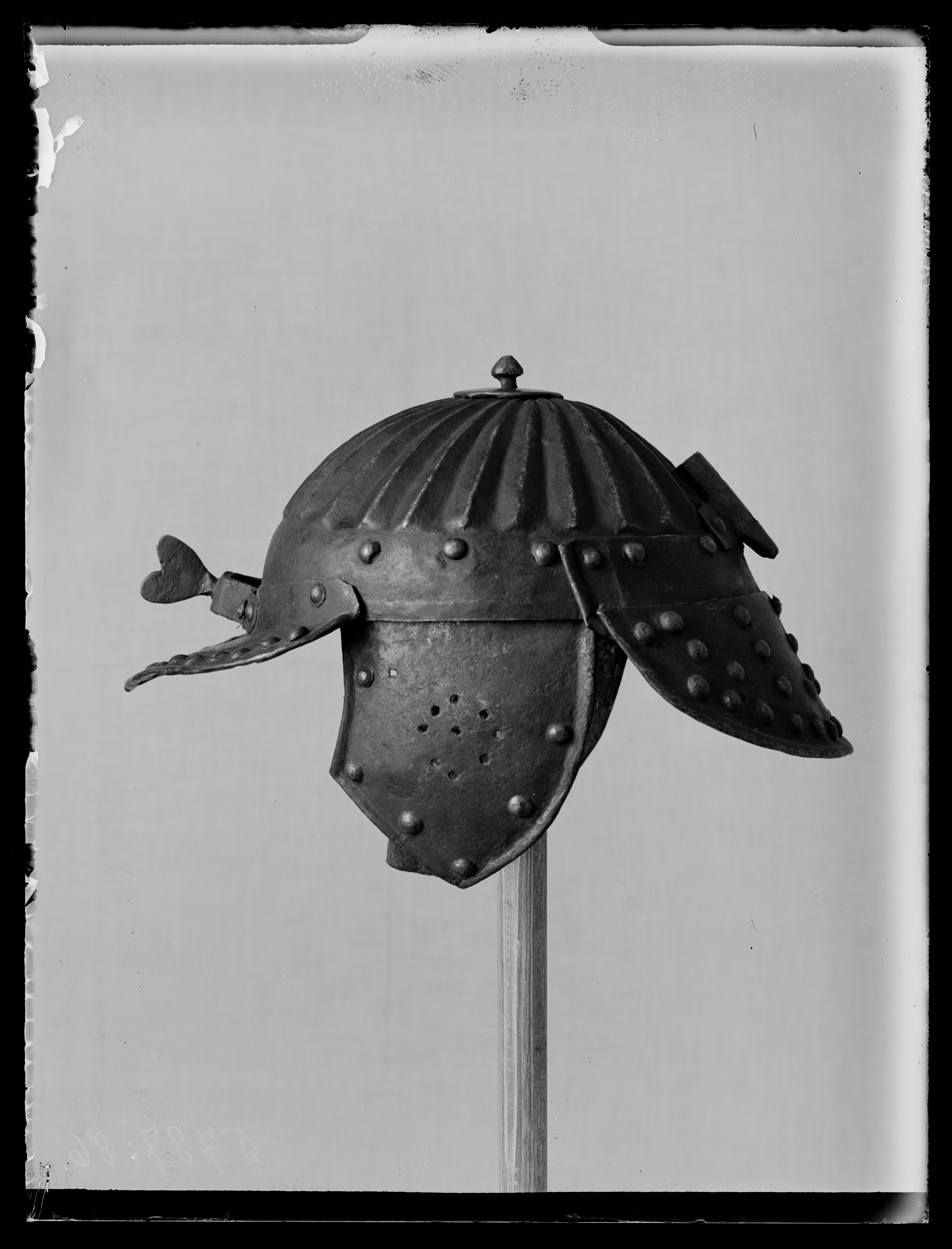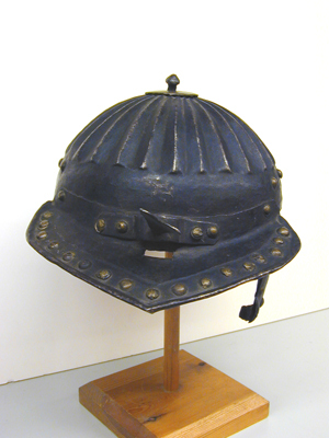Hjälm av svärtat stål med flackt väld klocka med radiellt ordnade, åsade räfflor från krönet och till ca 45 mm från nederkanten. På toppen en oregelbundet rund platta av mässing, d:45-50 mm, och därigenom nitat en grovilad knopp. Framtill en framtill spetsig pannskärm med omvikt kant, baktill uppåtböjd kant för fästning mot klockan, två nitar vid ytterändarna samt näsbärjans 4 bygelnitar. Utefter framkanten en ca 20 mm bred försänkning med 17 nitar med välvda skallar täckta med mässingsskålla. Intill klockan en rektangulör öppning för näsbärja. Bandformig bygel fäst med fyra nitar med välvda skallar täckta av mässingsskolla, skruv med hjärtformig vinge. Baktill en styv nackskärm med omvikt kant, två lameller, den övre fäste med 6 nitar, den nedre numera fäst med tre nitar vid den övre. På den nedre 16 nitar i en försänkt kantllist, därinnanför 17 nitar, 3+3 ytterst i svängd linje efter kanten, därinnanför 3+3 i lodräta rader, i mitten 5 i form av ett störtat Y. På klockan ovanför och delvis täckande den övre lamellen en plymhållare av mässing fäst med två nitar. Ursprungligen två öronlappar (den h saknas) fäst med tre nitar, omvikt kant, 6 nitar utefter kanten, 9 oregelbundet runda hål, 8 i ring och 1 i mitten. Vid niten längst ner fäst en läderrem, b: 12 mm i ögla. På h sida endast de tre fästnitarna bevarade. Invändigt finns rester av läderremmar under nitarna bevarade.