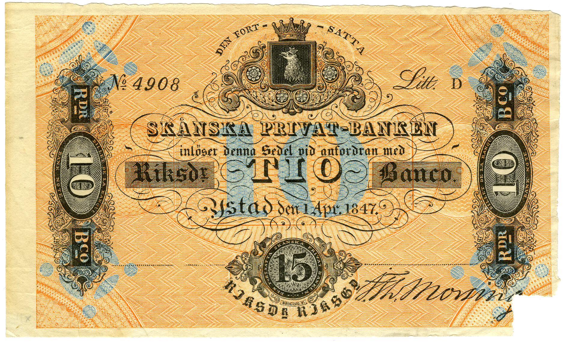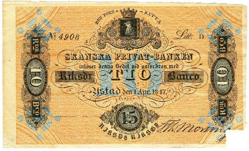 Upphov: Skånska Priwat-Banken. Media: Bonnevier, Helena. Ekonomiska museet - Kungliga myntkabinettet/SHM, (PDM) Upphovsrätten till detta verk har gått ut och är därmed fritt att använda på alla sätt. Ange gärna upphovsperson om denne är känd.