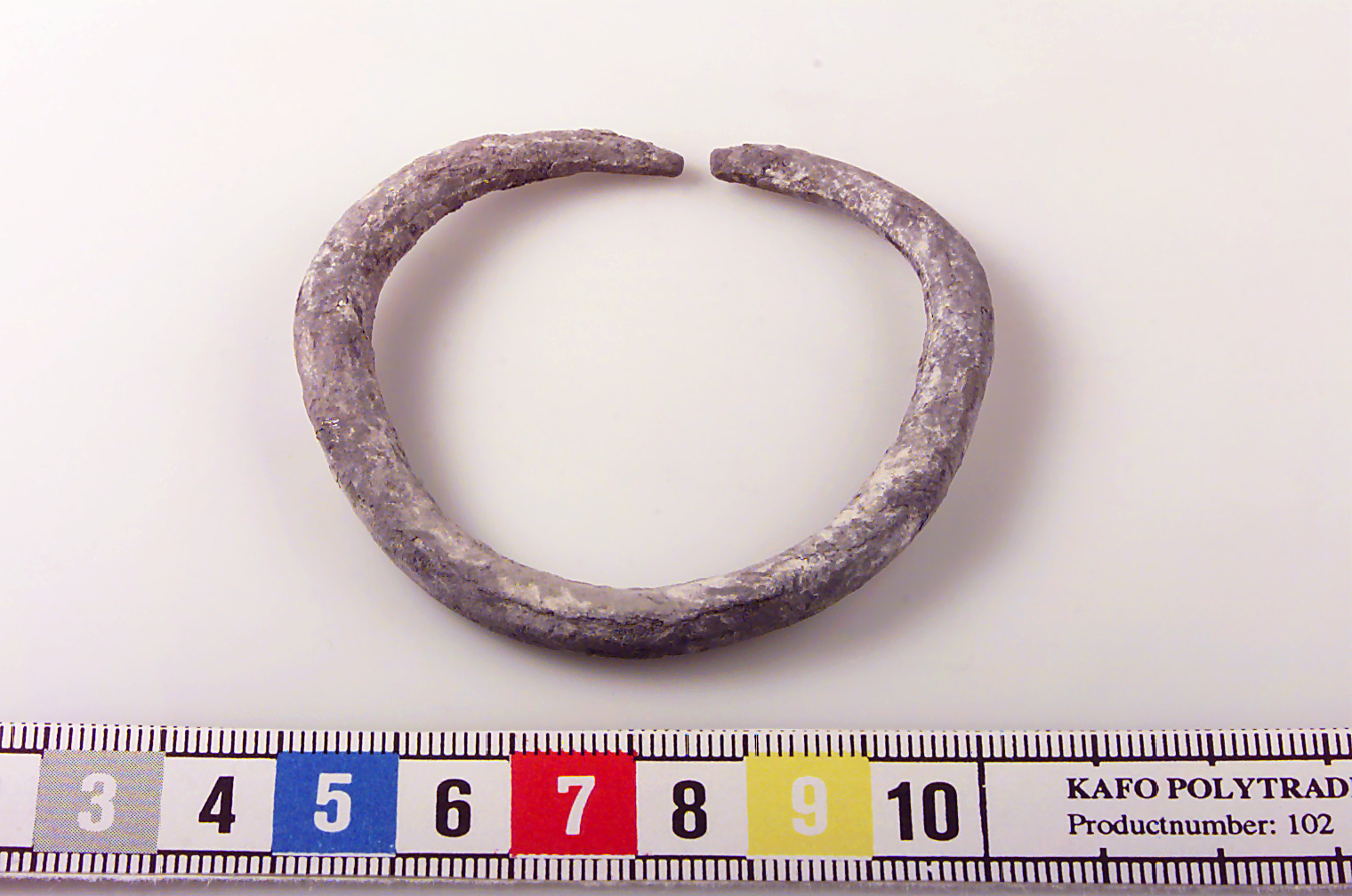 Rundad ten med avsmalnande ändar. Korroderat ytskikt.