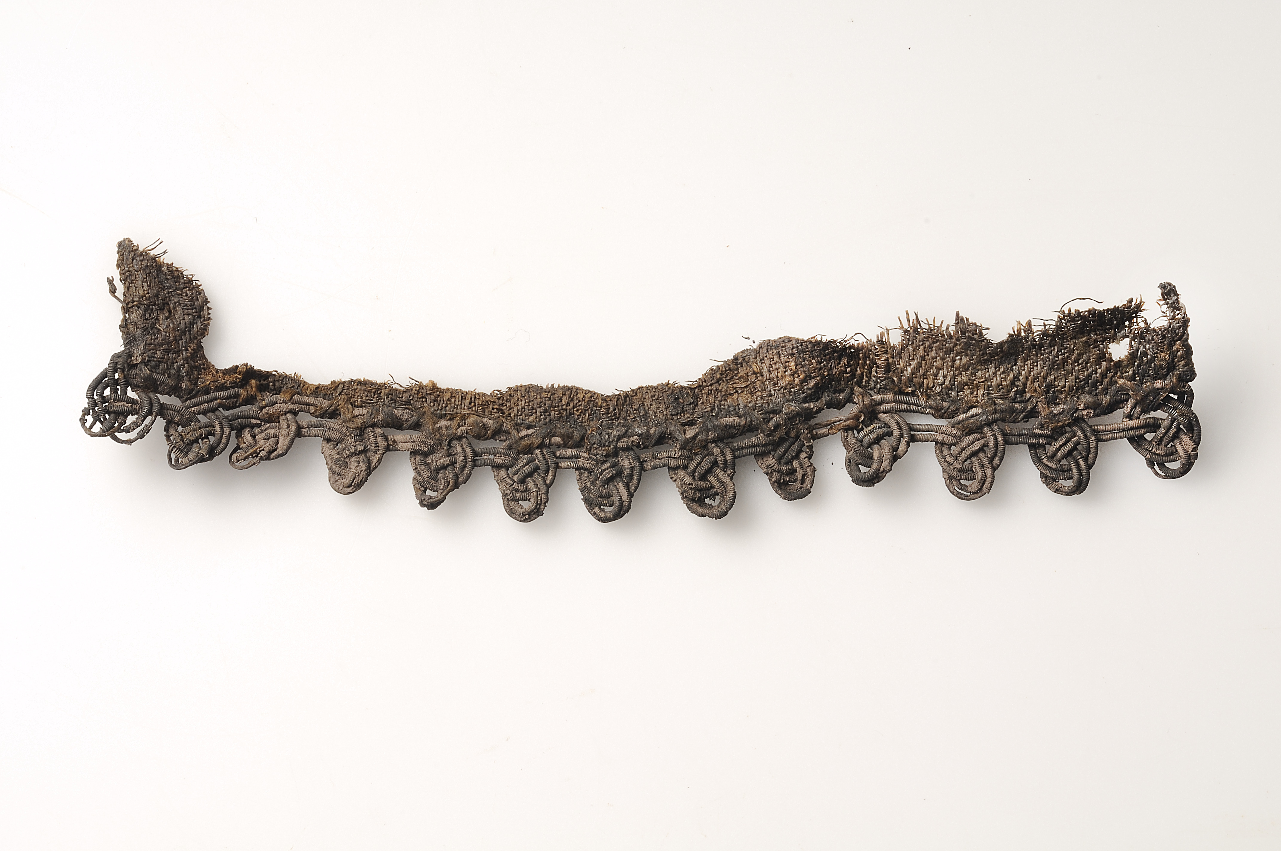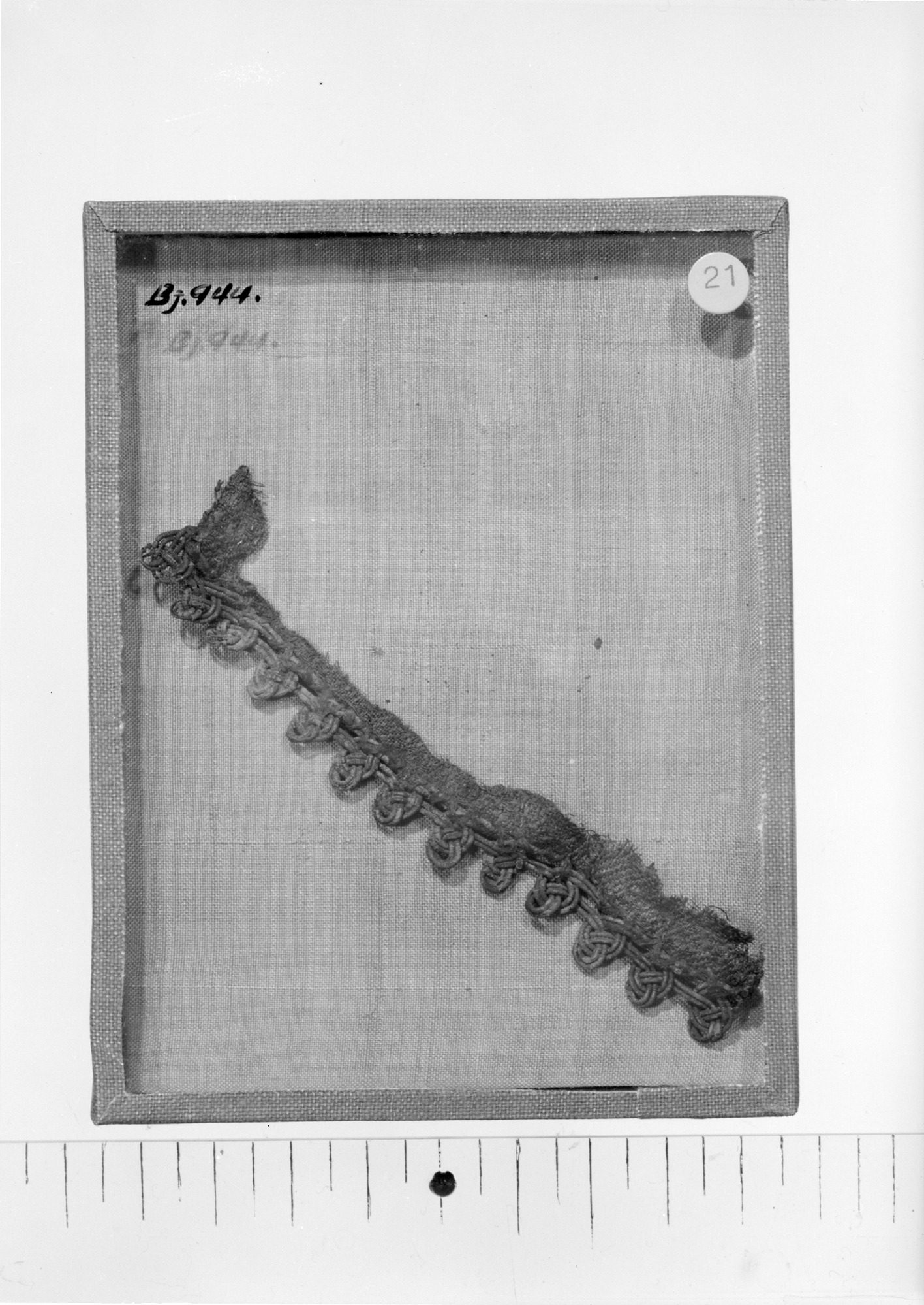 Bård i passementeri i silver fäst vid kyprat siden och brickband. Taf 28:3// Posament fastsytt på ett sidentyg vävt i 2/2 kypert. /MN