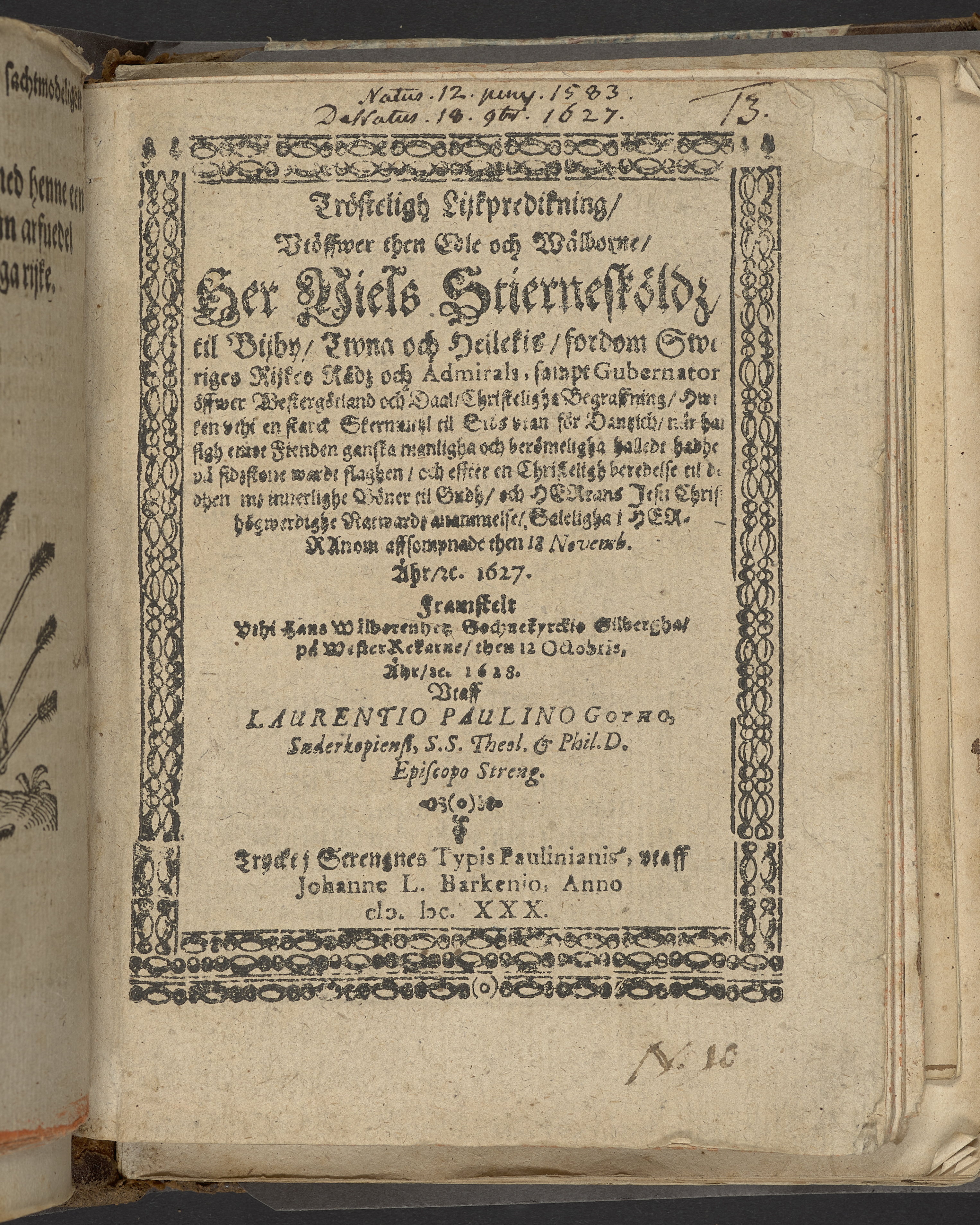 Trösteligh lijkpredikning, vtöffwer... Her Niels Stiernesköldz til Bijby, Twna och Hellekis... Framstelt vthi hans wälborenhets socknekyrkio Gilbergha på Wester Redarne, then 12 octobris, åhr, ec. 1628. Vtaff Laurentio Paulino Gotho... Tryckt i Strengnes typis Paulinianis, vtaff Johanne L. Barkenio, anno MDCXXX.