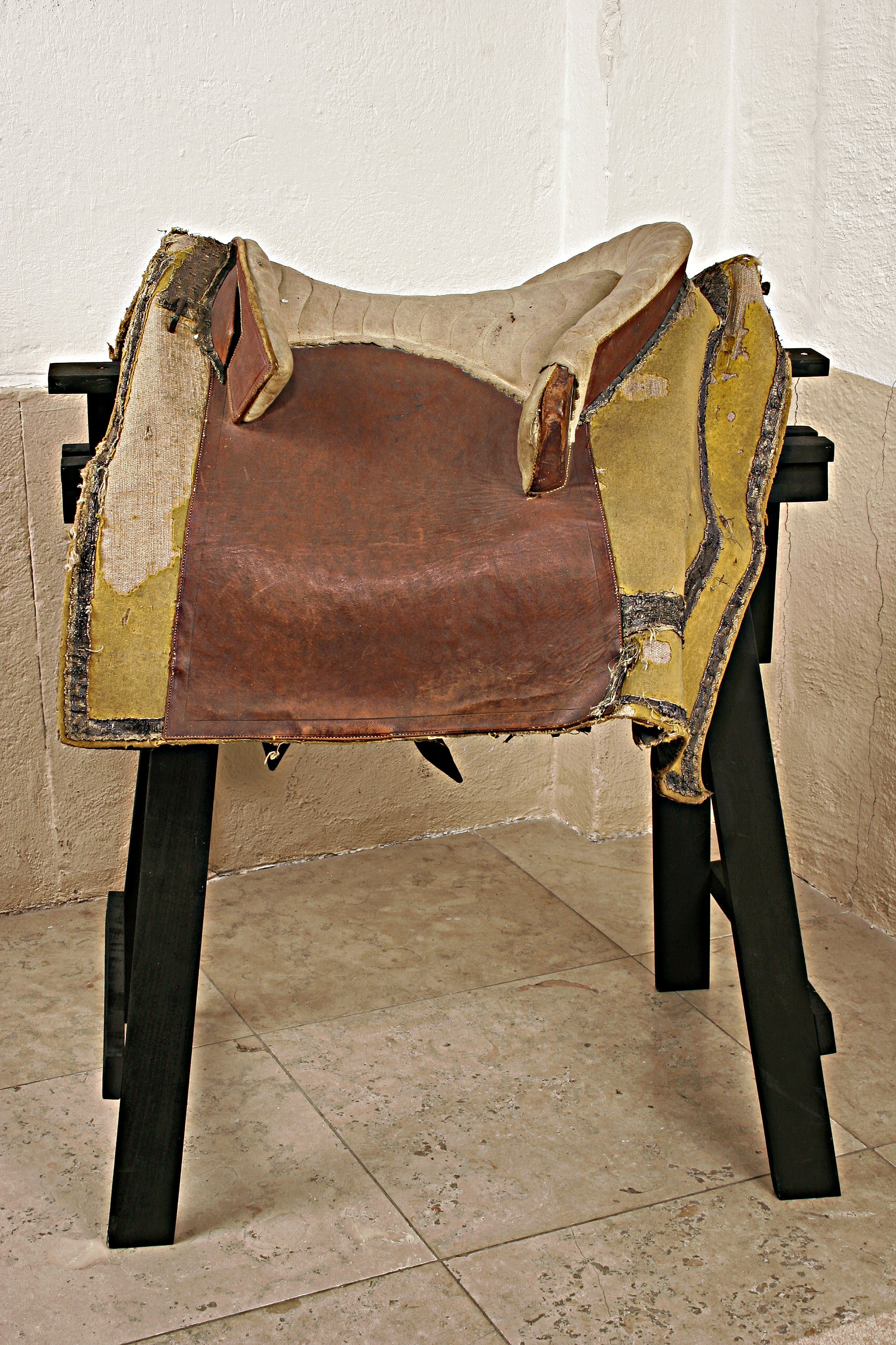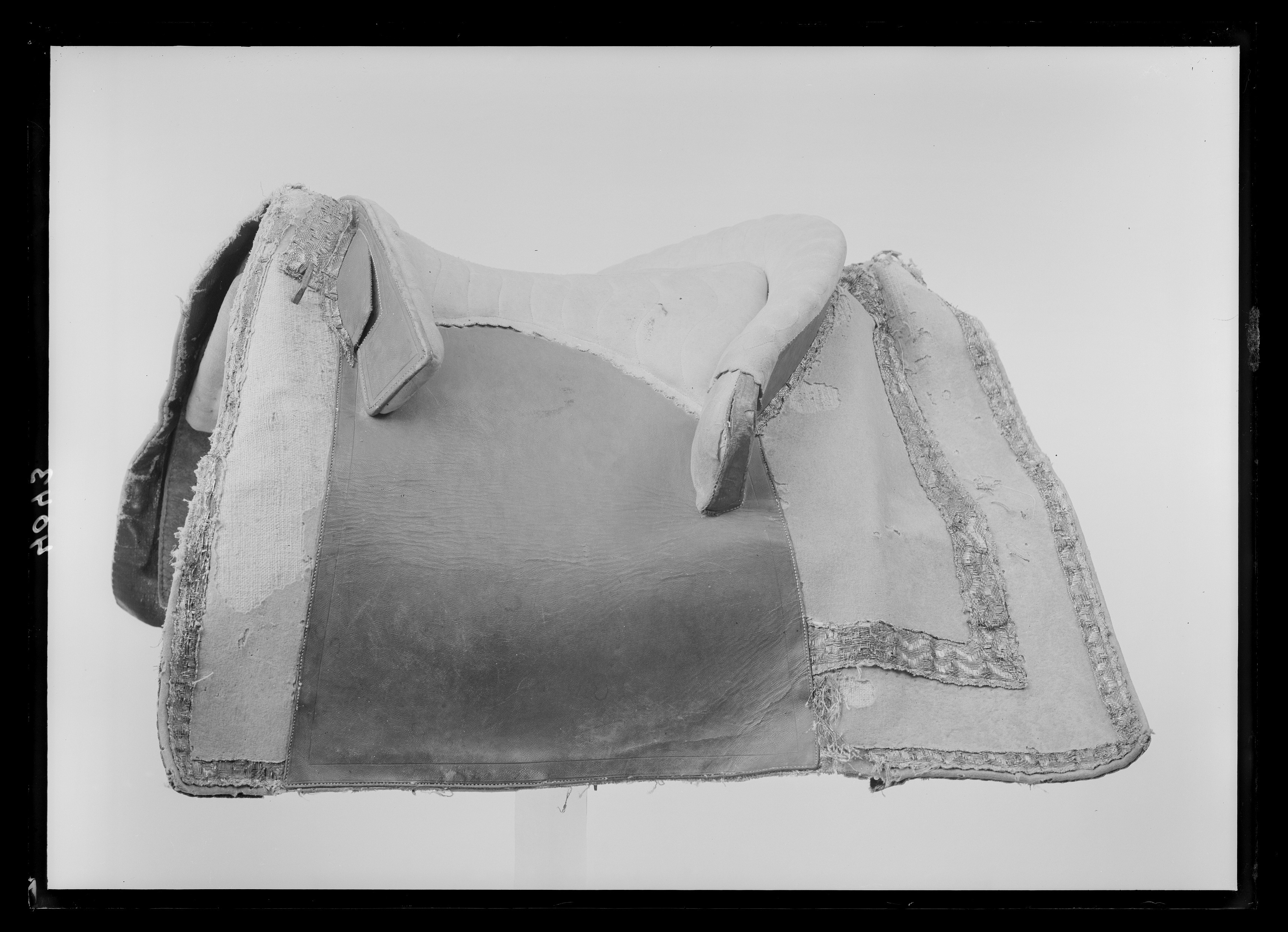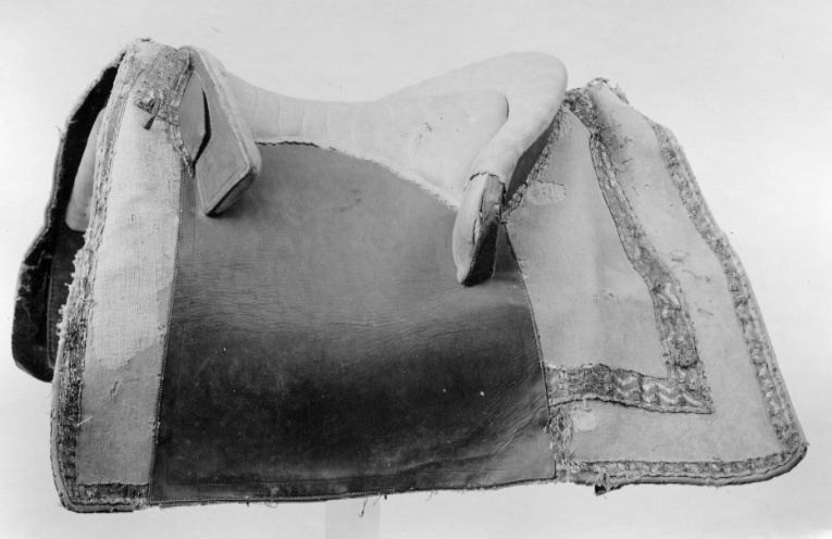 Bomsadel av brunt läder, sits av sämskat ljust skinn med stickningar av gult silke, rektangulära sadelkappor kantade med gul sammet med silvergaloner. Fodrad med svartmålat linne och brunt läder. Frambom, ca 430 mm bred, ca 25 mm hög tvådelad bakbom, ca 535 mm bred, ca 60 mm hög med stödbommar. Bossor av linne. Bommen klädd med linne två stålkrampor framför frambommen fyra stroppar av läder för sadelgjord. Två söljor för stigläder.