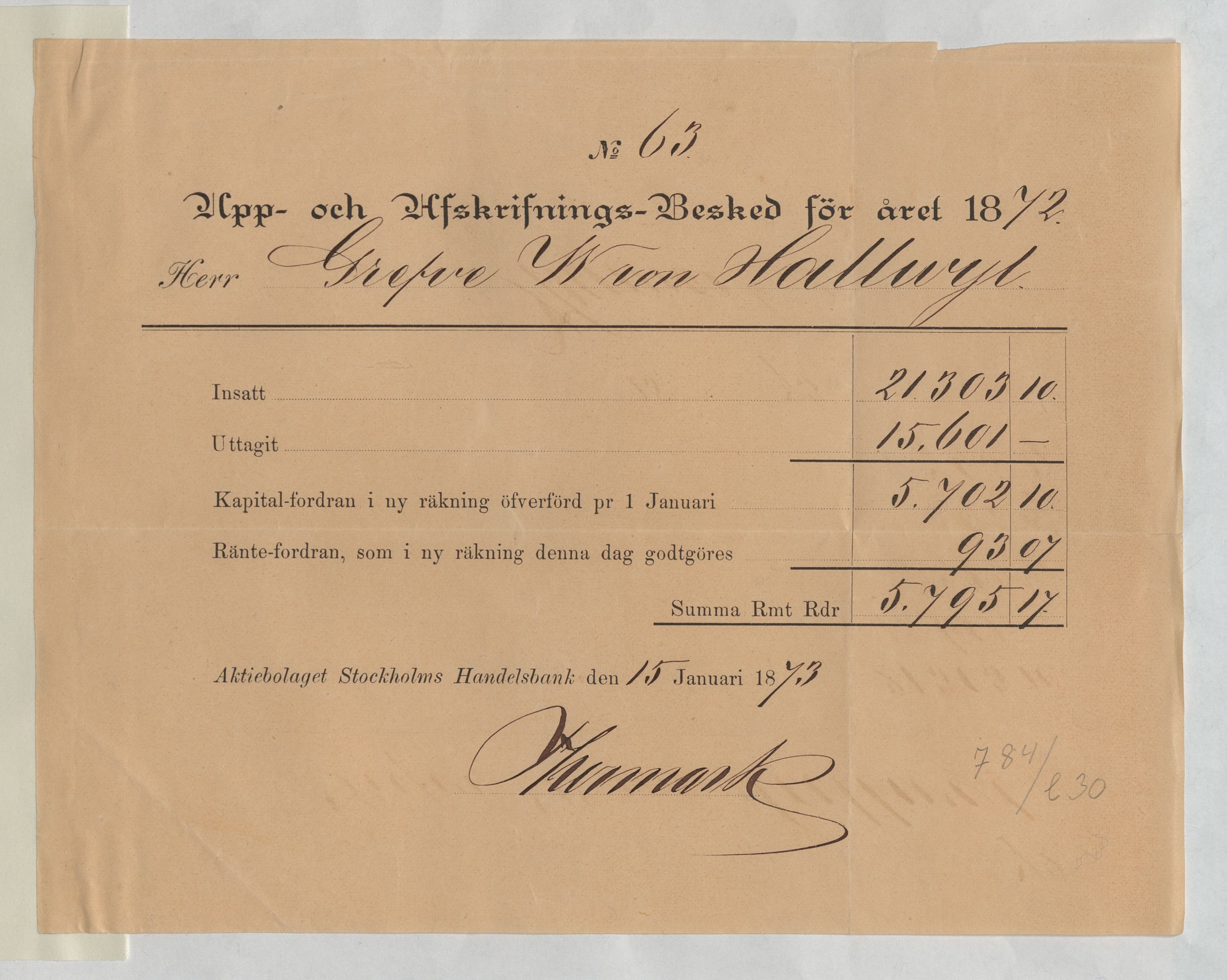 Kvitto från Aktiebolaget Stockholms Handelsbank rörande Upp- och Afskrifnings-Besked