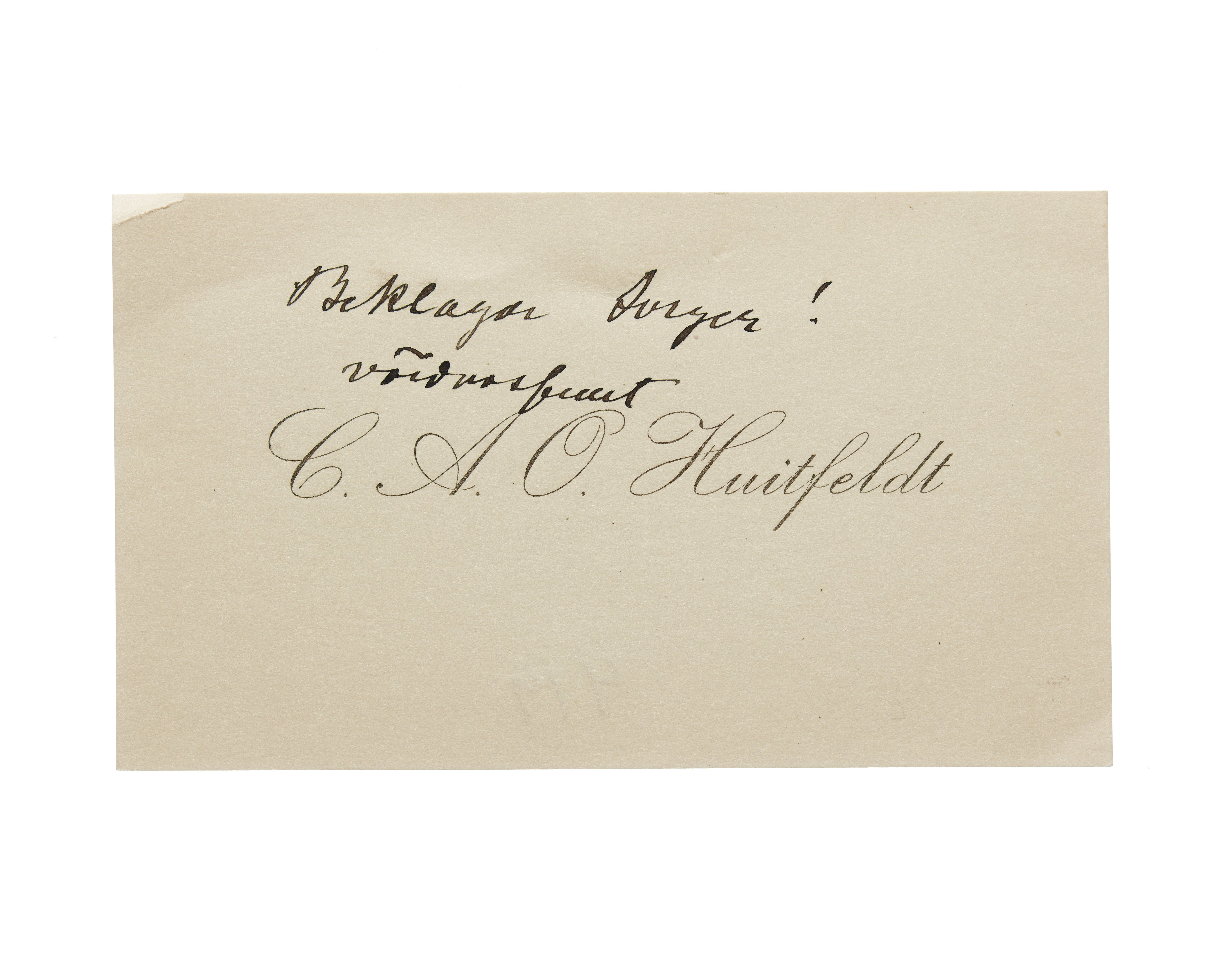 Ett visitkort från C. A. O. Huitfeldt, daterat 1921. Handskrift "Beklagar sorgen! Vördnadsfullt".