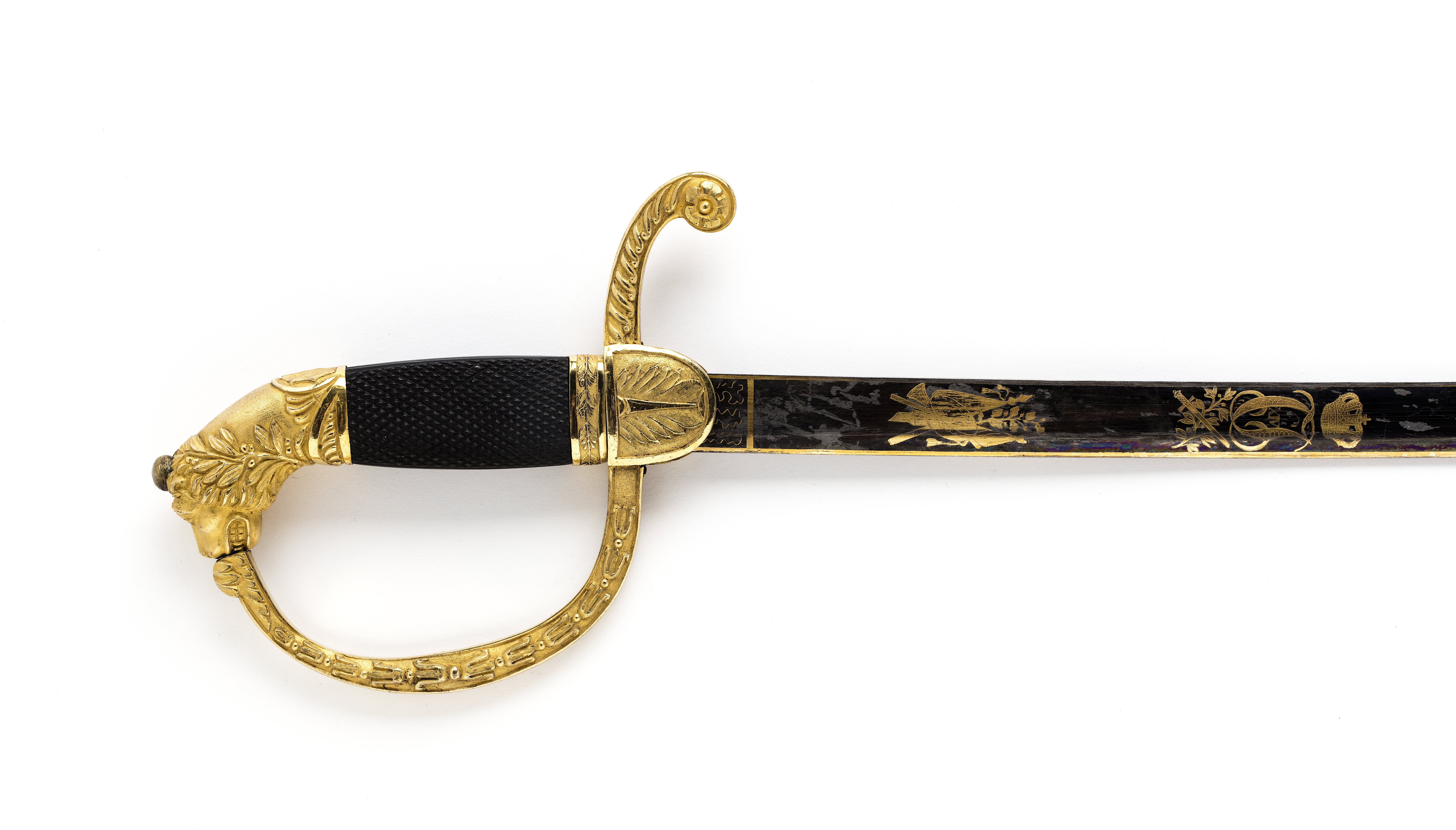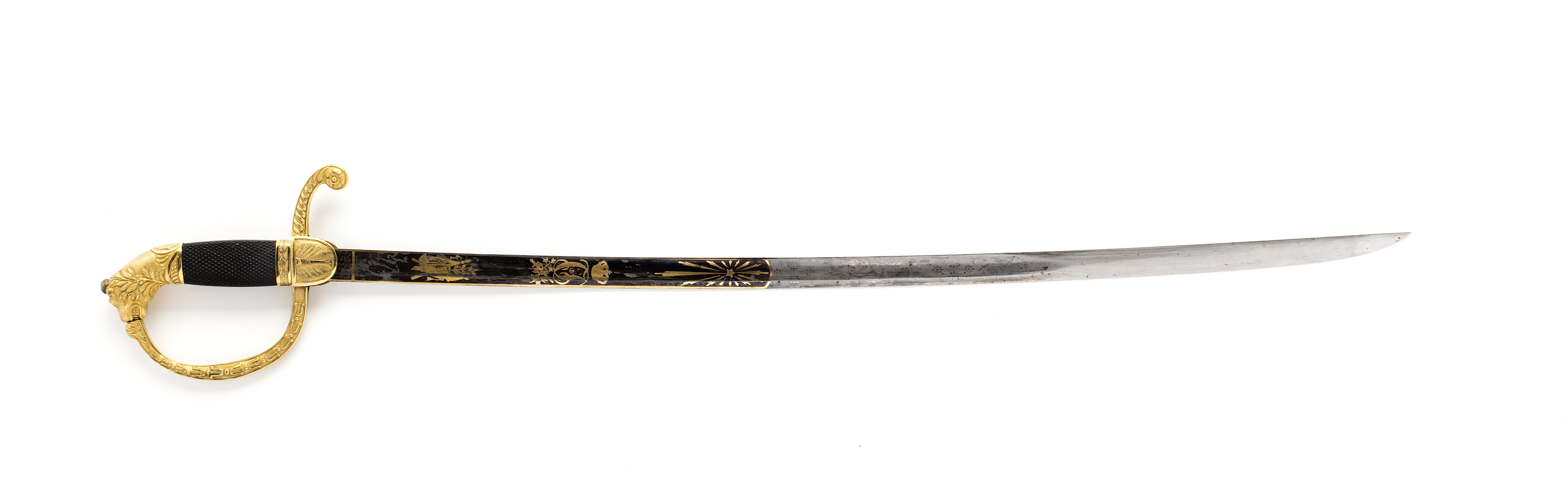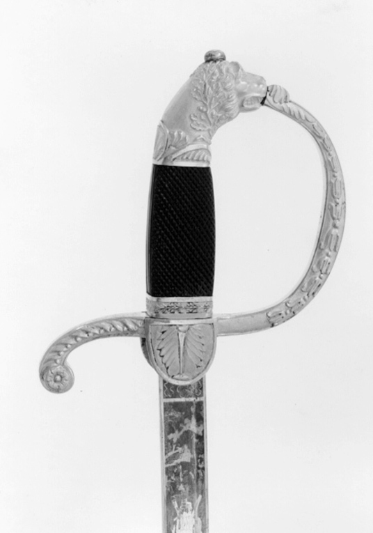 Fäste av förgylld mässing. Kappa i form av lejonhuvud omslingrat av lagerranka. Bakre parerstång räfflad, vidgad i ytteränden och nedböjd samt med en stiliserad blomma. Handbygel intappad i kappan samt med en ranka av enkla palmetter. Kavel, fyrsidig avnätskuren ebenholts samt nedtill med band med lagerranka och polerade kanter. Halvoval styrskena med bladornament. Klinga böjd eneggad med etsad och förgylld ornering mot blånerad botten intill 380 mm från basen. Vid basen på båda sidor rektangulärt fält med finmönstrat ådernät därefter på utsidan trofégrupp av korslagda fanor, puka, eklövsranka; korslagt svärd och lagerranka och Karl XIV Johans monogran under kunglig krona; strålande nordstjärna. Orneringen i övrigt i form av polerade blomrankor mot mattslipad botten (utan blånering). På insidan rustning framför två korslagda fanor; fasces korsad med lagerranka därovanför Frans Josef Oskars monogram under kronprinskrona, orneringen i övrigt lika som den på utsidan. Klingans rygg blånerad med smal förgylld kant 232 mm från basen.