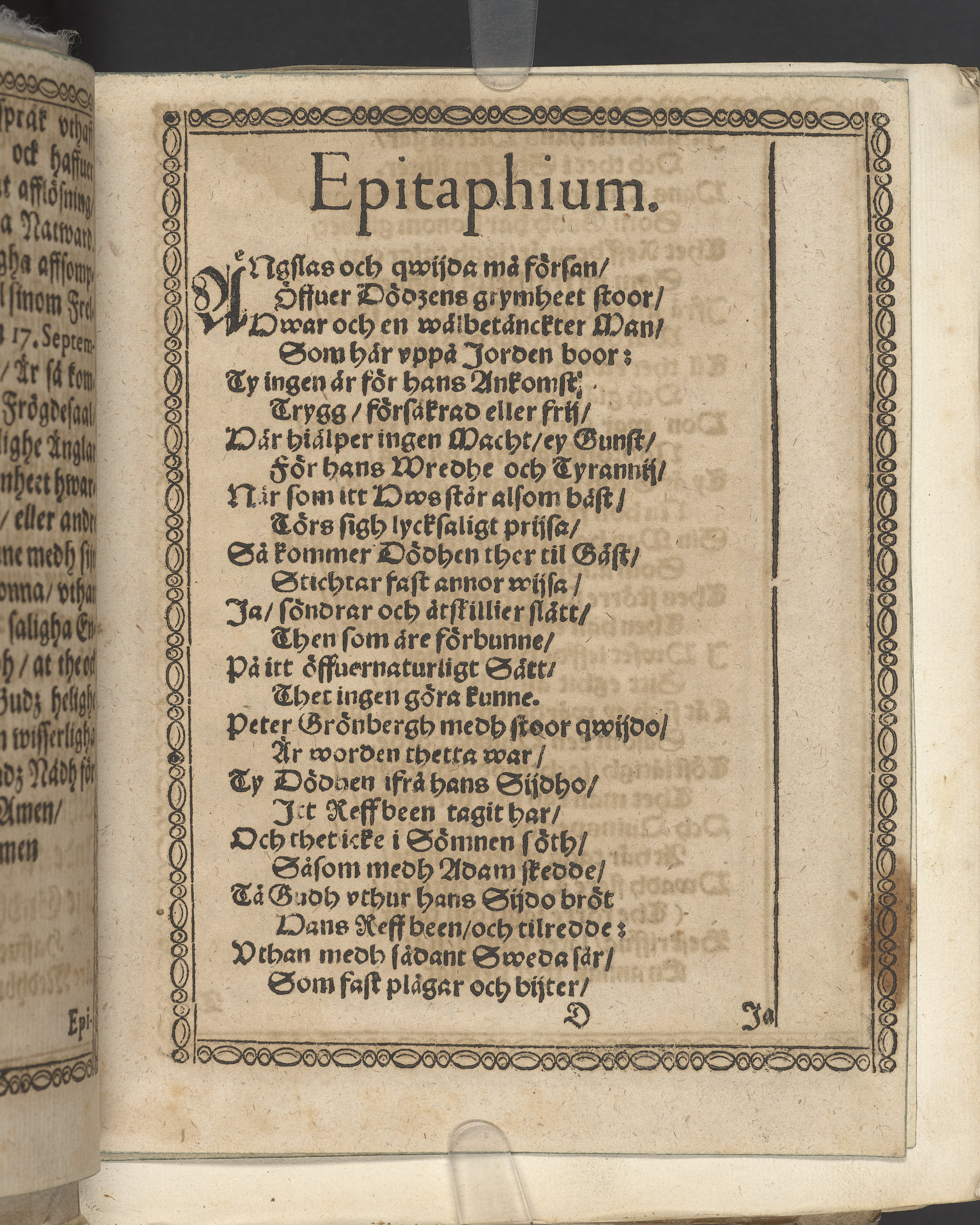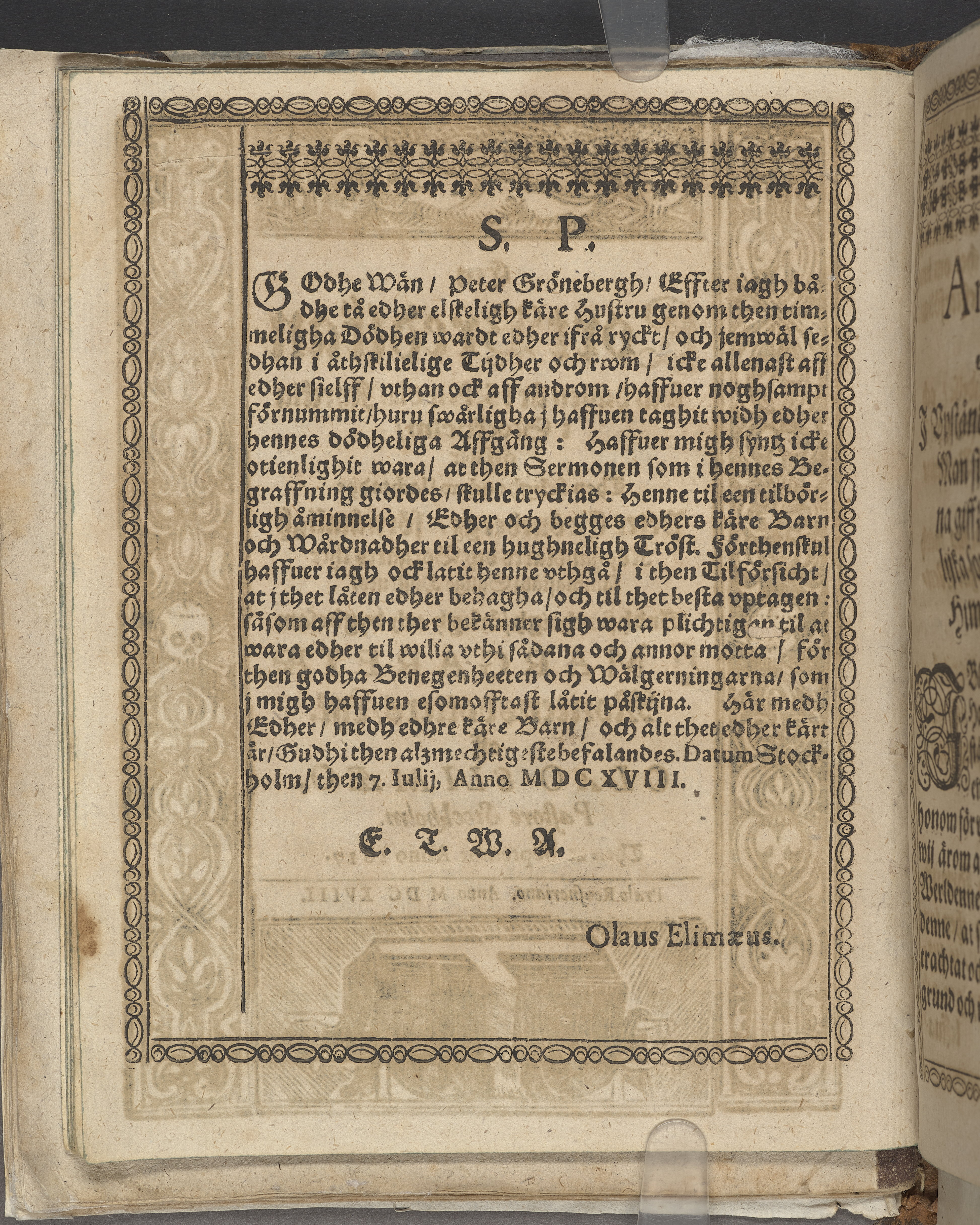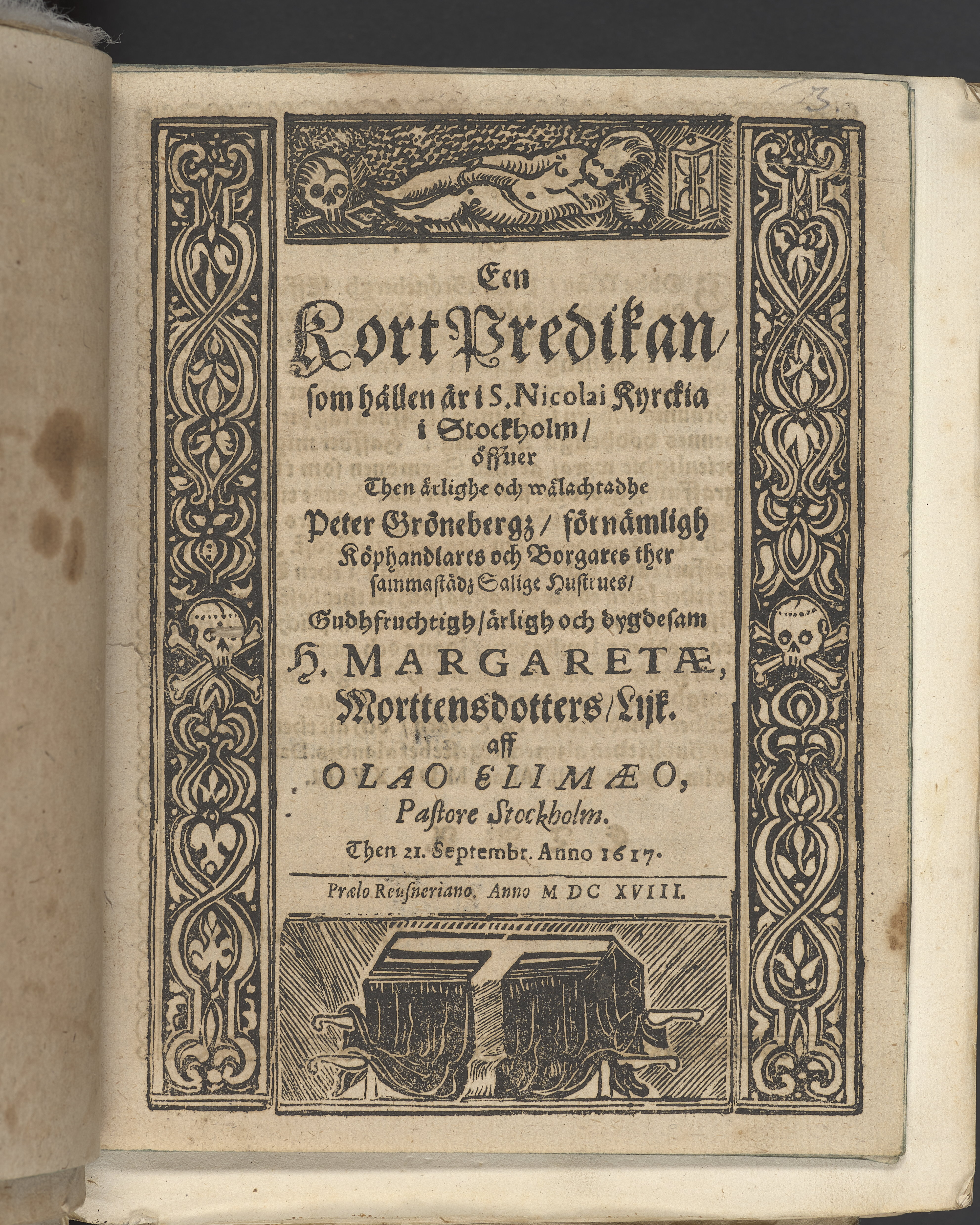 Een kort predikan hållen är i S. Nicolai kyrckia i Stockholm, öffuer ... Peter Grönebergz, förnämligh köphandlares och borgares ... hustrues ... H. Margaretæ, Morttensdotters, lijk. Aff Olao Elimæo pastore stockholm. Then 21. septembr. anno 1617. Prælo Reusneriano. Anno MDCXVIII.