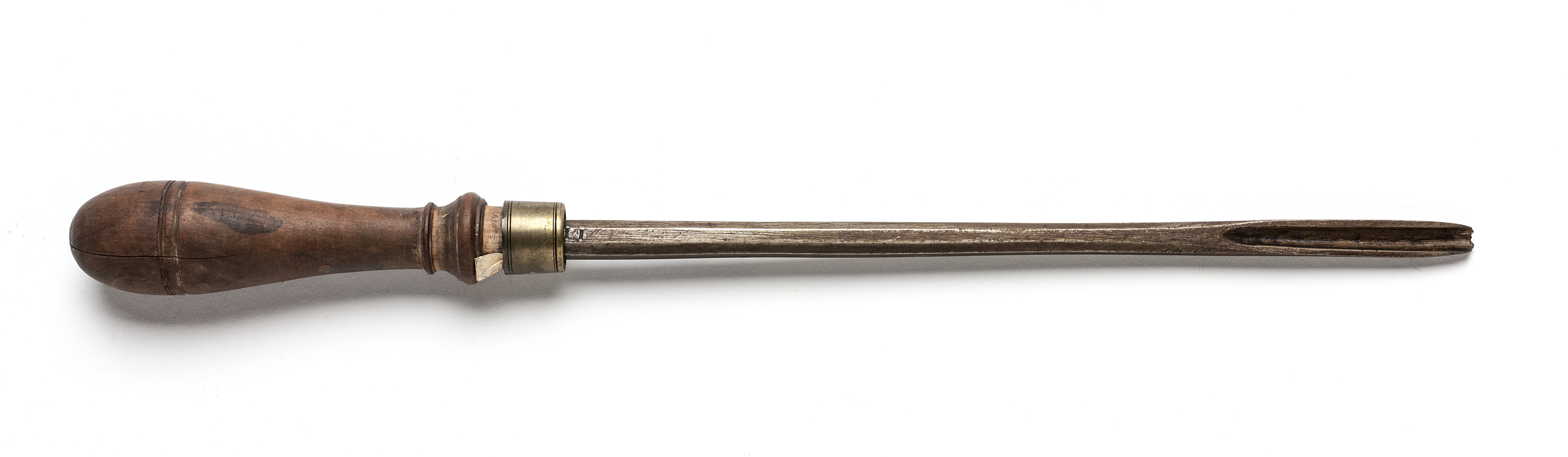Klinga med åttsidig genomskärning. Stämplat på klingan: "11" med stans nr 5375 Svarvat skaft av päronträ, med två vulster nedtill ("skoklostertyp"). Mässingsring.