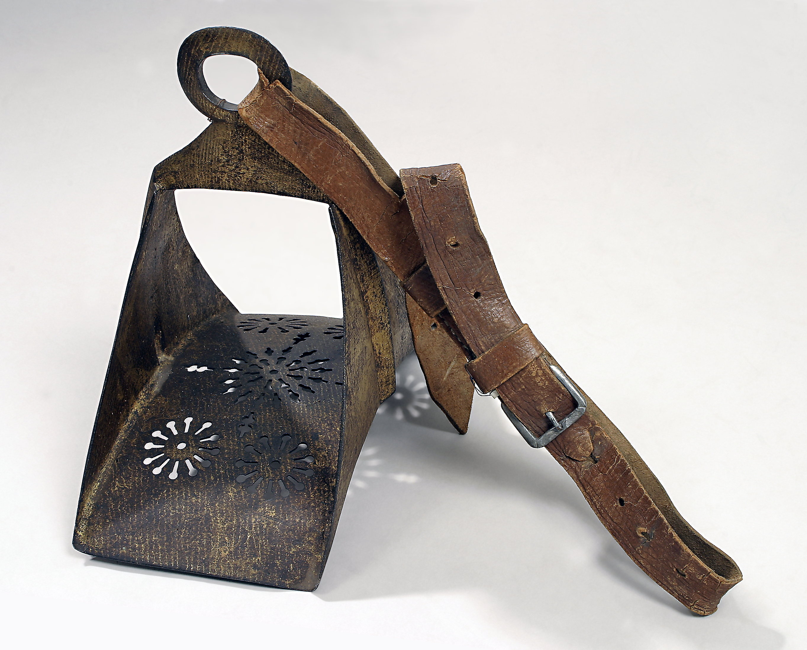 Stigbygel av förgyllt stål. Skänklarna av triangulär form, basen konkav. Vertikalt på mitten en upphöjd ås, som upptill övergår i en triangulär bygel med fast rund remögla. Trampstöd med fem genombrutna, runda, blomformiga ornament. Tillbehör: Stigläder av ljusbrunt läder ca 107 tum långt, 32 mm brett med rektangulär sölja av stål.