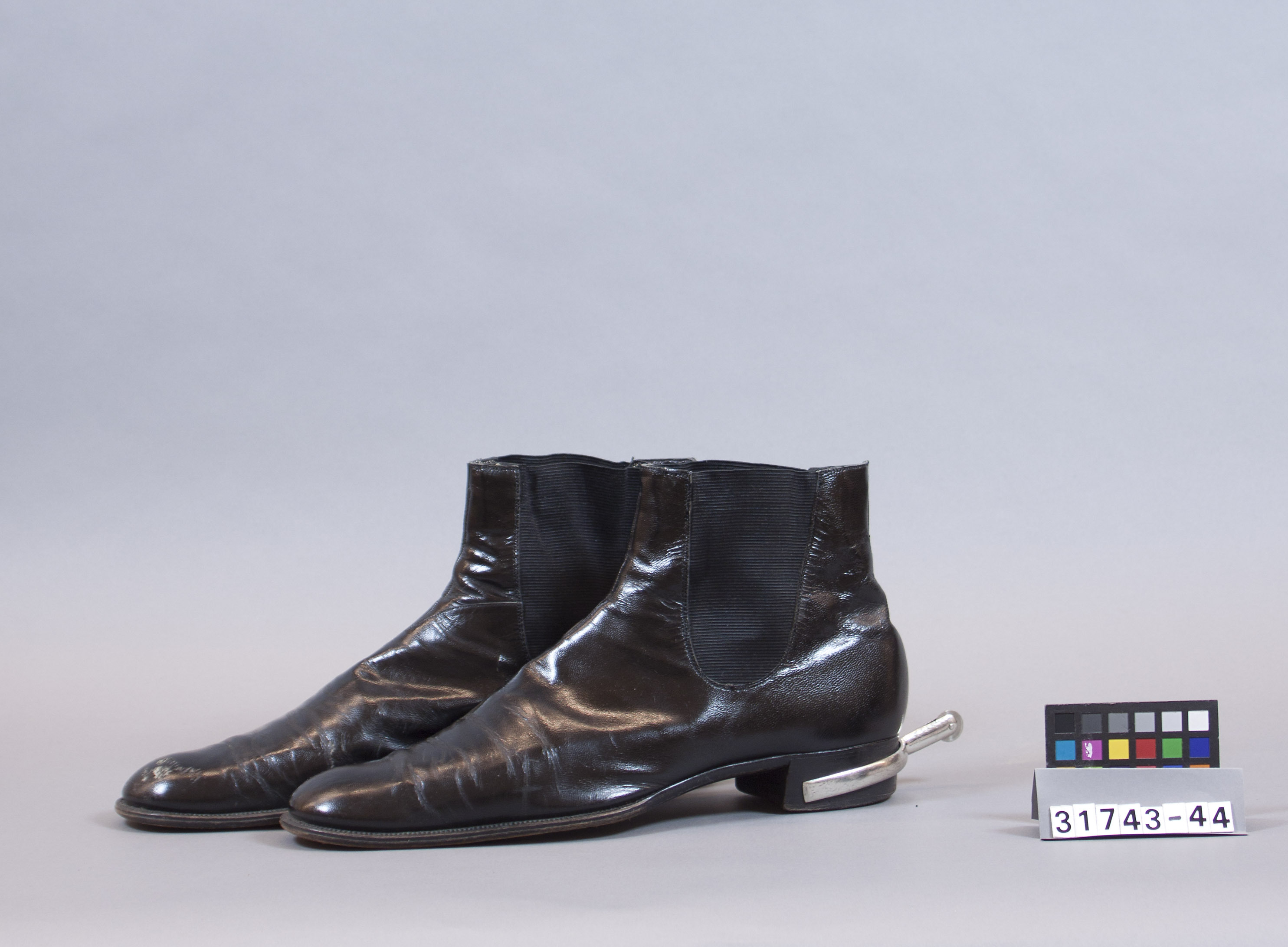 Sko av typ boots (resårpjäxa enligt gula liggaren). Materialet är svart lackskinn. Sula och klack av svart läder, slitna. 10 stycken synliga klackspikar. Ett A är stämplat på sulan vid klacken. Söm snett vänster vid vristen mot resåret. Söm mot vristen samt mitt bak. Svart resår på båda sidor. Skrapmärken vid tån, även ovanför klacken. Skruvsporre med sporrklinga utan taggar, fastsatt på klacken. Innersulan ett resårband med läderöglor på vardera sidan. Innersula av brunt läder. Hälen är av svart läder. Fodret är av ljusbrun textil. På främre övre del vid vristen svart tygögla fodrad med vitt tyg. Vid den bakre övre delen av vristen svart tygögla. På öglans ena sida står skrivet NORDLÖVS. På den andra sidan står skrivet GÖTEBORG och STOCKHOLM.