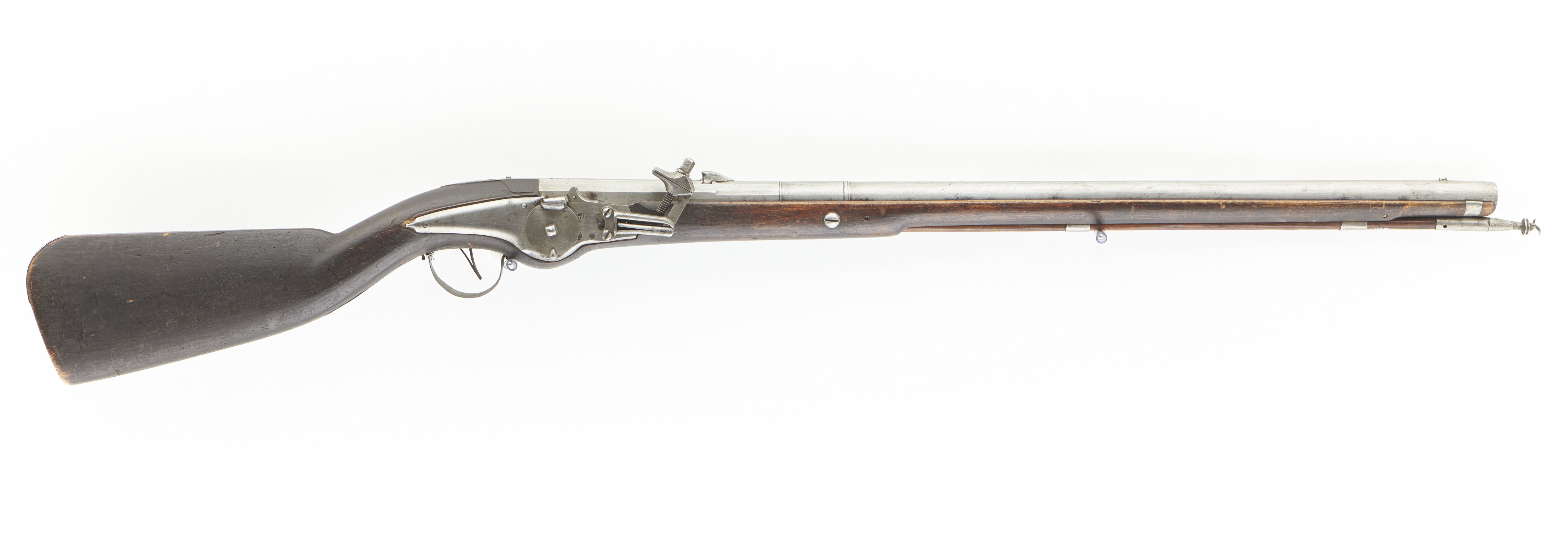 Hjullåskarbin med drag överensstämmande med karbin m:1683 och 1696, enl. inv.1748 hörande till "Kongl. Drabante Konungs Wachtens Mondering". För drabant nr 13. Rund, slätborrad pipa av stål med åttsidig kammare, sextonsidig främre del. Därframför två tvärgående, filade ringar. Rektangulärt svansskruvblad. På kammarens ovansida graverat: "N.13 samt en stämpel iform av en krona (Jönköping?) samt A E. På kammarens undersida en stämpel K?, samt kronstämpeln. Riktmedel: Inlaxat, triangulärt sikte av stål med stora vingar. Stolpkorn av stål. Fästning: Två häften. Pipan fäst med krysskruv underifrån samt två pipstift av stål. Hjullås av fransk typ med svagt välvt låsbleck. Utanpåliggande hjul fäst med en liten, hakformig studel kl. 6. Fängpanna med låg, rak krutskärm, skjutbart fängpannelock. Framför hjulet en stämpel: AE (ligatur, samma som på pipan). Hane med lös underkäke, rak, plan hals, hankropp med rundad yttersida, plan studel med förstärkningslist framtill. Fästning: Tre låsskruvar. Avtryckare: Rak, fjäderbelastad avtryckare. Brunbetsad helstock av björk (al?) med kolv av fransk typ med plan kolvrygg och rundad, svängd undersida. Snidat kindstöd med litet blad framtill. Kolvänden plan med svängd övergång till kolvryggen. Beslag av stål. Liten bakplåt över kolvhälen. Karbinstång med ring. I framänden en liten platta, fäst med en genom framstocken gående skruv. Baktill en platta med två nedåtriktade, filade flikar, plattan utgör samtidigt sidbleck och är fäst med den mellersta och bakre låsskruven. Två släta rörkor och näsband. Slät, bandformig bandformig varbygel av fransk typ, främre skruven krysskruv, bakre armen fäst med två stift. På kolvänden ristat "LW E" samt inslaget en rektangulär stämpel "E N".