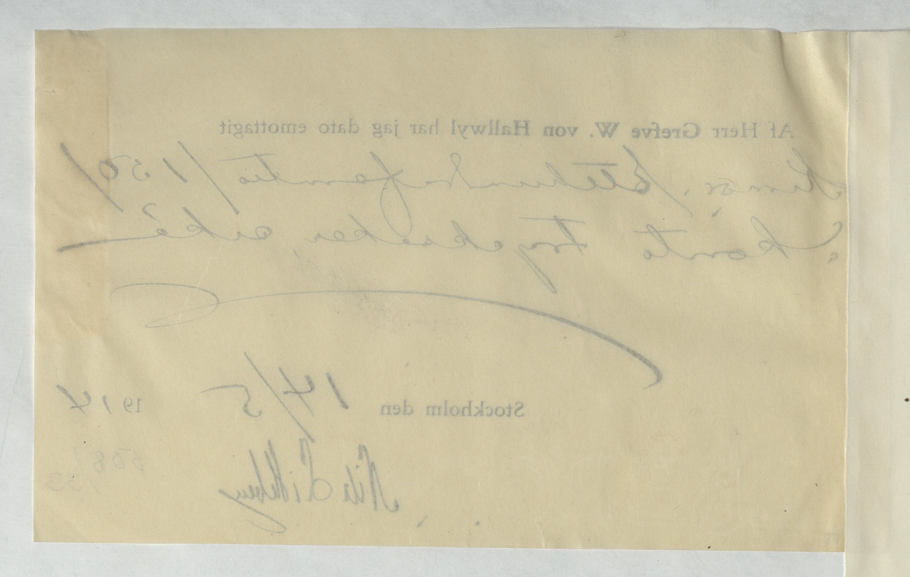 Kvitto gällande pengatransaktion mellan Walther von Hallwyl och Nils Lithberg. Stockholm, 1914.