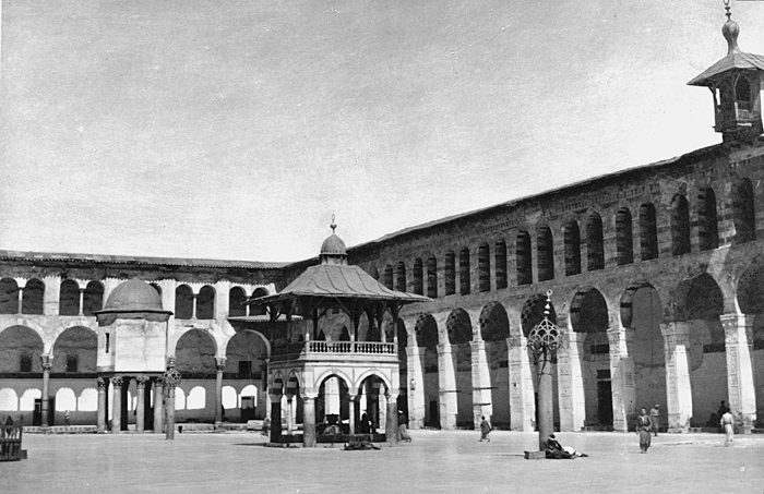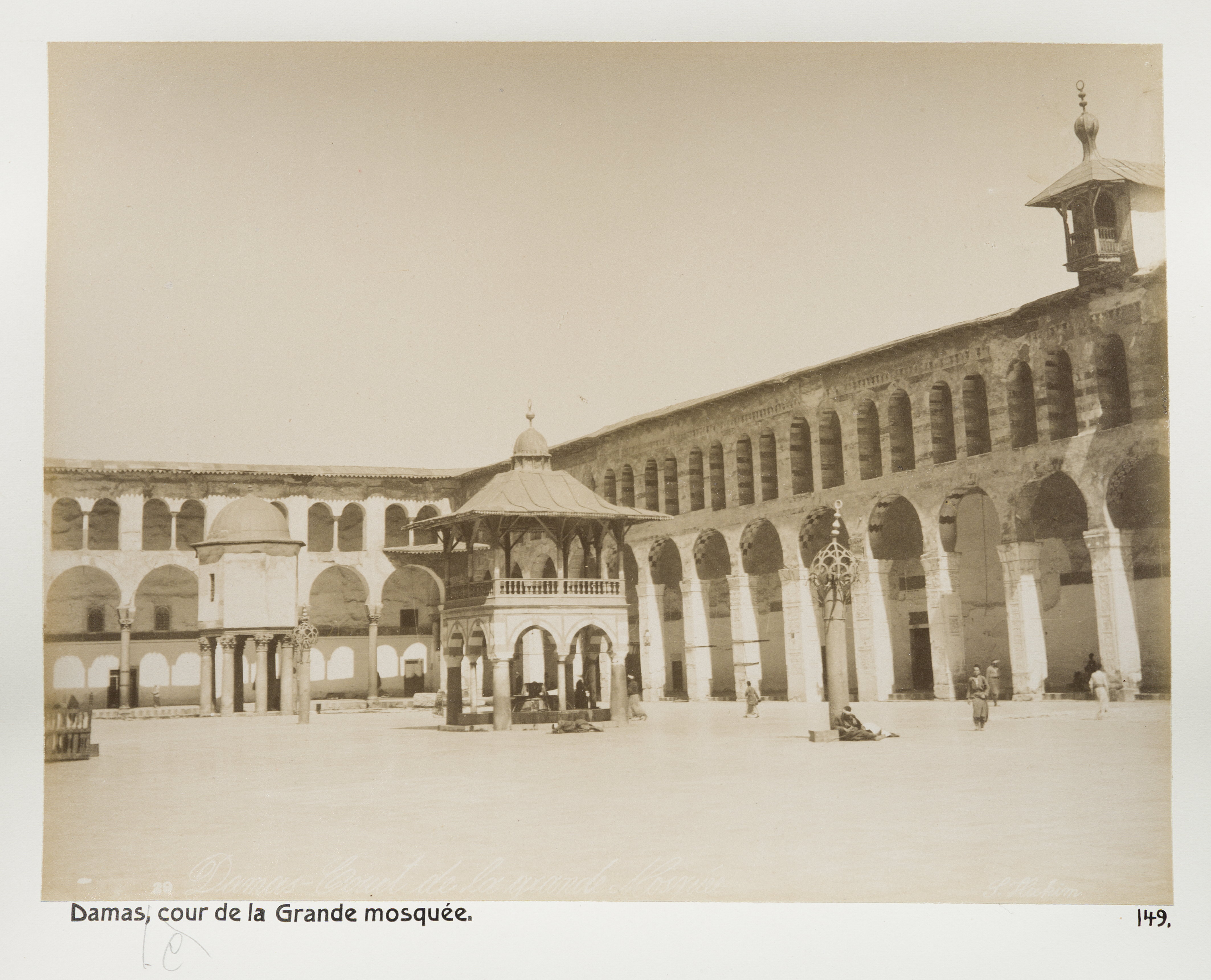 Den stora moskéns gård, Damaskus. Text på originalet: "Damas. Cour de la Grande mosquée." Fotografierna LXVI:N.01.-180. kommer från resan till Palestina och Syrien som Wilhelmina och Walther von Hallwyl gjorde den 30 mars-27 april 1901. De lämnade Sverige den 5 november 1900 för Egypten, där de stannade till den 28 mars 1901, då de fortsatte till Palestina. Med på resan var Wilhelminas sällskapsdam, fröken Ida Uhse. Den 27 april fortsatte de till Turkiet och Mindre Asien. De mindre fotografierna (utom de från Samos) LXVI:N.90.-100. är tagna av Wilhelmina själv, under en resa till häst från Jerusalem till Damaskus 8-20 april 1901. Övriga fotografier är inköpta av Wilhelmina i Jerusalem, Damaskus och Beirut. Alla uppgifter kommer från Ida Uhses reseanteckningar.