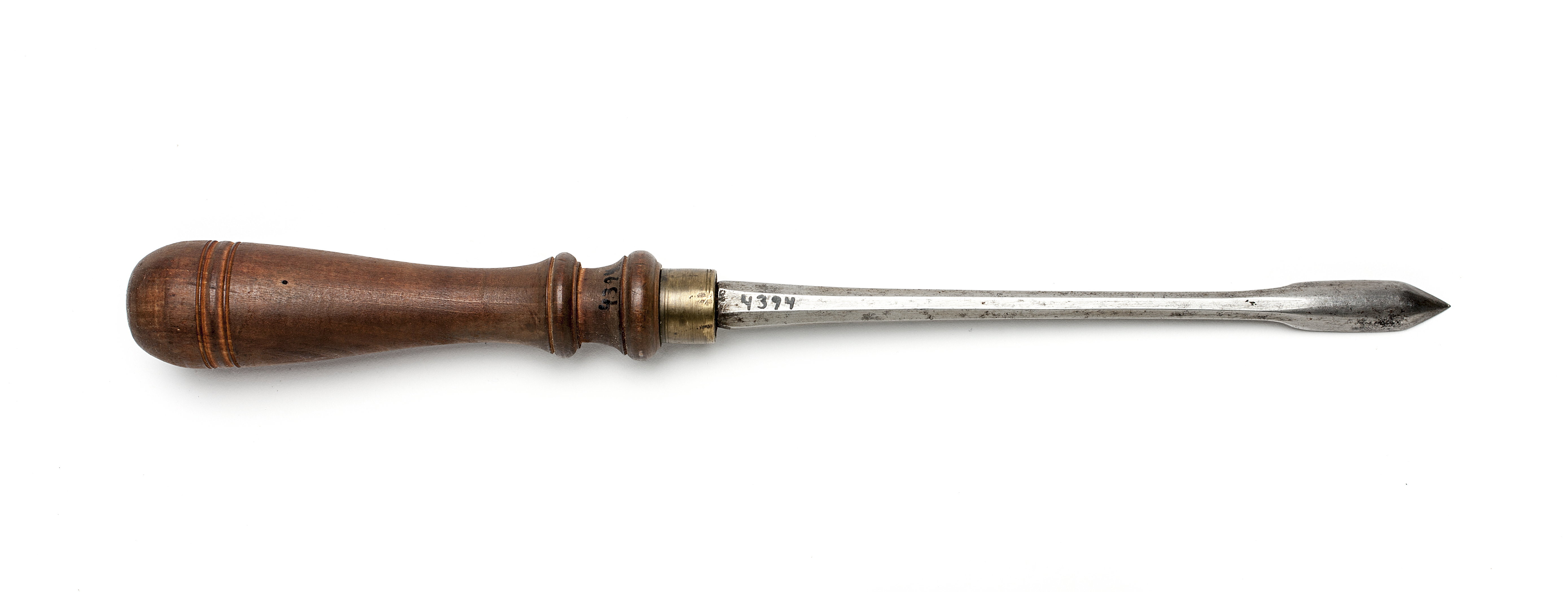 Klinga med åttsidig, i änden halvcirkelformad genomskärning. Stämplat på klingan: "IK" under krona, Johan Kesemaker, Stockholm. Svarvat skaft av päronträ, med två vulster nedtill ("rydboholmstyp"). Mässingsring. Stämplat på skaftet: "I".
