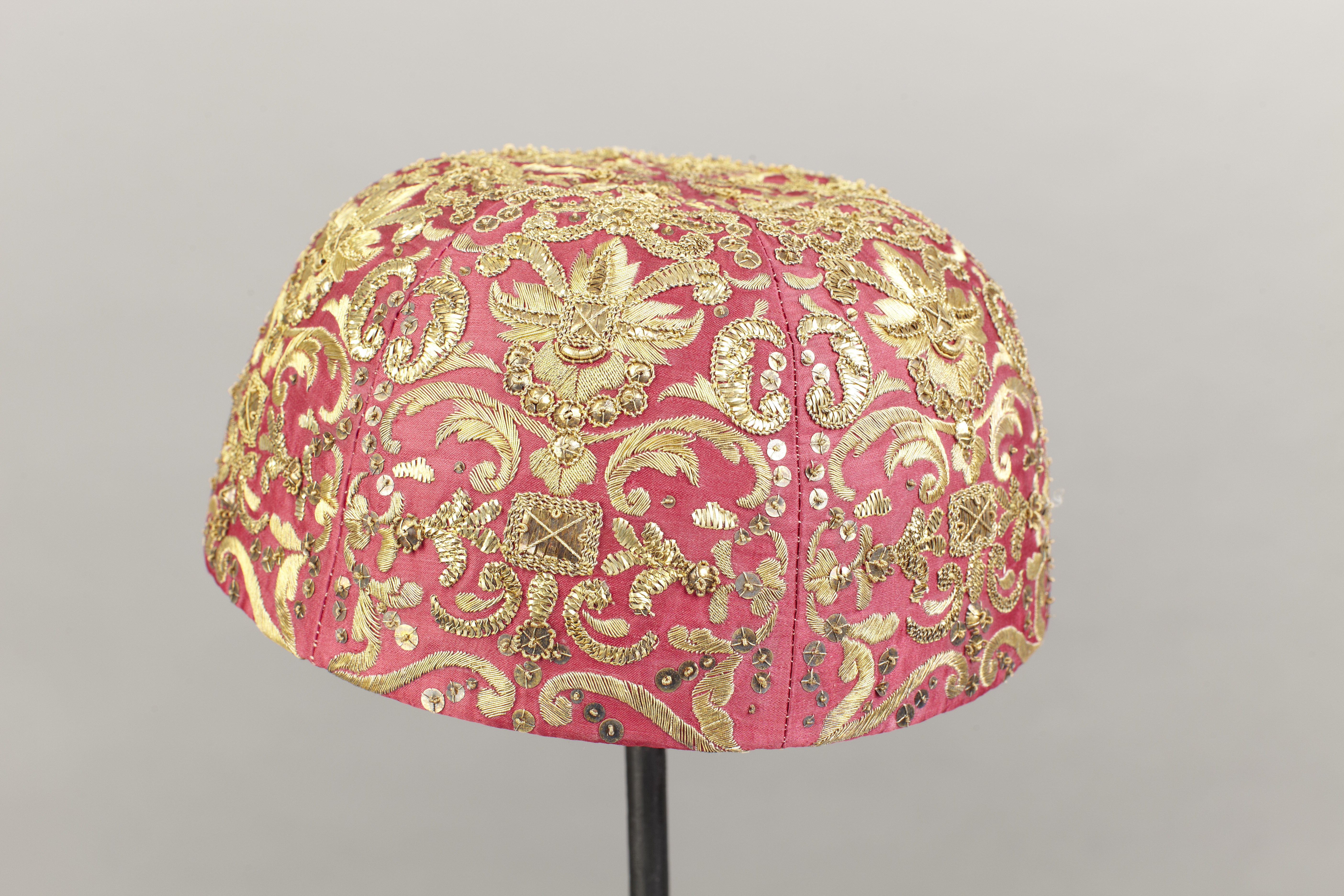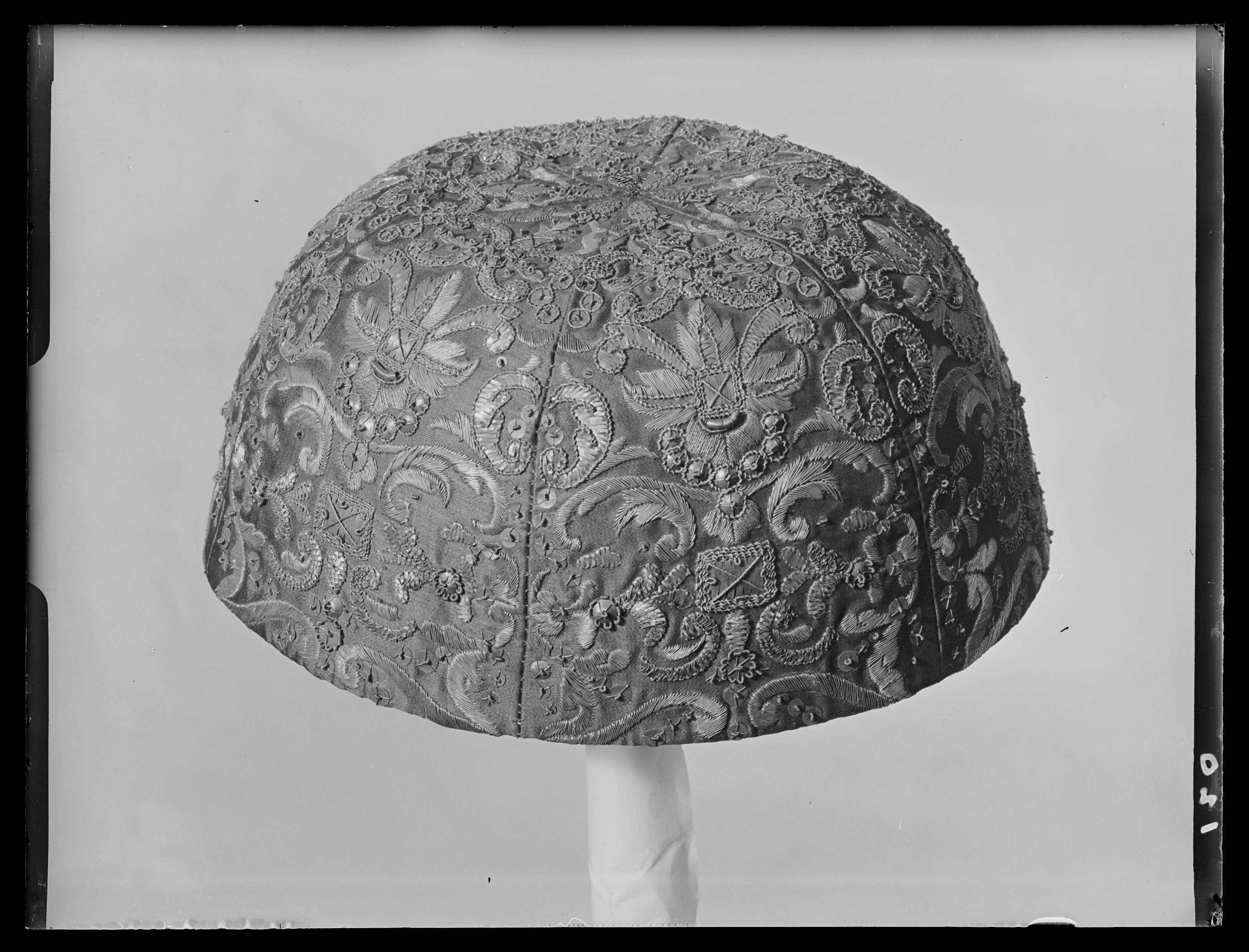 "har fordom suttit i någon af de kungliga kronorna". Kalott sydd av sex kilar av karminröd sidenatlas. På varje kil nästan yttäckande dekor i form av bladrankor av guldlan, kantiljer och paljetter. Stomme av grovt, gråsvart tyg (?). Foder av svagt randig, blekblå sidenatlas (?) i två stycken, ett stycke i hjässan och ett snedskuret stycke nedtill, sned söm. På fodret skrivet med bläck: 3348:6 (SHM nr).