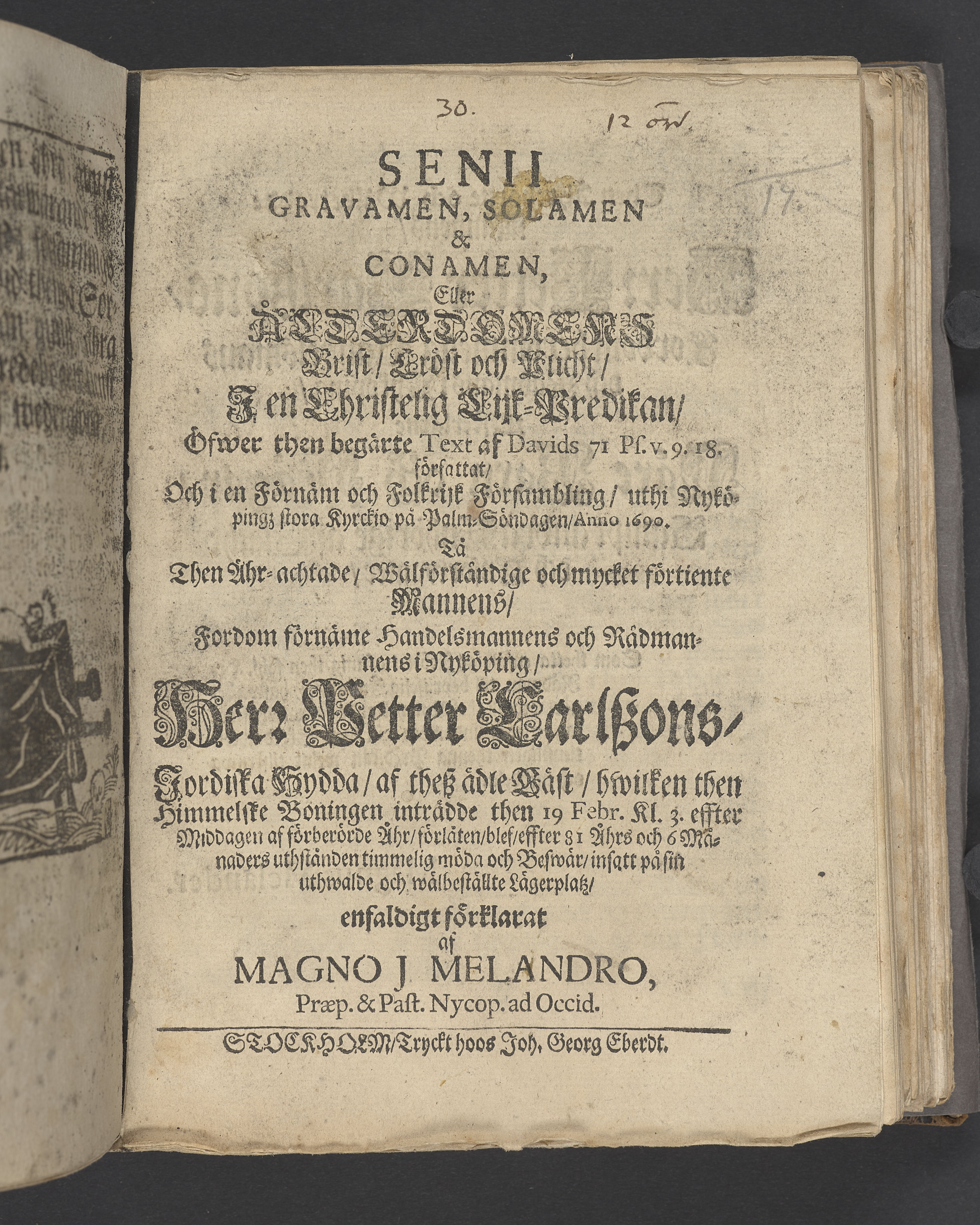 Senii gravamen, solamen & conamen, eller ålderdomens brist, tröst och plicht, i en christelig lijk-predikan ... vthi Nyköpingz stora kyrkio på palm-söndagen, anno 1690. Tå ... handelsmannens och rådmannens i Nyköping, Herr Petter Carlszons, jordiska hydda ... förlåten blef ... förklarat af Magno J. Melandro ... Stockholm, tryckt hoos Joh. Georg Eberdt.