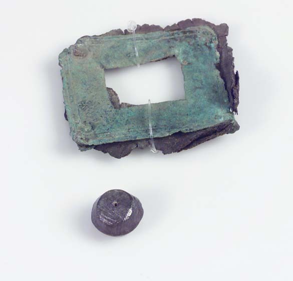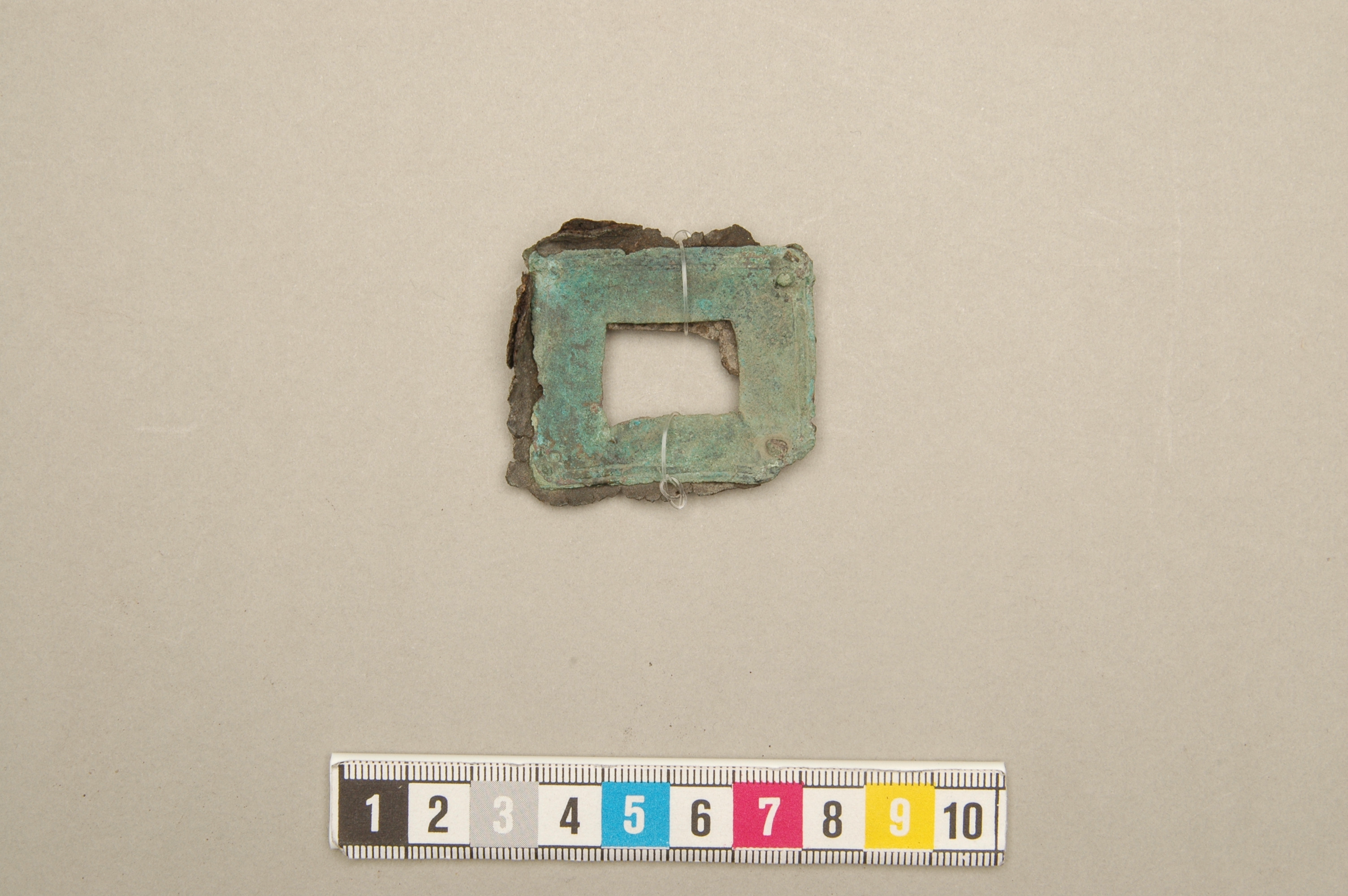 Rektangulärt mittbeslag till bältesväska. Under beslaget bevarade läderfragment.