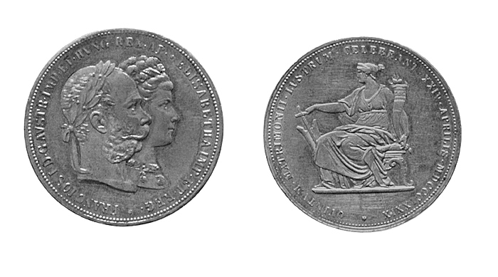 SILVER. 2 Gulden 1879. Åtsida: Kejsarens och kejsarinnans Elisabeths huvudbilder i profil åt höger; kejsaren lagerkrönt; kejsarinnan med diadem och halsband med två rosenformade kläppar. Nedtill en liten sexuddad stjärna. Kring kanten en pärlstav. Frånsida: Sittande kvinnofigur, vänd halft åt vänster, i veckrik dräkt, högra handen på ett antikt roder, i den vänstra ett ymnighetshorn. Nedtill en liten sexuddad stjärna. Kring kanten en pärlstav. Rand: Med intryckt myntvärde (på tyska och ungerska språken). Mått: Vikt: 24,6 gr. Diameter: 36 mm. Präglat på uppdrag av staden Budapest med anledning av kejsaren och kejsarinnans silverbröllop 24 April 1879. Medfört av Johanna Kempe från resa i Tyrolen något av åren på 1880-1890-talen.