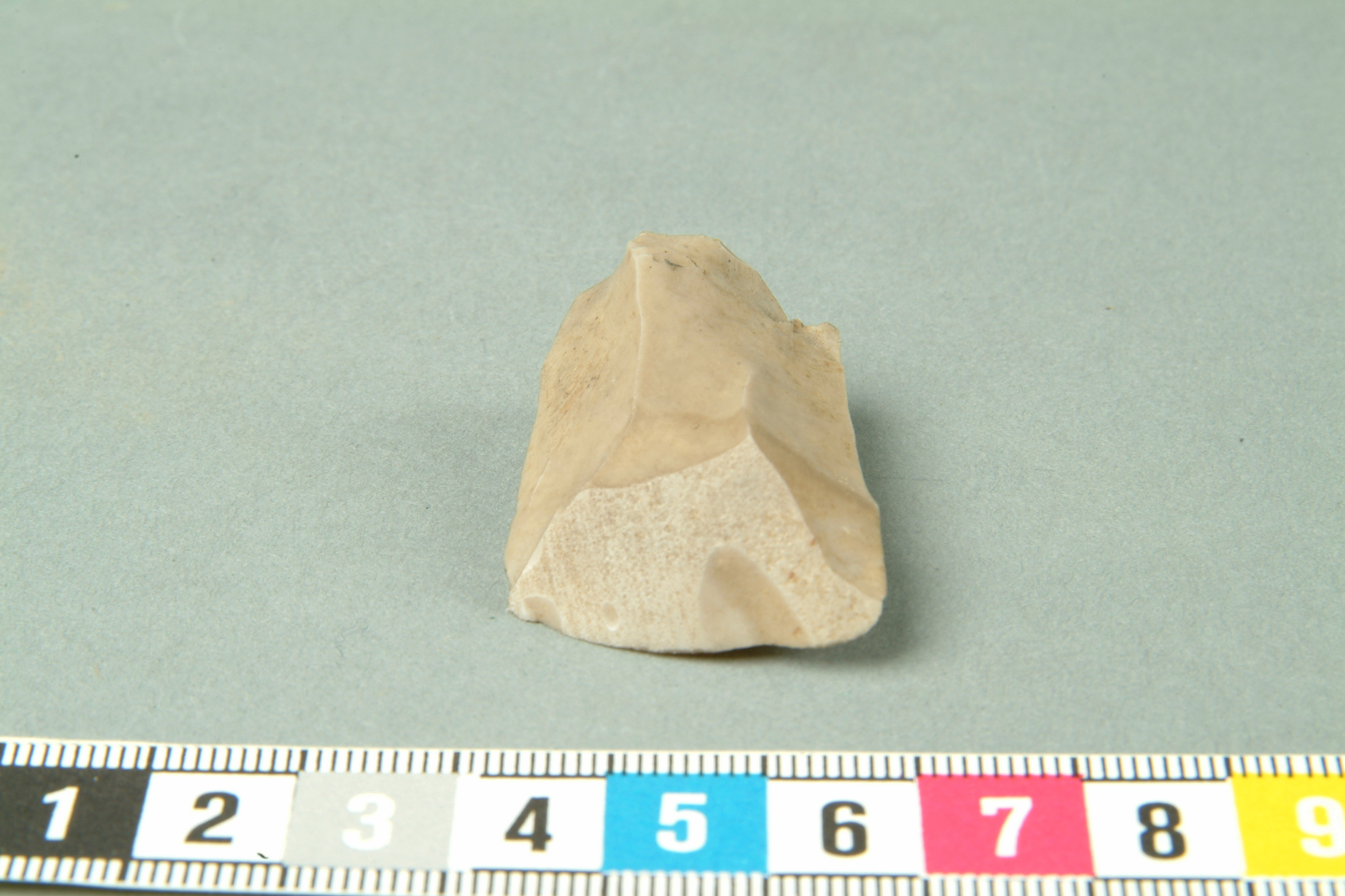 Avhugget stycke av ett flintredskap med slipad sned egg.