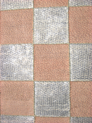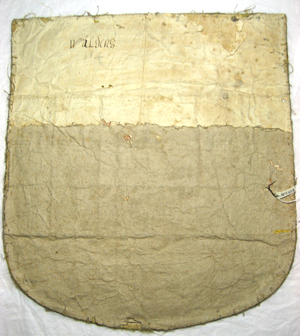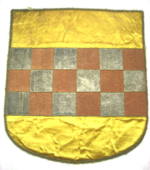 Vapensköld av lejongul sidenatlas med en bred broderad balk i ett schackrutemönster i silver och brunt, av silvertråd och av brun silkestråd. Balken samt vardera ruta, sammanlagt 18 rutor, kantas av an smal snodd av silvertråd. Skölden kantas runtom av en tjockare och en smalare snodd av silvertråd ett smalt silverlan samt av vit silkestråd omvirat av silvertråd utdragen i små öglor. Vapet är fodrat med beige linnelärft och på baksidan klätt med ljus, samt grå makulatur.