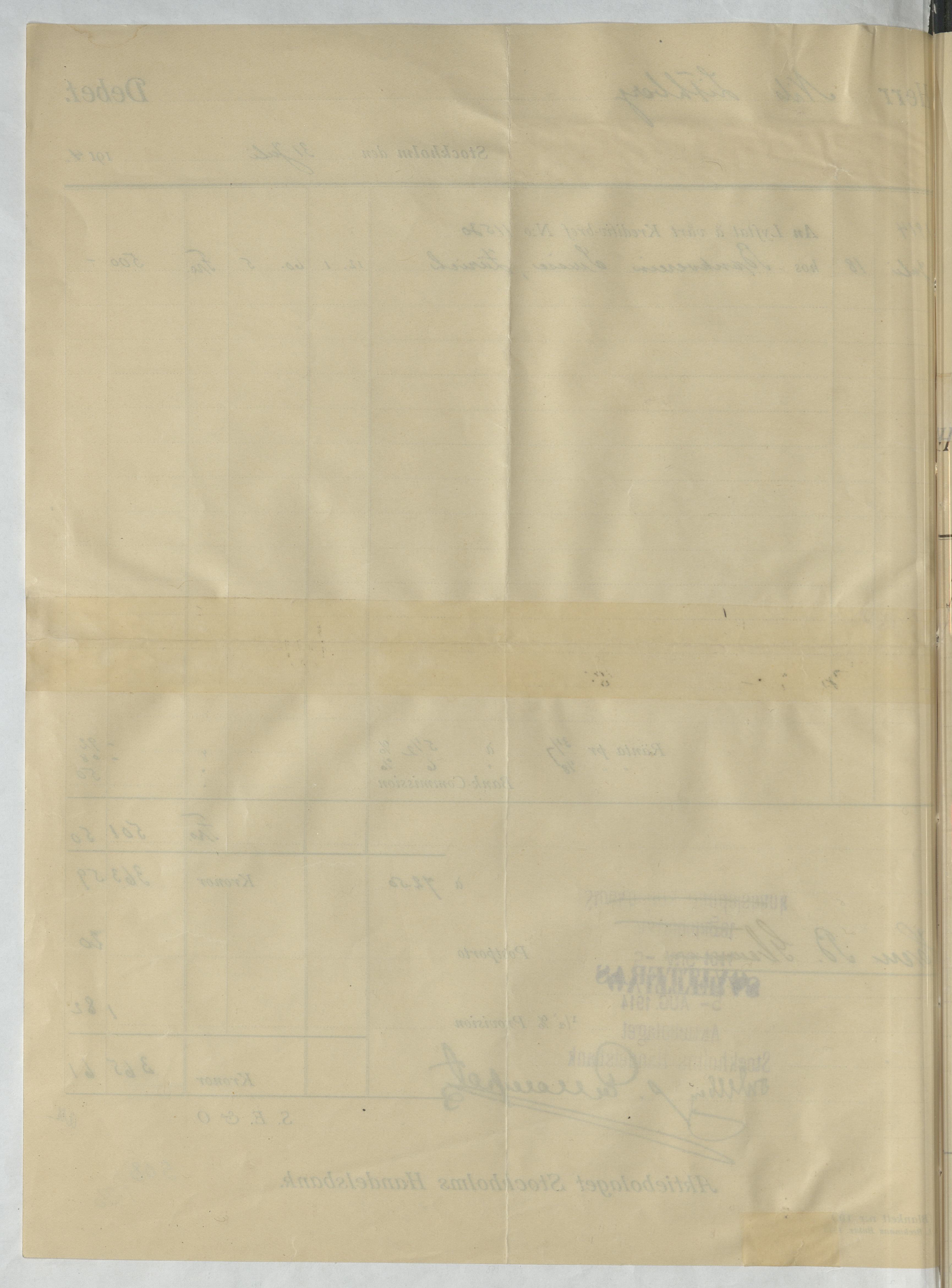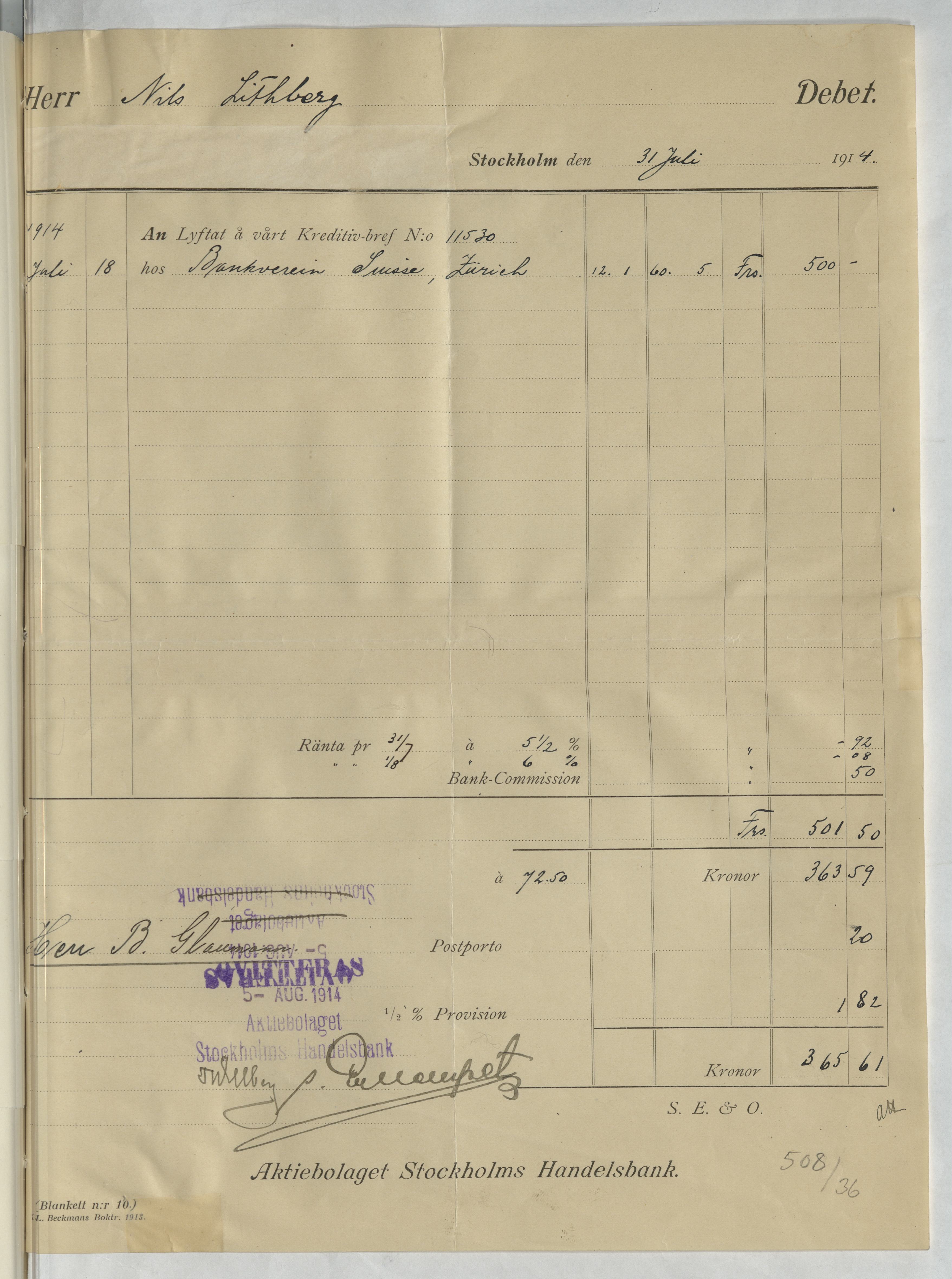 Verifikation från Aktiebolaget Stockholms Handelsbank. Stockholm, 1914.