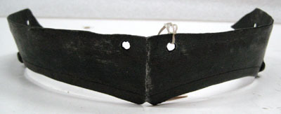Välvd skena av svärtat stål. Centrerad mittås, nertill avslutad med spetsig infilning. Längs nedre kant tre spetsar, filad enkel linje och en ca 6 mm bred bård med rester av förgyllning.