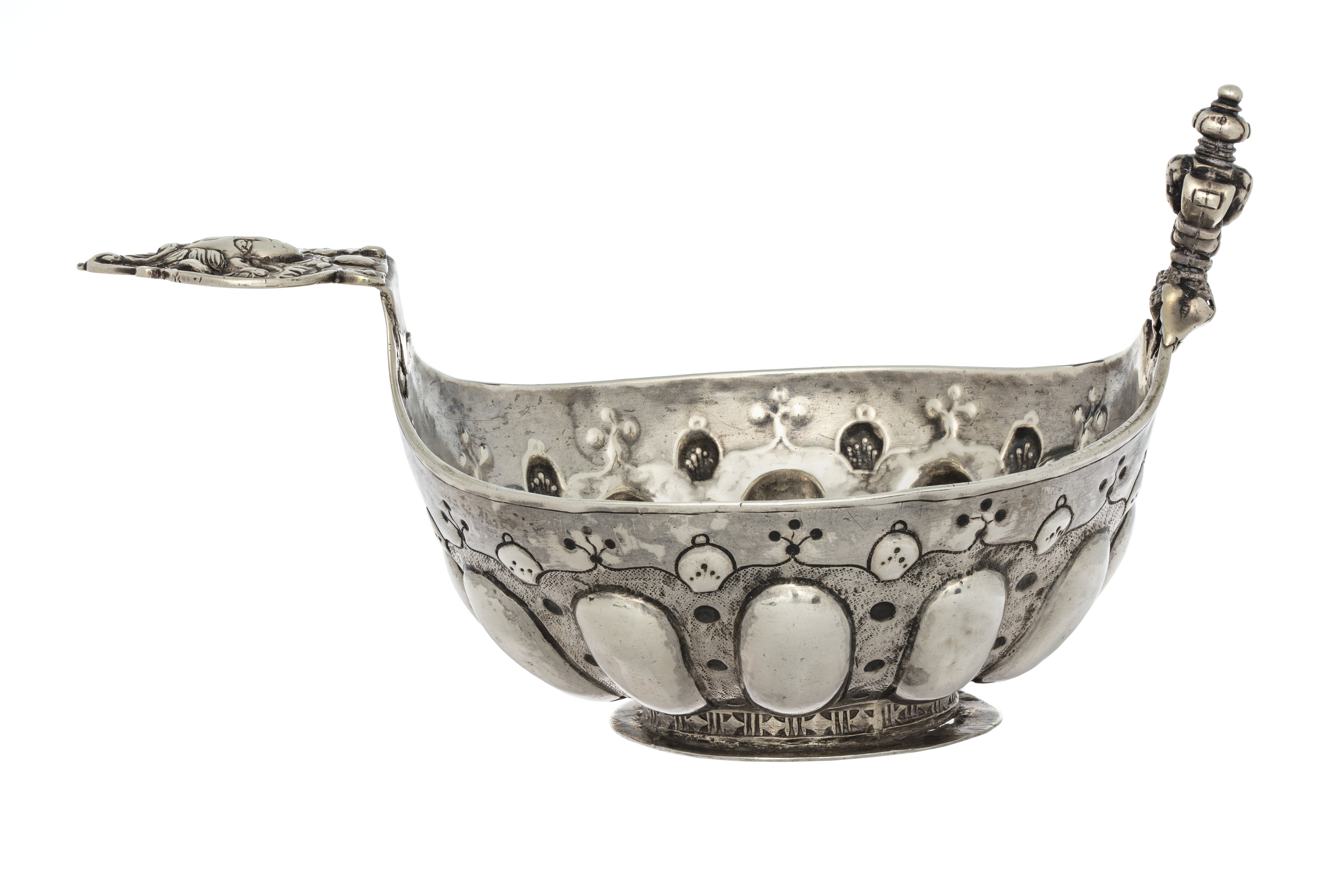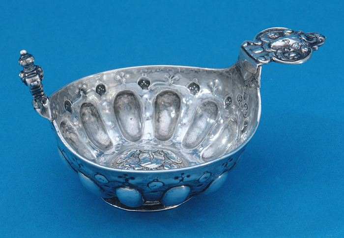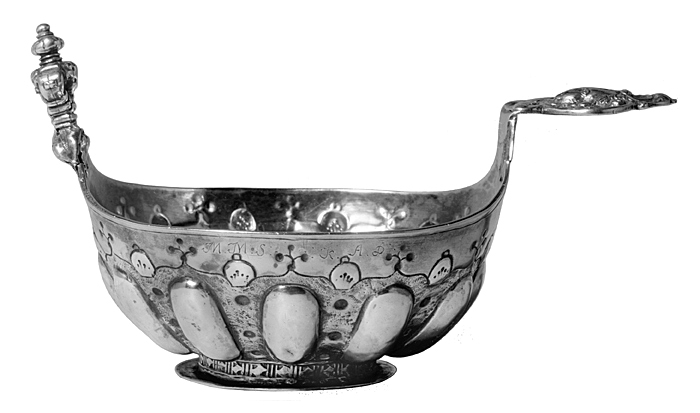 Oval, runt livet tolv utdrivna bucklor samt punsad och graverad ornamentik, i botten drivna och ciselerade frukt- och blomornament; handtag med kerubhuvud, kerubknopp. - " - Oval, tweleve raised bosses and punched, engraved ornamentation round the body, embossed and chased fruit and flower ornaments in the bottom; handle with cherubs head, cherub finial. Gåva till Walther von Hallwyl julaftonen 1889 från Wilhelmina von Hallwyl, inköpt av den sistnämnda för 85 kr.
