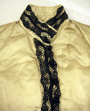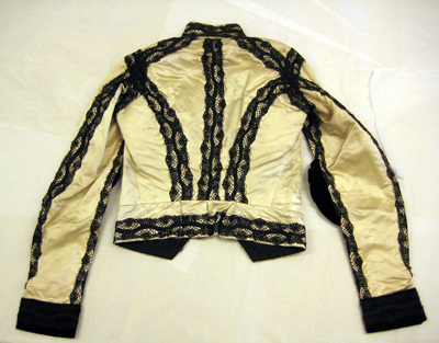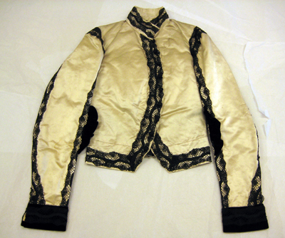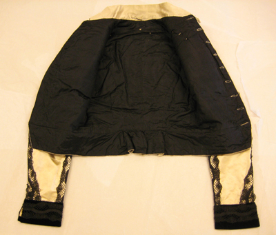 Midjekort jacka av vit sidenatlas, kantad och garnerad av svarta gallerspetsar av snörmakeriarbete. Framstyckena är mot varandra rundade, vadderade upptill i brösthöjd. Knäppningen består av nio små runda knappar klädda med snörmakeriarbete av svart silketråd. Jackan har en ståndkrage garnerad med svart spets, b. 60 mm. Ärmarna, likaså garnerade med svart spets, har vid ärmsluten ett slag av svart sammet, b. 74 mm. Vid ärmsluten förekommer ett sprund vilket knäpps i dess överkant med en svart snörmakeriknapp. Vid ärmvecken sitter på vardera ärm påsytt en svart rynkad sammetsvolang som en ros. Vid midjan går en söm som bildar en kort skört och mitt bak förekommer tre insydda veck näst intill bildandes kappor. Jackan är på insidan fodrad med svart siden och med en mjuk vaddering vid framstyckenas bröst.