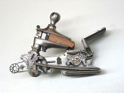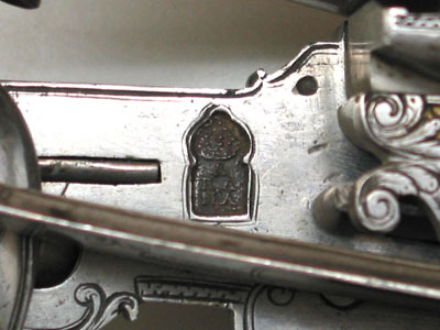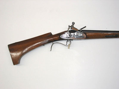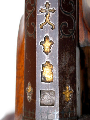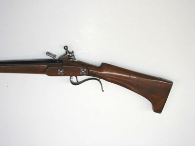 Rund, vid kammaren åttsidig, brunerad, slätborrad pipa. Vid pipbasen inslagen silverdekor i form av korsbård. Därframför guldstämplar (guldet delvis borta), kvadratisk stämpel med lejon med krona om halsen (?), därframför krönt stämpel: "MU // ROS" (LRK vägl. 1921:329) samt tre liljeliknande ornamentsstämplar, en på vardera översidan, därframför ett devotionskors, omgivet av silverrankor. Framför stämplarna silverrankor i två fält. Vid övergången till den runda delen blad i relief mot förgylld bakgrund. Obrunerat svansskruvblad med punsade kantbårder och bladrankor. Runt fänghålet en ring av mässing. Riktmedel: Inlaxat, spolformigt korn av silver. Fästning: På pipans undersida en rörka av silver. Pipan fäst med krysskruv underifrån samt pipband av silver. Snapplås alla catalana, plant låsbleck med graverade kantlinjer, runt bakre skruvhålet en blomma. Framför hanen en krönt stämpel (urspr. förgylld?): "A // RA // NA" (1921:314). Hane med graverad dekor på foten. Kraftiga, rektangulära käkar, päronformigt käkskruvhuvud. Studel med blad mot förgylld bakgrund, runt axelskruven en bladkrans. Rektangulär fängpanna med åsad undersida, på framkanten en sicksackbård. Vinkelrätt batteri med kvadratiskt eldstål, räfflad slagyta, baksidans kanter fasade, graverad dekor med bladbårder och festong. Över batterifjädern en profilerad skärm med bladrankor mot förgylld bakgrund. Utvändig slagfjäder som trycker på hälen, skålad fasning på kanterna. Fästning: Två låsskruvar. Åttaformigt svängd avtryckare. Halvstock av ljusbrunt trä, kolv av katalansk typ. Konturerad, slät hälkappa med rektangulär flik på kolvryggen, rundad spets, graverade kantbårder och rankor. Korsformiga låsskruvbrickor av silver. Konturerat beslag av silver bakom pipbandets stoppfjäder, punkterad dekor. Näsband av silver. Varbygel av stål, s-formigt svängd bygel, baktill kraftigt nedåtsvängd till fingerläge, omvänt c-formig bakre stolpe, konturerad bakre arm. Kort, bred, konturerad främre arm, framtill avslutad med ett graverat blad. Tillbehör: Laddstock av trä, l: 900 mm, framtill skodd med horn, l: 24 mm.