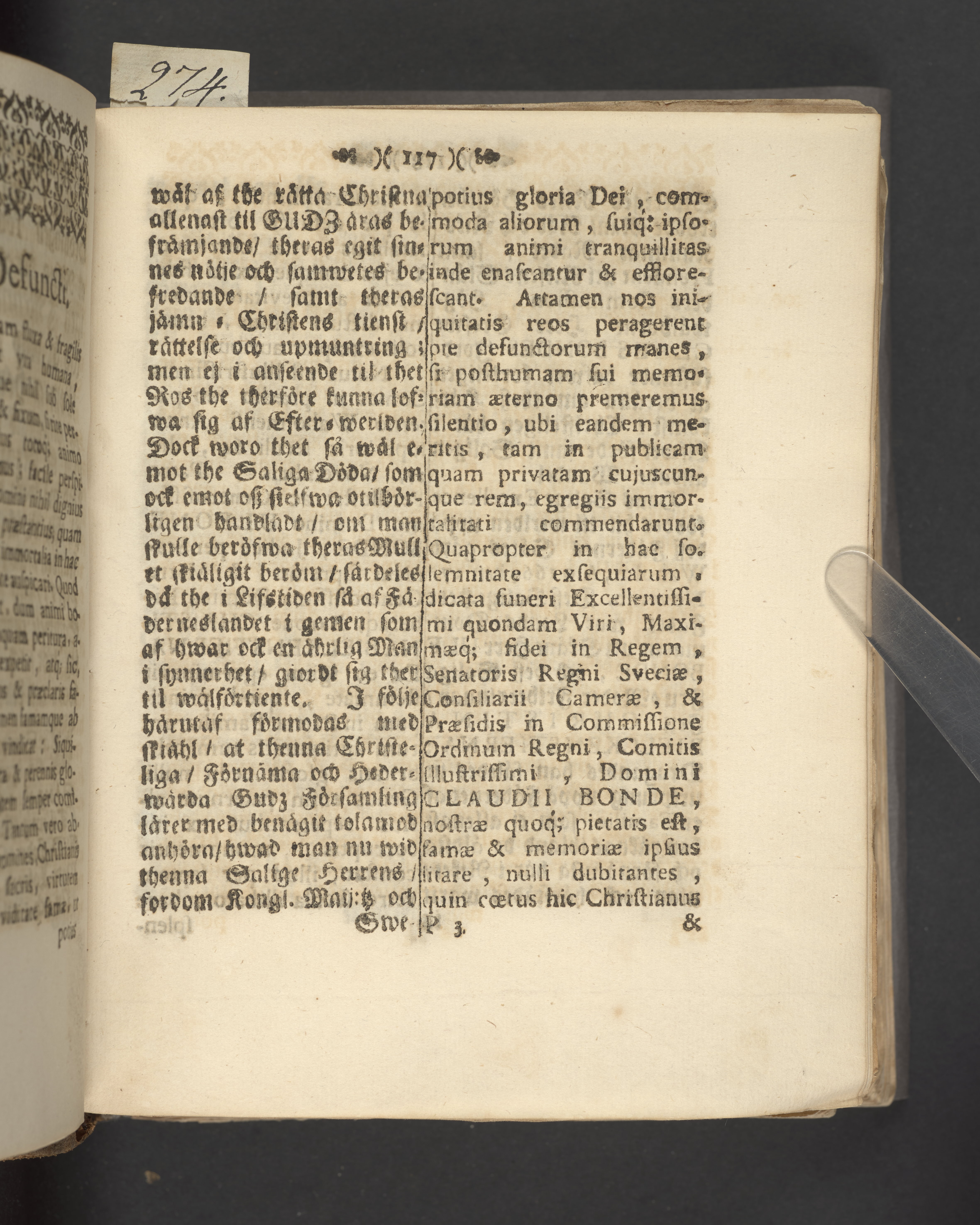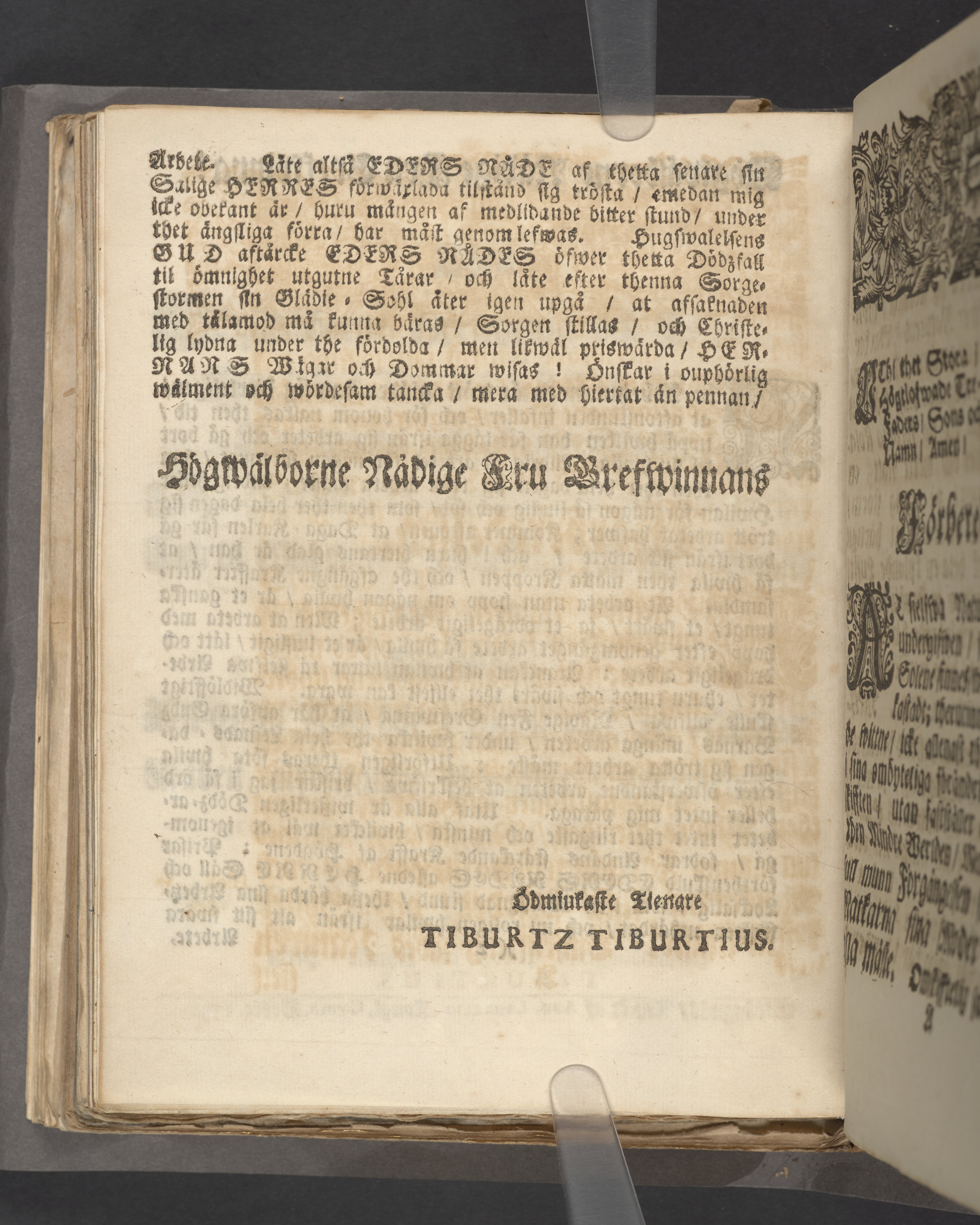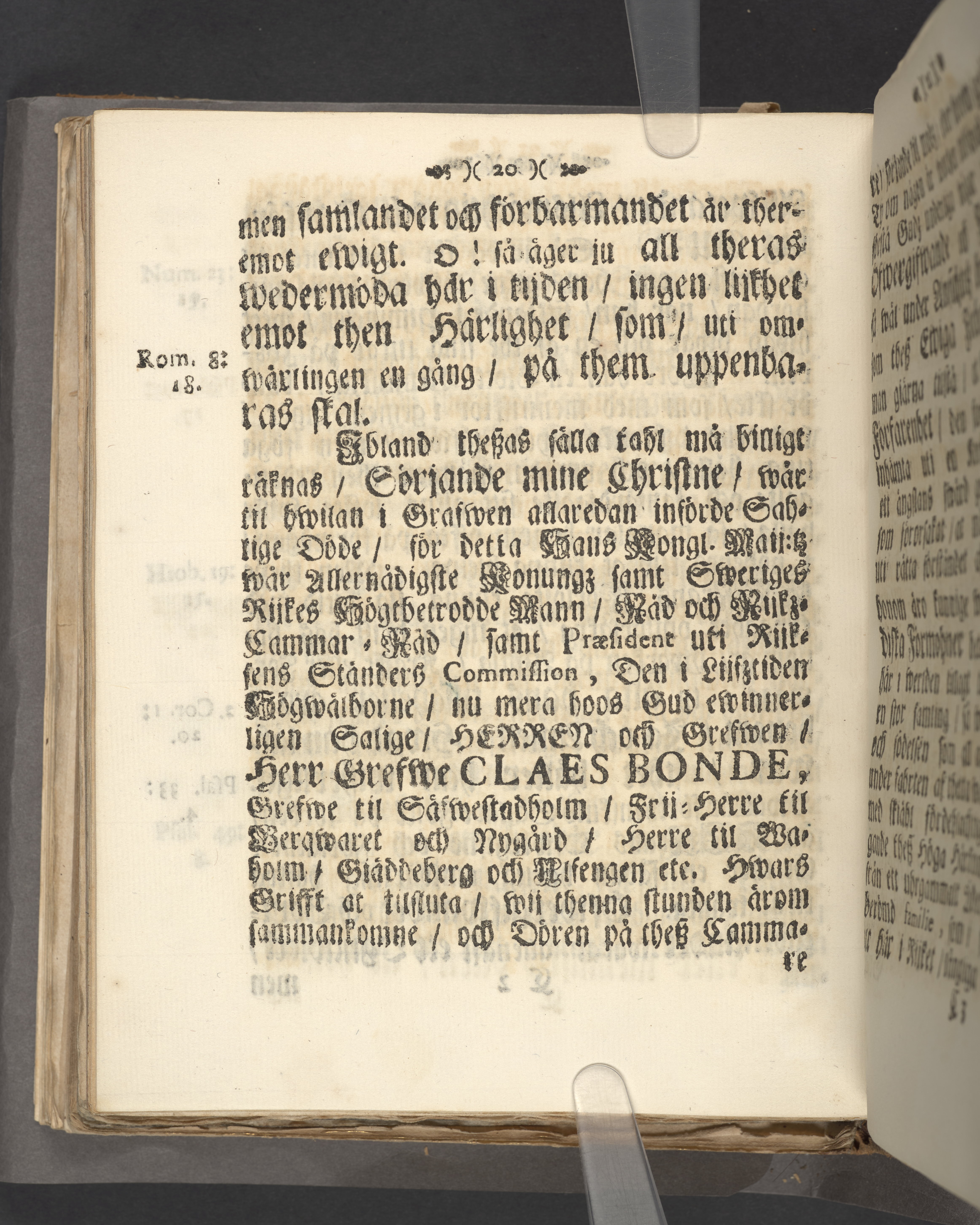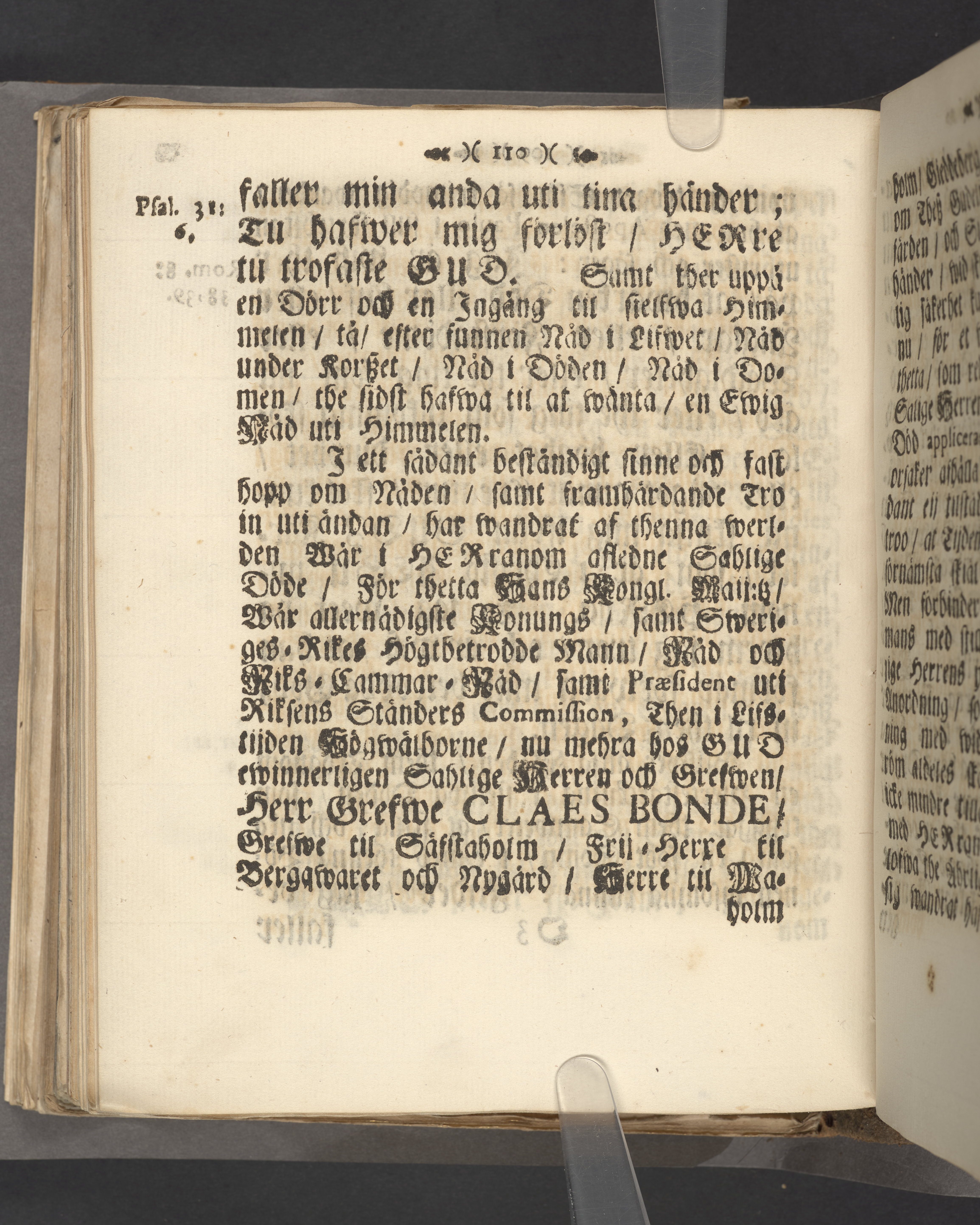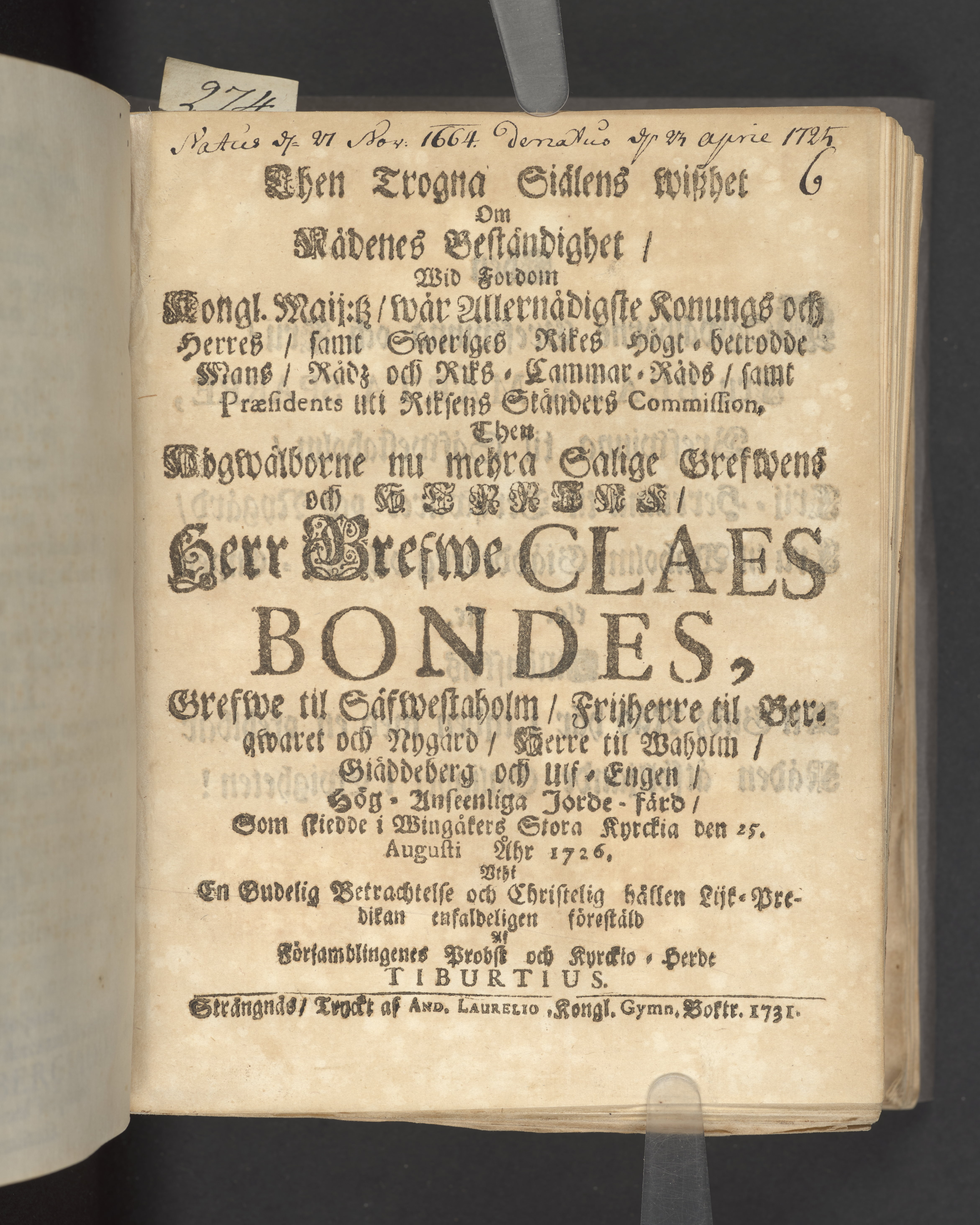 Then trogna siälens wiszhet om rådenes beständighet/ wid fordom Kongl. maij:tz/ wår allernådigste konungs och herres/ Sveriges rikes högt-betrodde mans/ rådz och riks-cammar-råds/ samt Praesidents uti riksens ständers Commission. Then högwälborne nu mera salige grefwens och herrens/ Herr Grefwe Claes Bondes, grefwe til Säfwestaholm/ frijherre til Berqwaret och Nygård/ herre til Waholm/ Giäddeberg och Ulf-engen/ hög-anseenliga jord-färd/ som skiedde i Wingåkers stora kyrckia den 25. Augusti åhr 1726, uthi en gudelig betrachtelse och christelig hållen lijk-predikan enfaldigen föreställd af församblingenes probst och kyrckio-herde Tiburtius. Strängnäs/ Tryckt af And. Laurelio, kungl. gymn. boktr. 1731.