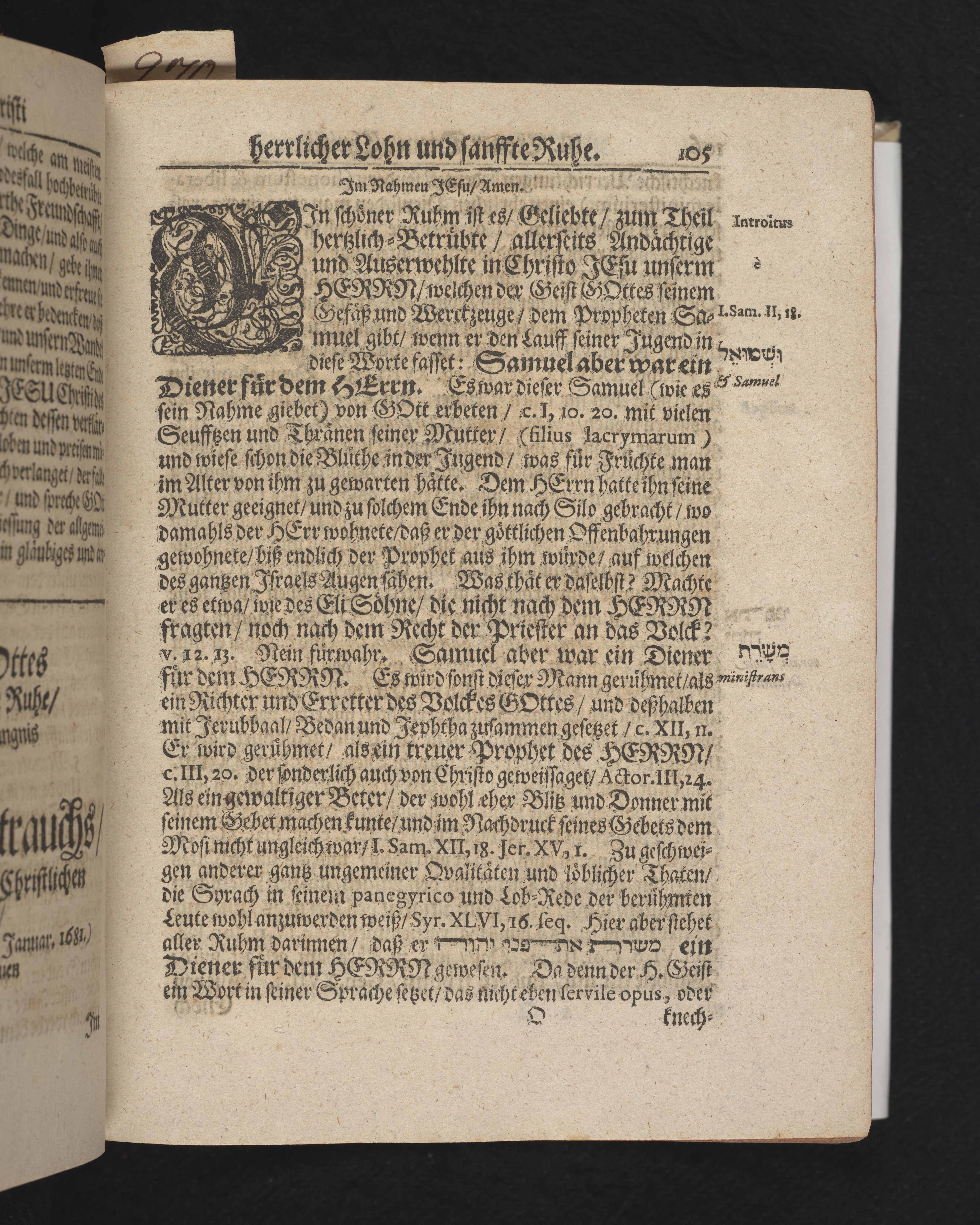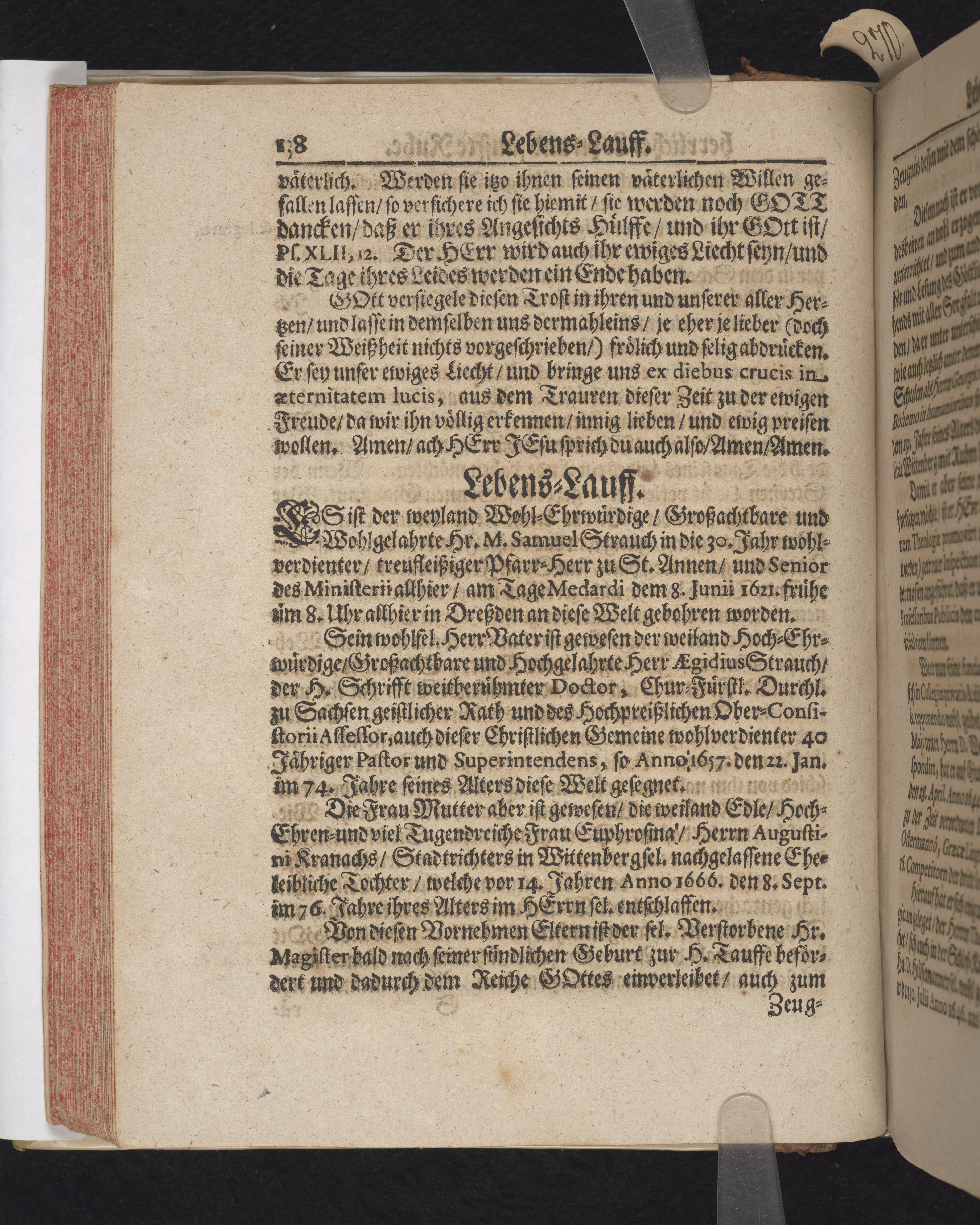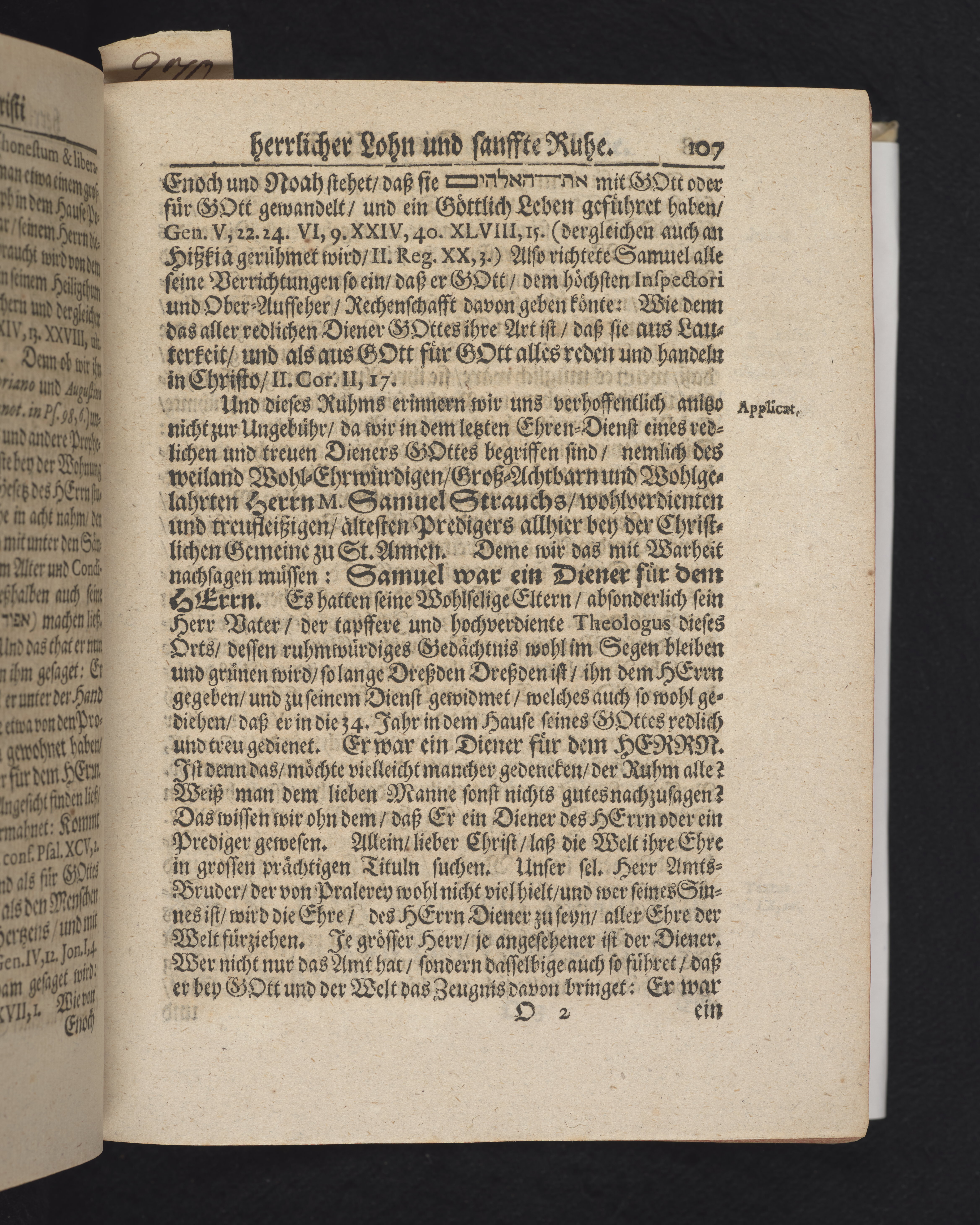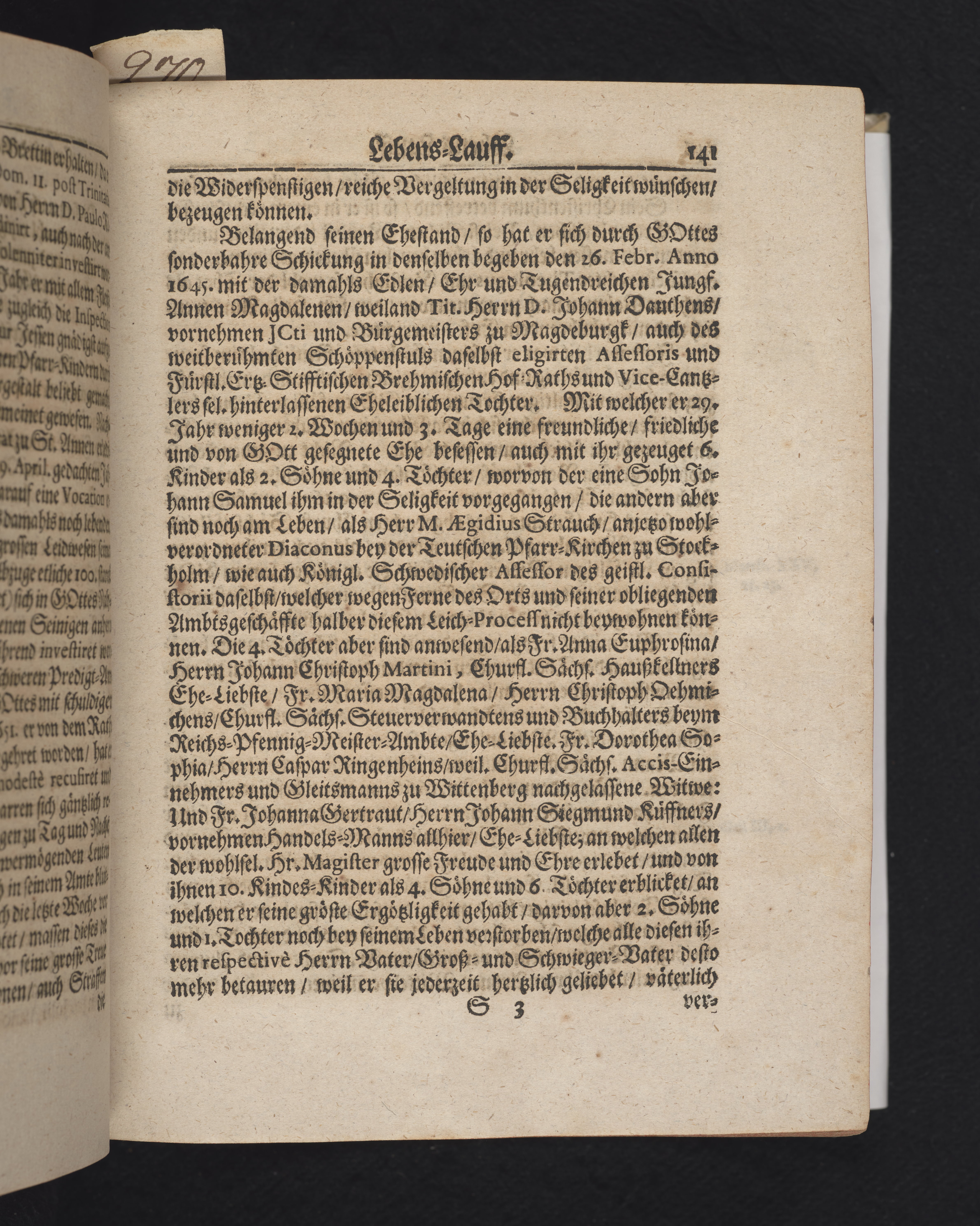 Ingår i en utgiven samling med 28 likpredikningar av Samuel Benedikt Carpzov: Grünende Gebeine, oder Leich-Predigten... Tryckt innehållsförteckning och register. Handskriven innehållsförteckning över de 28 likpredikningarna med bläck på främre försättsbladet (recto och verso).
