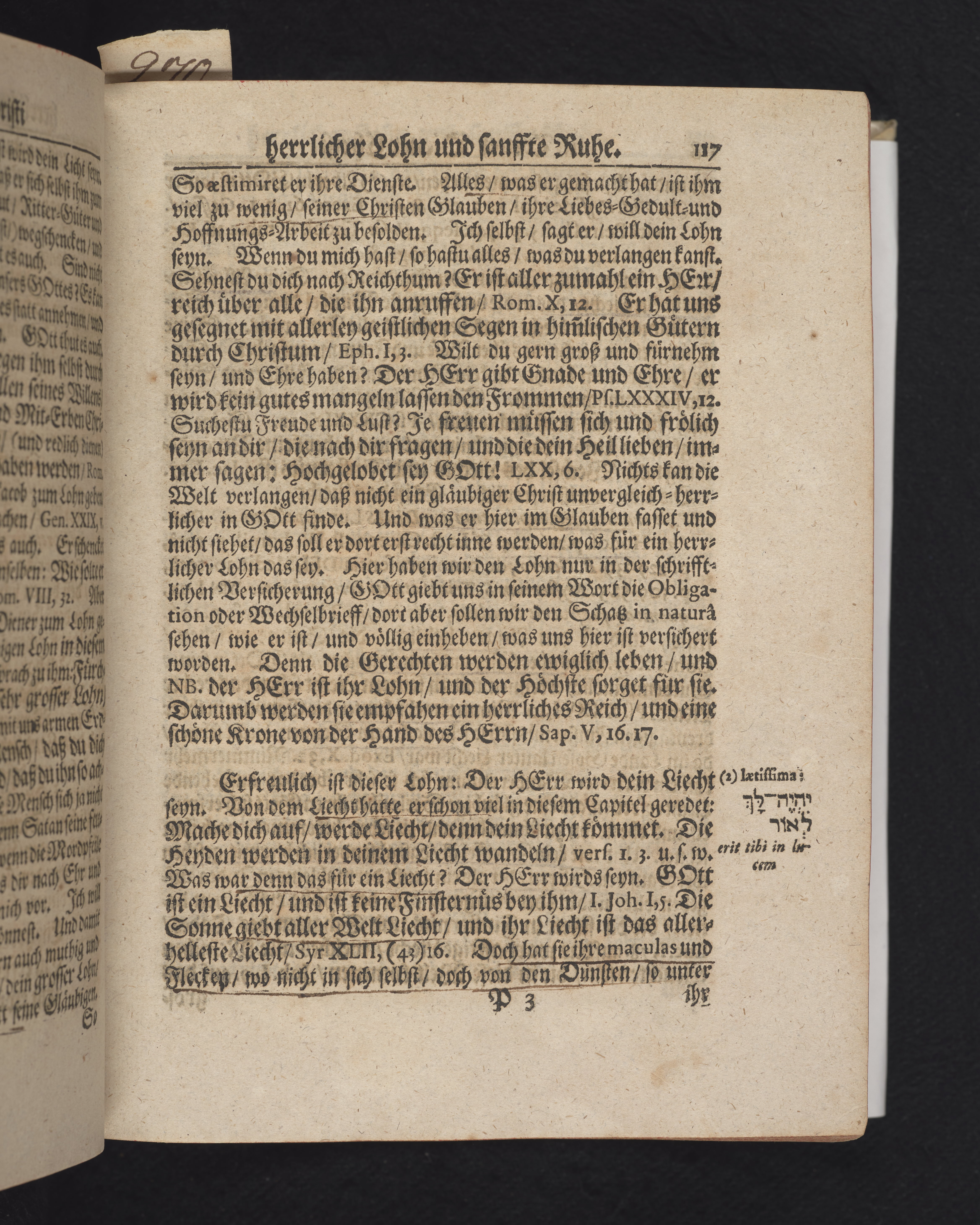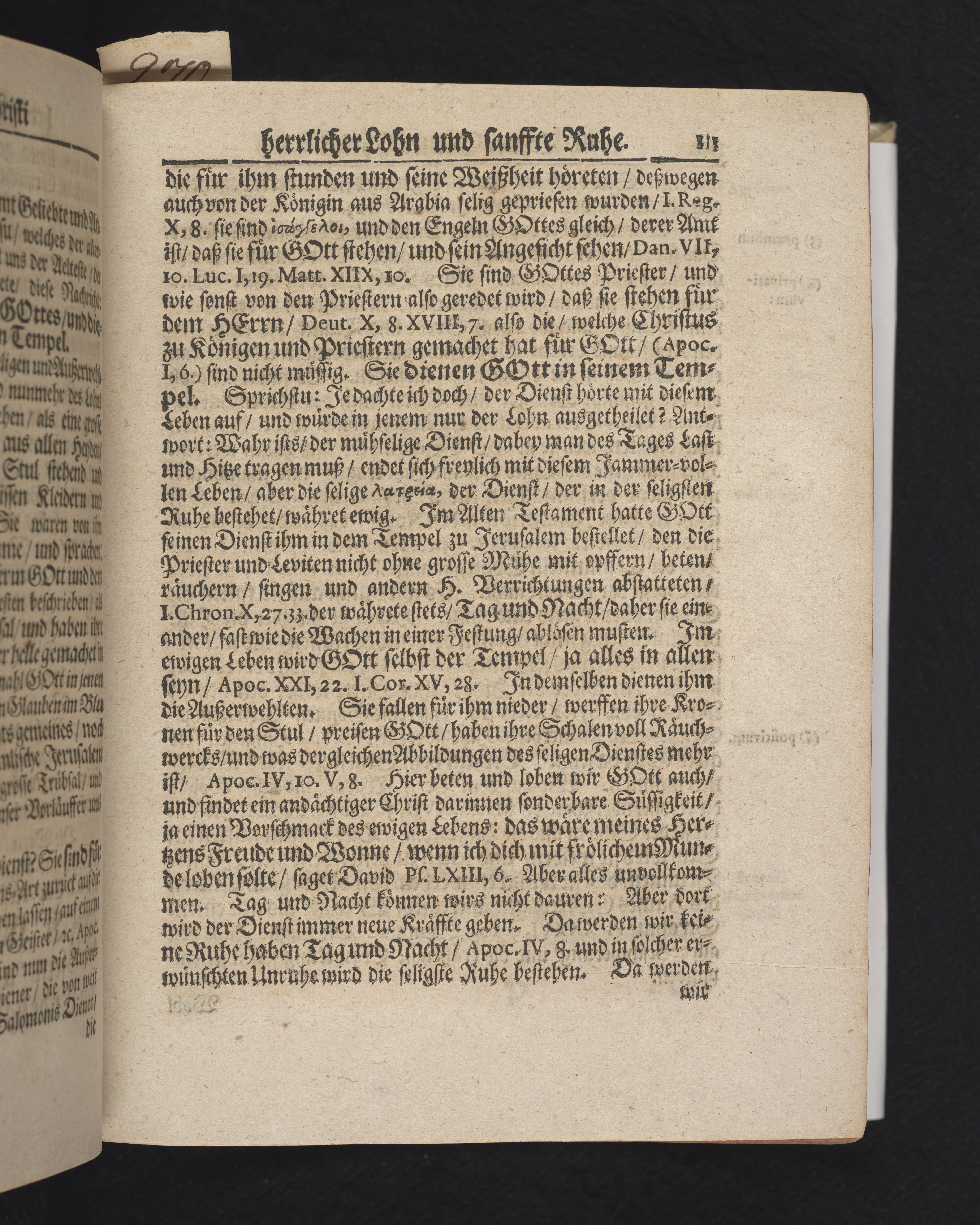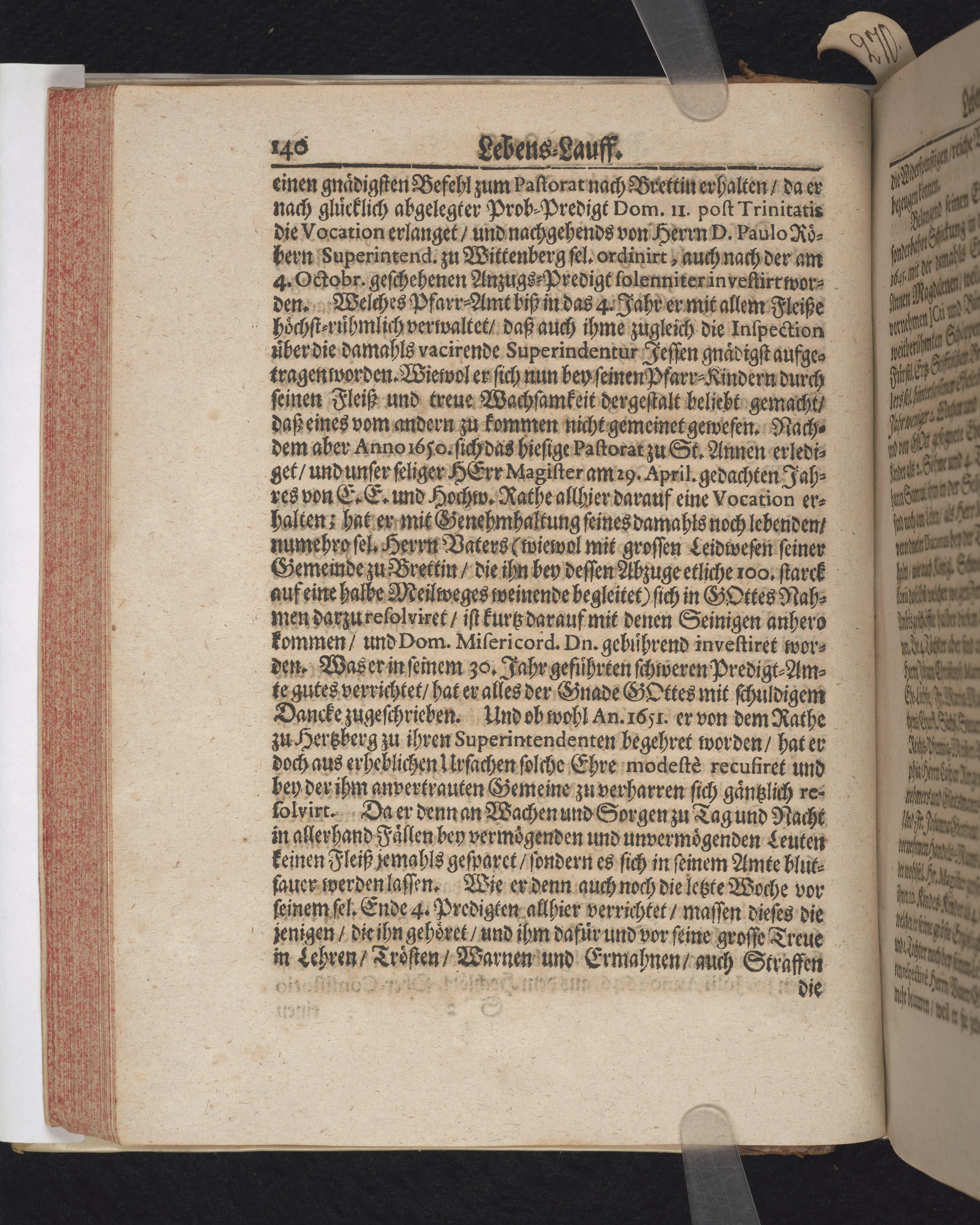 Ingår i en utgiven samling med 28 likpredikningar av Samuel Benedikt Carpzov: Grünende Gebeine, oder Leich-Predigten... Tryckt innehållsförteckning och register. Handskriven innehållsförteckning över de 28 likpredikningarna med bläck på främre försättsbladet (recto och verso).