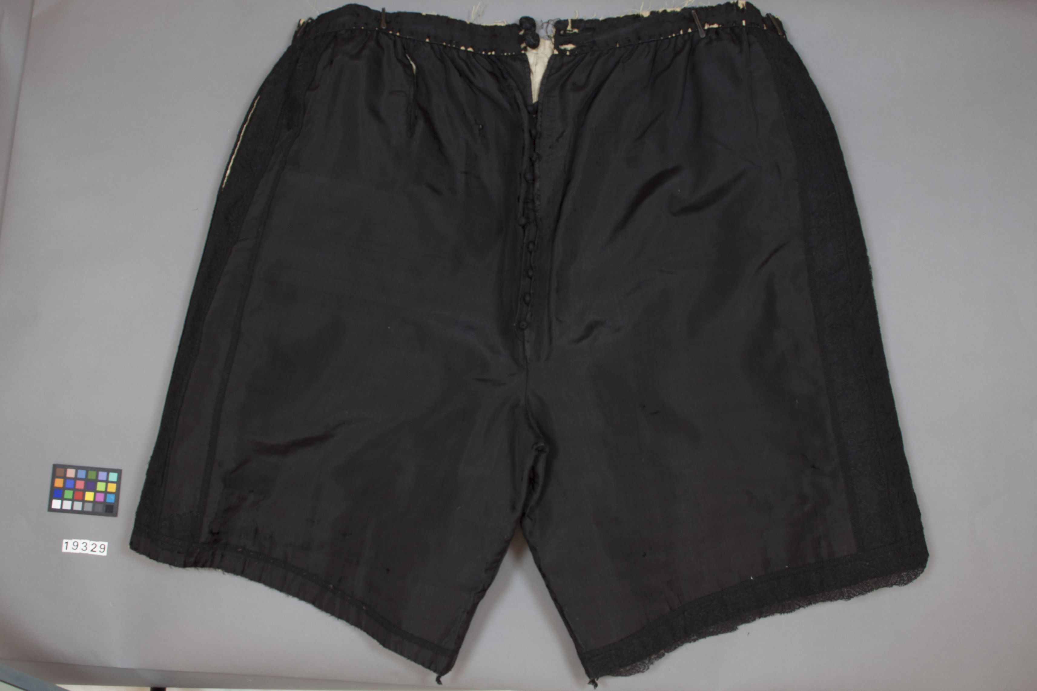 Byxor av svart sidenrips med spetsgarnering. Byxorna är av relativt rak, snäv modell. Tyget är inte skarvat. Staden är invikt i de raka sidsömmarna. Här har också, de stora fickorna placerats, sprunden är 21 cm långa. Framkanterna är rakare än bakkanterna. Framtill är ett 37,5 cm långt sprund med en drygt 30 cm lång knäppslå. På denna finns 10 knapphål. Dessa är 2,5 cm långa (och sydda med 7 á 8 stygn/cm med svart högertvinnat silke). På motsatta sidan sitter alla 10 knapparna kvar. De är av samma typ som tröjans (d: 1,1 cm). Knäppslån är fodrad med samma vita sidenfoder som tröjan. Av samma material är den lilla vertikalt inskurna fickan fram på höger sida sydd, samt därmed är de 2 stora ficksäckarna i sidsömmarna stofferade. Som skoning i knäppningens och fickornas sprund har man begagnat sig av taftband (26 inslagstr/cm). Byxorna är upptill rynkade vid en 126 cm lång linning, som är sydd av 3 stycken av samma tyg, men tillskuret i motsatt riktning. I linningen sitter på vänster sida en liten urficka. Linningen har styvnad av gles linnelärft (19x18 tr/cm2) och 2 stora (d: 2,4 cm) tagelklädda knappar till de 4,5 cm långa knapphålen. De 8 hakarna av järn är ca 4 cm långa och har placerats utanpå linningen så att man över "foten" sytt fast små ripsbitar (undantagen är som vanligt den hake, som sitter på urfickans insida och trätts ut genom hålet. I 1691 års inv. talar man blott om 7 stålhakar. Byxorna har mellanfoder av svart kypertvävt ylle (c:a 22x22 tr/cm2). Fodret på insidan utgöres av vit linnelärft (25x25 tr/cm2). Det har söm fram och bak och är något rynkat och lagt i veck vid linningen. Byxorna garneras med 2 vertikala rader spets på ömse sidor om sidsömmen. Dessa har staden inåt och vänder sig utåt från framstyckena räknat, spetsens stad med pien ligger allstå närmast framstycket. Spetsgarneringen blir på varje stycke 9,5-10 cm bred. Nedtill sitter en horisontell rad spets fäst c:a 3,5 cm från kanten som sticker ut nedanför byxkanten. Denna spets ligger ovanpå de vertikala spetsgarneringarna.Vänster ben är så gott som oskadat medan på det högra hela nederkantens spets och den innersta raden närmast mitten fram saknas. Såsom ytterligare garnering har också rosetter sytts fast på byxorna. I 1671 års inv.finns endast 32 rosor upptagna. Dessa är av "favors band" utanpå låren, d.v.s. man hadekanske redan vid detta tillfälle inte längre kvar rosetter, men spår av dem syns nertill i 2 horisontella rader om 6 i varje samt framtill uppe på varje sida 6 st ordnade i vertikalarader om 3 närmast mitten, sedan 2 och ytterst 1. Byxorna är urbrända på vanlig plats, nämligen på vänster framstycke strax nedanför linningen.