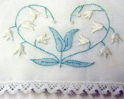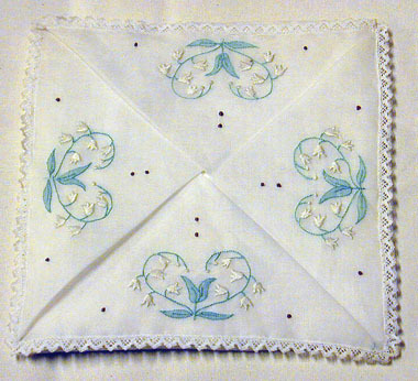 Näsduksfodral av vit linne(?) batist med botten av vit sidencrêpe. Kantad av fina spetsar. Fodralet är vikt så att det bildar en försluten, platt påse. De fyra triangelformade fälten på ovansidan är broderade med en hjärtformig blomställning i grönt och vitt. På varje fält finns fyra geometriskt ställda bruna punkter av påsydd tråd. Botten, fodrad, av vit, ganska tjock, sidencrêpe.