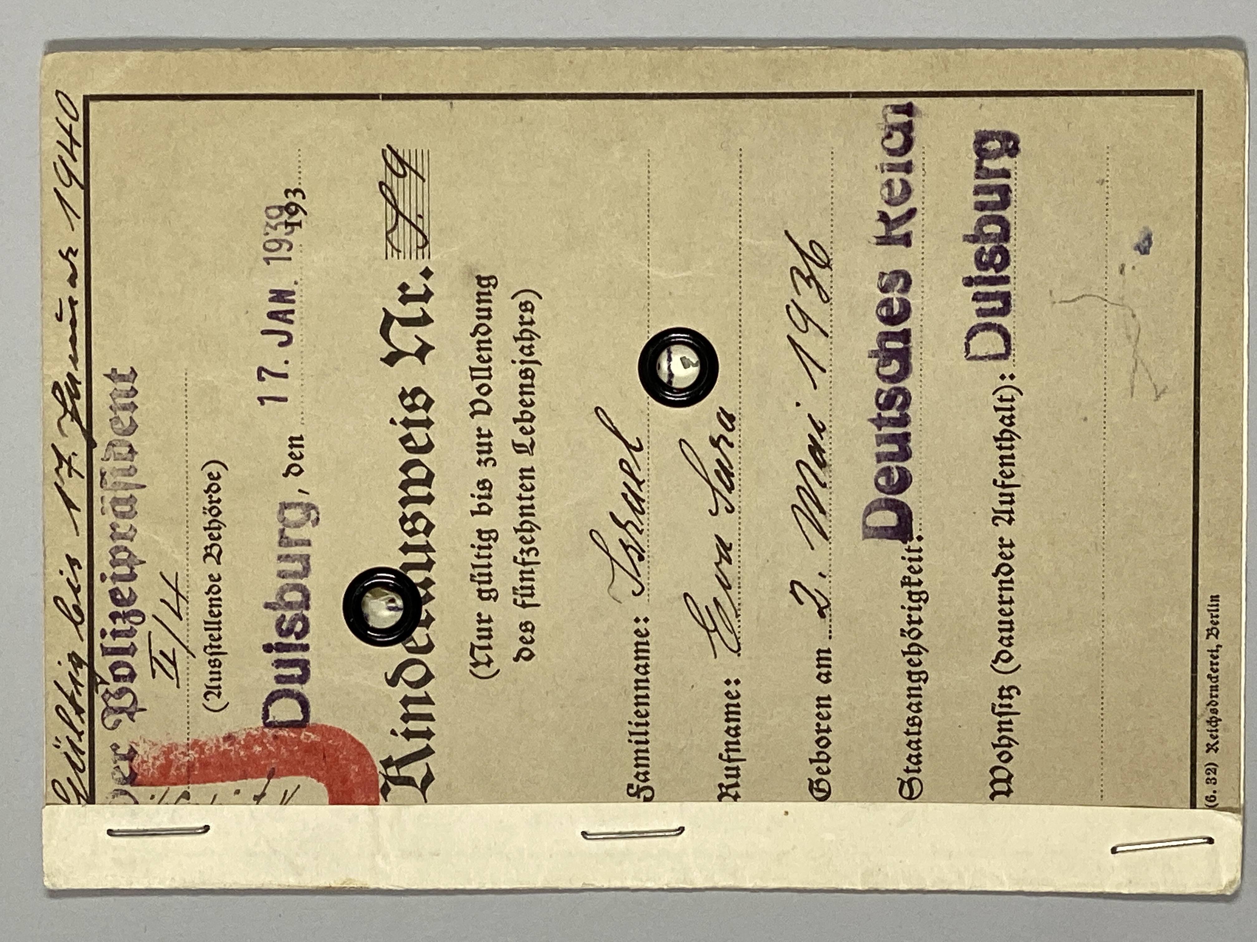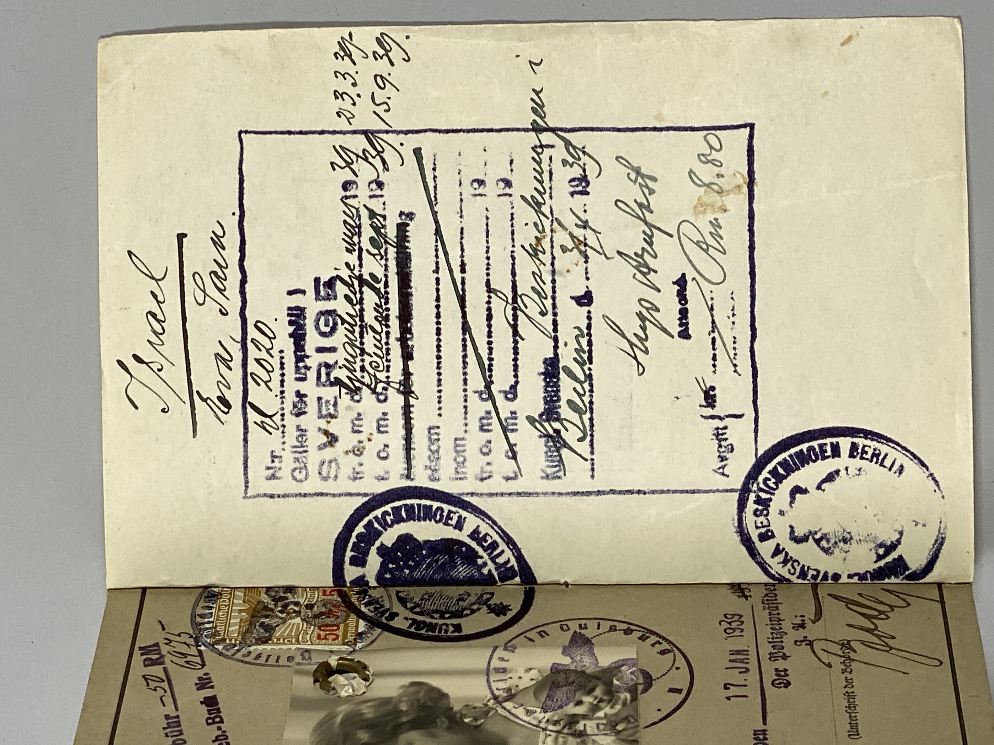 Id-handling i kartong med fasthäftat visum i papper. Förtryckt text och ifylld handskrift. Flertalet stämplar på fram- och insida. Fotografi av barn hållandes en docka på insidan. Rött "J" i övre vänster hörn på framsidan.