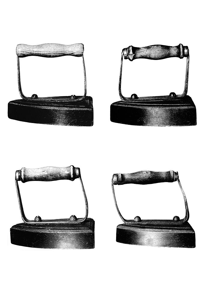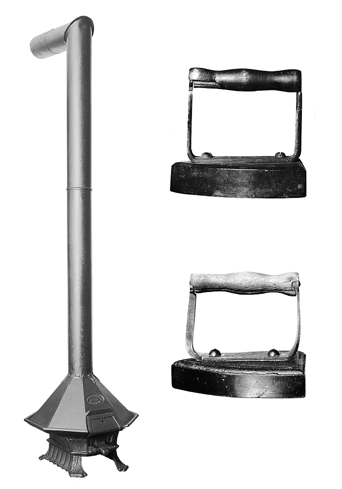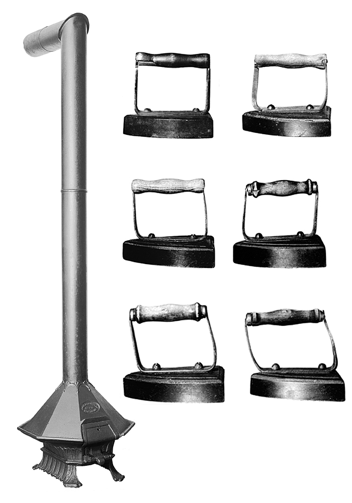 STRYKUGN med rökrör samt sex strykjärn. Av järn, gjuten. Övre delen åttasidig, kilformigt avsmalnande uppåt, med sidorna upptill avslutade mot ett kort rör, varpå rökröret fästes. Nedtill längs sidorna en utstående kant till stöd för strykjärn. Undre delen som fyr, avlång, med fasade hörn och utsvängda sidor. Asklåda saknas. Höjd: 35,5 cm, sidbredd: 15 cm. Rökrör: Av järnplåt, runt, jämngrovt, upptill med ett rätvinkligt knä. Längd: 1,156 m. diameter: 8,1 cm. Stykjärn: Av järn, gjutna, massiva, platta, hjärtformiga samt med handtag. Handtaget utgöres av en på järnets översida liggande platt skena med i rät vinkel upphöjda ändar mellan dessa en svarvad träkavel av ask eller björk. Höjd: 15-16,3 cm. Längd: 16-16,8 cm, bredd: 10,8-12,8 cm, tjocklek: 4-4,4 cm. Strykugnen inköpt av Wilhelmina von Hallwyl på 1870-talet eller 1880-talet hos J & C.G. Bolinders Mekaniska Verkstad Aktiebolag, Stockholm. Strykjärnen inköpta av Wilhelmina von Hallwyl under 1800-talets senare hälft hos olika handlare i Stockholm. Överförda av Wilhelmina von Hallwyl år 1916 från säteriet Ericslund, Södermanland till Hallwylska huset, Stockholm.