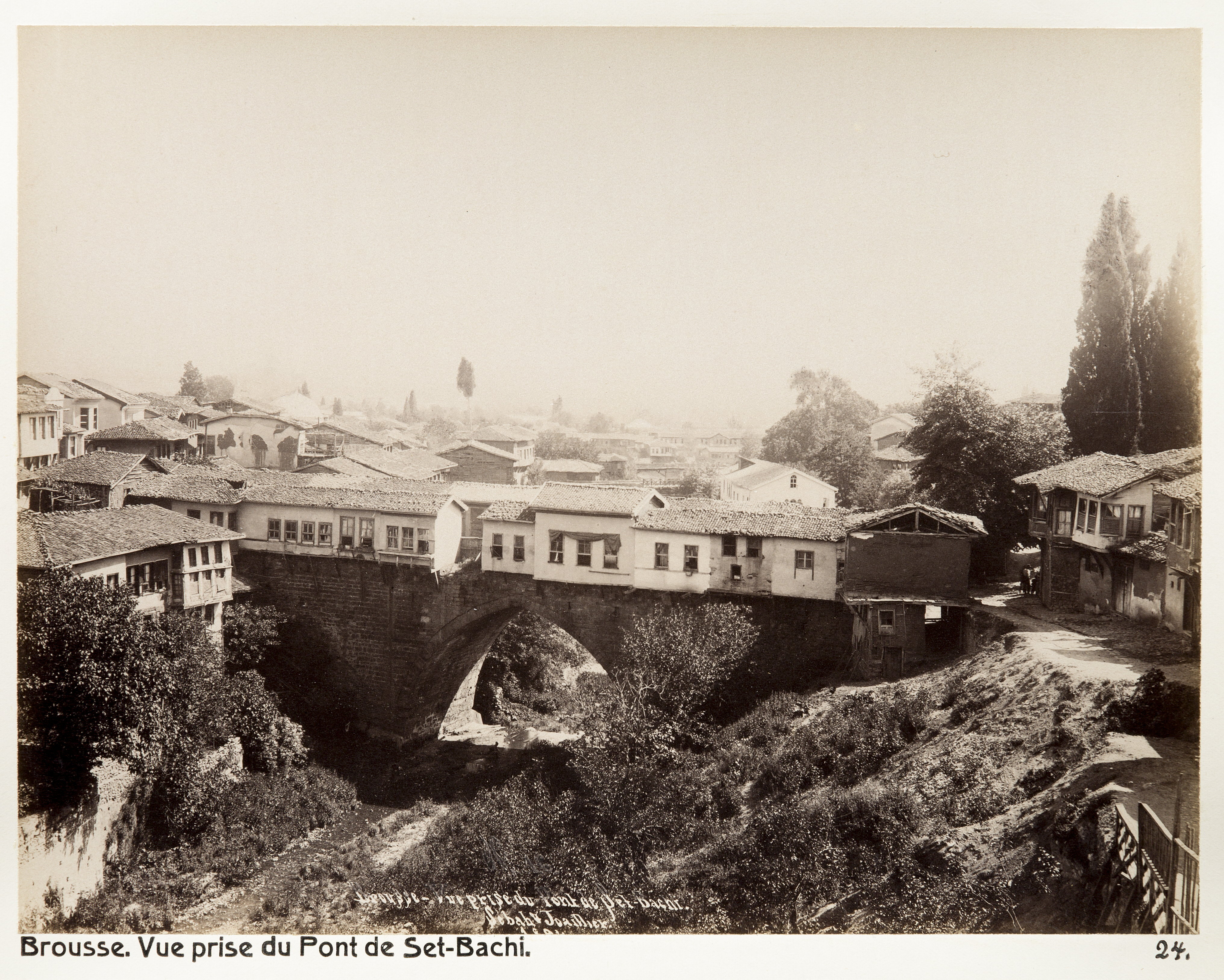 Bursa. Utsikt från Pont de Set-Bachi (Irgandı-bron?) i Bursa. Text på originalet: "Brousse. Vue prise du Pont de Set-Bachi." Fotografierna LXVI:O.01.-54. kommer från resan till Turkiet och Mindre Asien som Wilhelmina och Walther von Hallwyl gjorde den 27 april - 20 juni 1901. De lämnade Sverige den 5 november 1900 för Egypten, där de stannade till den 28 mars 1901, då de fortsatte till Palestina. Den 27 april fortsatte de till Turkiet och Mindre Asien. Med på resan var Wilhelminas sällskapsdam, fröken Ida Uhse. I Konstantinopel (Istanbul) anslöt sig Wilhelminas mor Johanna Kempe och kusindottern Elma Hök. Fotografierna är inköpta av Wilhelmina i Konstantinopel (Istanbul) och Brussa. Alla uppgifter kommer från Ida Uhses reseanteckningar.
