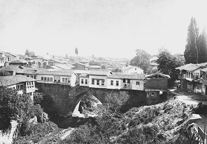 Fotografi. Utsikt från Pont de Set-Bachi (Irgandı-bron?) i Bursa.