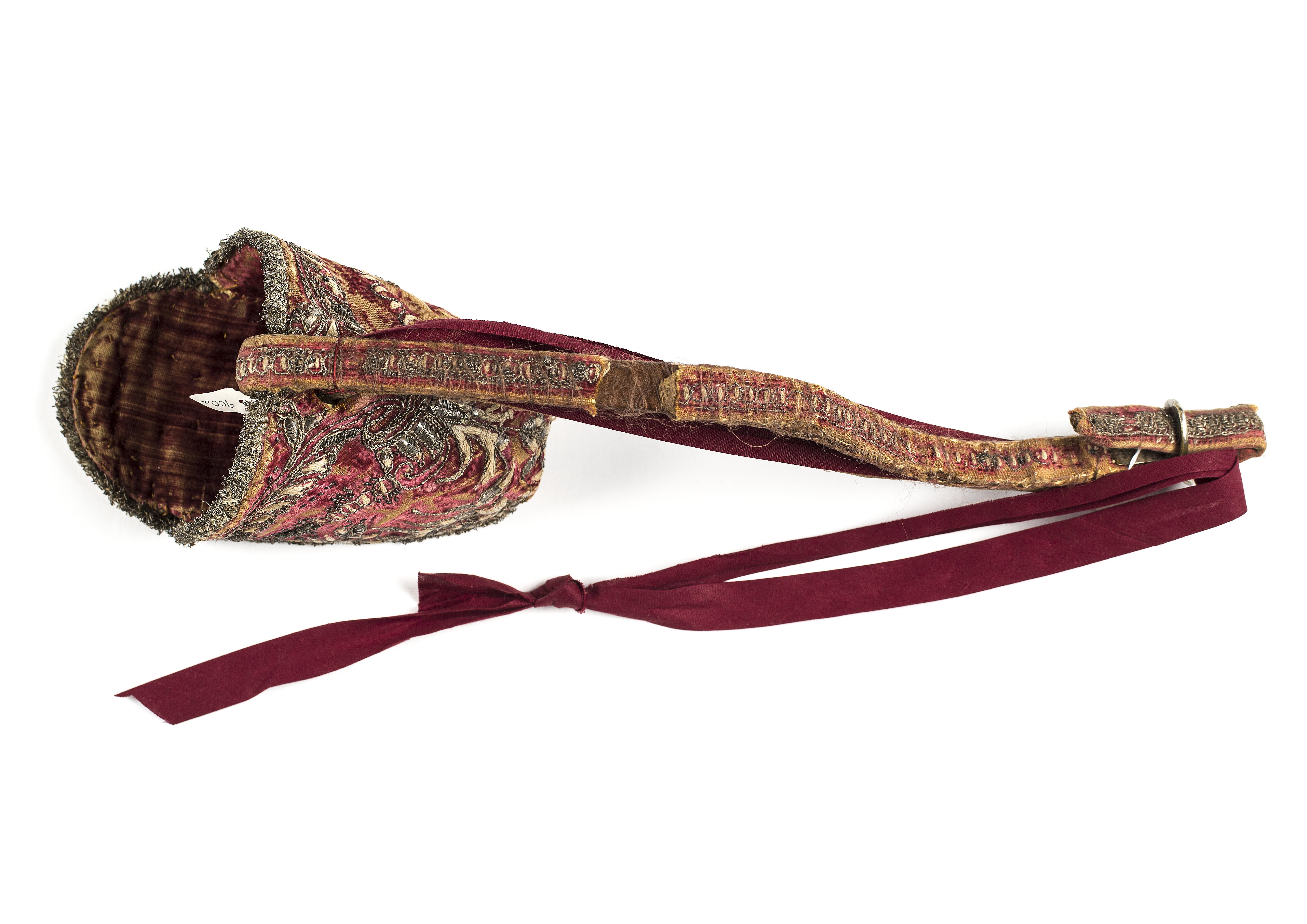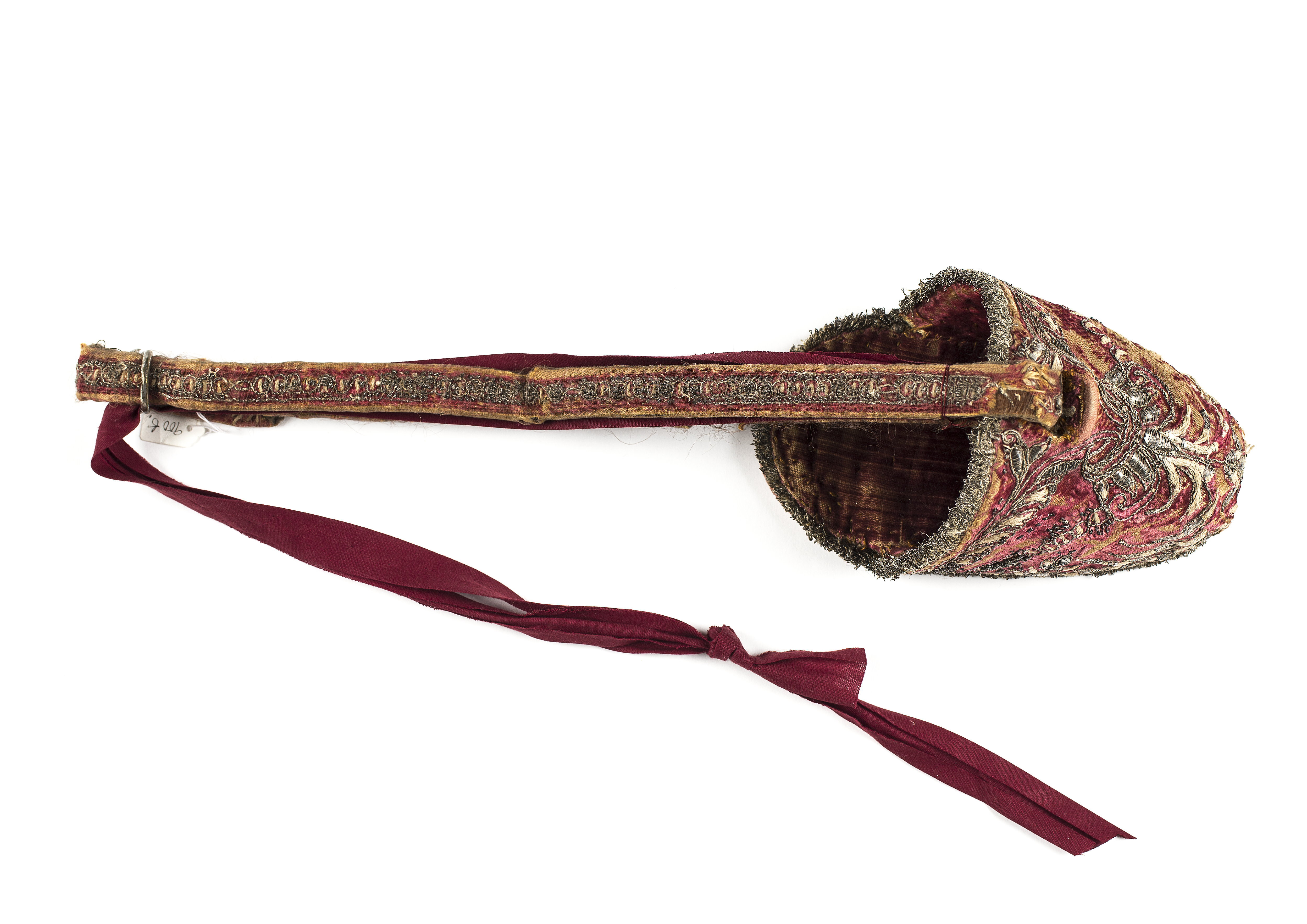 Stigläder överklädd med sammet samt med broderad silverranka på mitten.