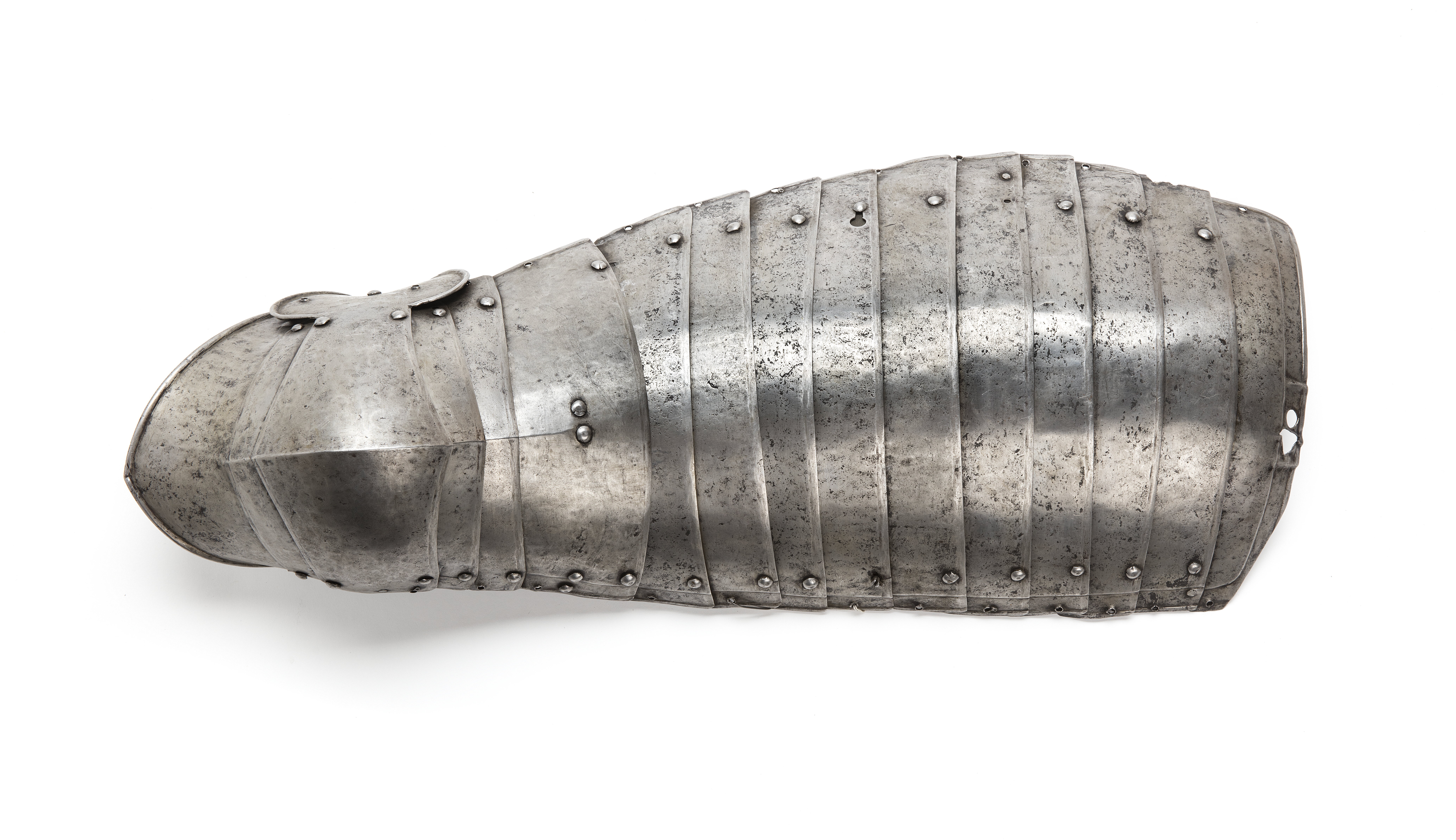 Höger tassett till kyrassiärrustning i 16 delar, delbar mellan sjätte och sjunde lamellen. Översta lamellen svagt kupad frö att passa mot harneskets utvik. Över och innerkant med försänkt bård samt i överkant, två hål för fästning i harnesk. något avtagen i övre inre hörnet. Nästföljande fem lameller med svagt fasade överkanter. Insidan ytterkanter med svagt veck och försänkt bård. Ytterkanten med svagt veck. Den sjätte lamellen uppifrån med inåt omvikt, rundsmidd mejslad kant. Vid innerkanten en vridnit och vid ytterkanten en svampformad nit för fästning i den nedre delen av tassetten. Den övre delen av tassetten bildar var man kan kalla en kort tassett. Sjunde till tioende lamellerna med likadant utseende som de övre. Första till tioende lamellerna är nitade direkt i varandra i ytterkant i avlånga hål och i mitten och i innerkant sitter de på läderrem med nit. Spår av läder även i ytterkant. Knäled bestående av sex delar med svag mittås. Samtliga kanter svagt fasade, förutom nederkanten som är inåt omvikt och rundsmidd. Knäbuckla med bladformig, enkel mussla med inåt omvikt, rundsmidd kant. Delarna är nitade direkt varandra. Den sjätte lamellen med en läderrem för att fästa tassetten mot låret. Ursprungligen har samtliga delar varit svärtade. Sekundärt upptagna hål längs ytterkanten.