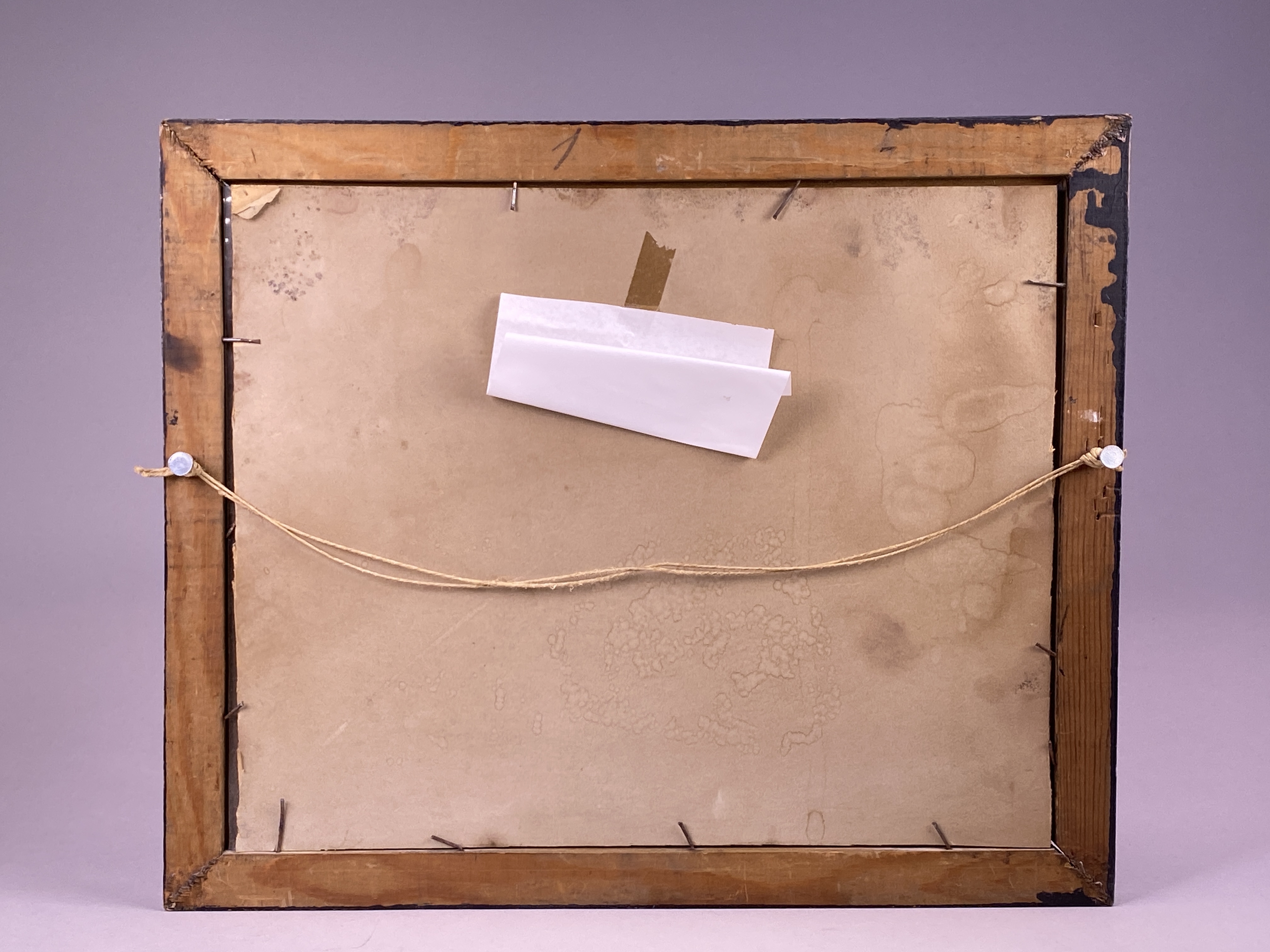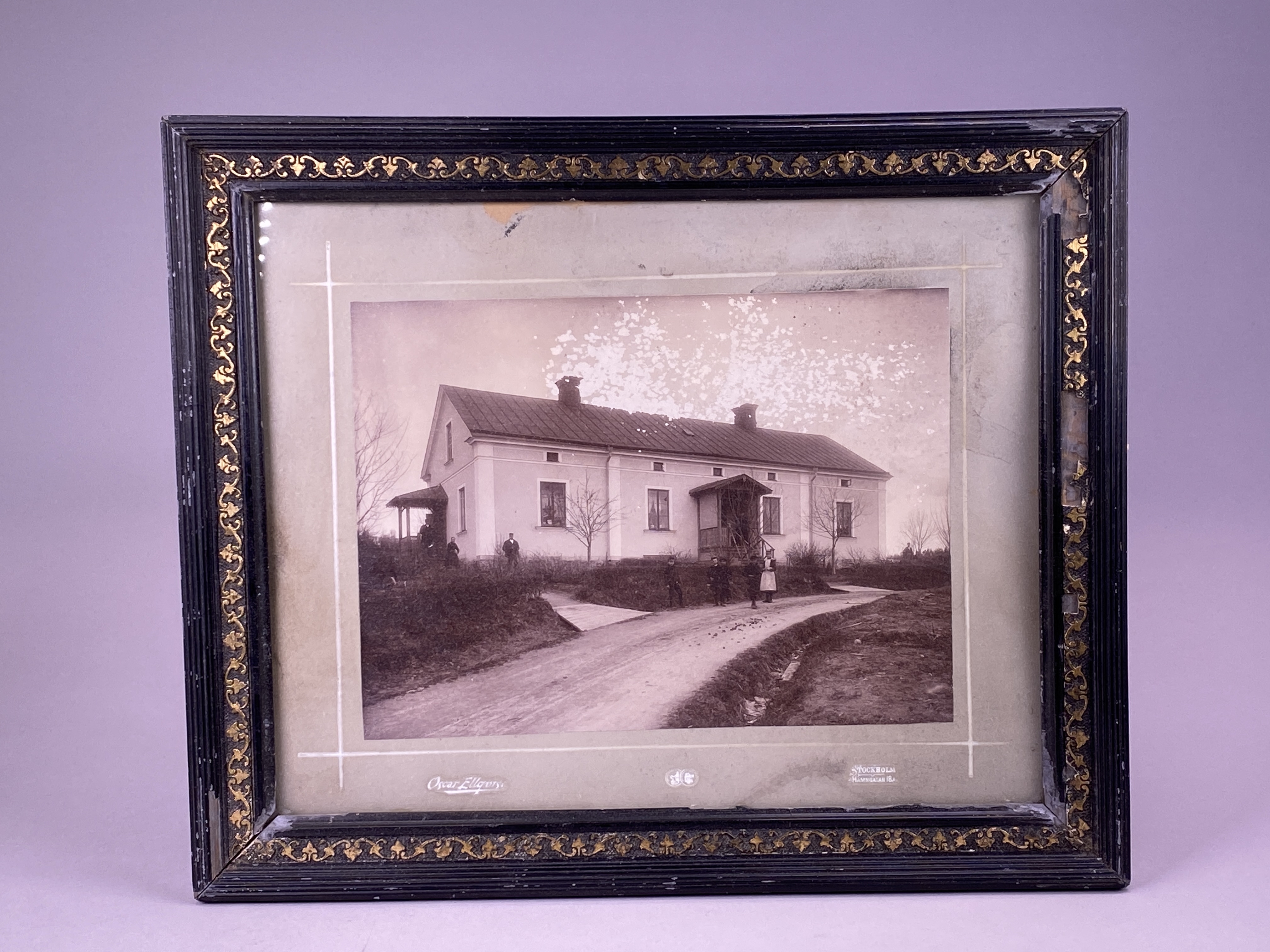 Inramat fotografi föreställande en av arbetarbostäderna på Tumba bruk. Svartvitt fotografi monterat på kartong med dekorationer och namnet Oscar Ellqvist. Liggandes rektangulär träram med glas. Profilerad och svartmålad ram med dekor föreställande bladmönster. Dekoren tillverkad i gips och målad i guld. Baksidan av ramen tillverkad i papp. Baksidan även snöre för upphängning, fäst mellan två spikar.