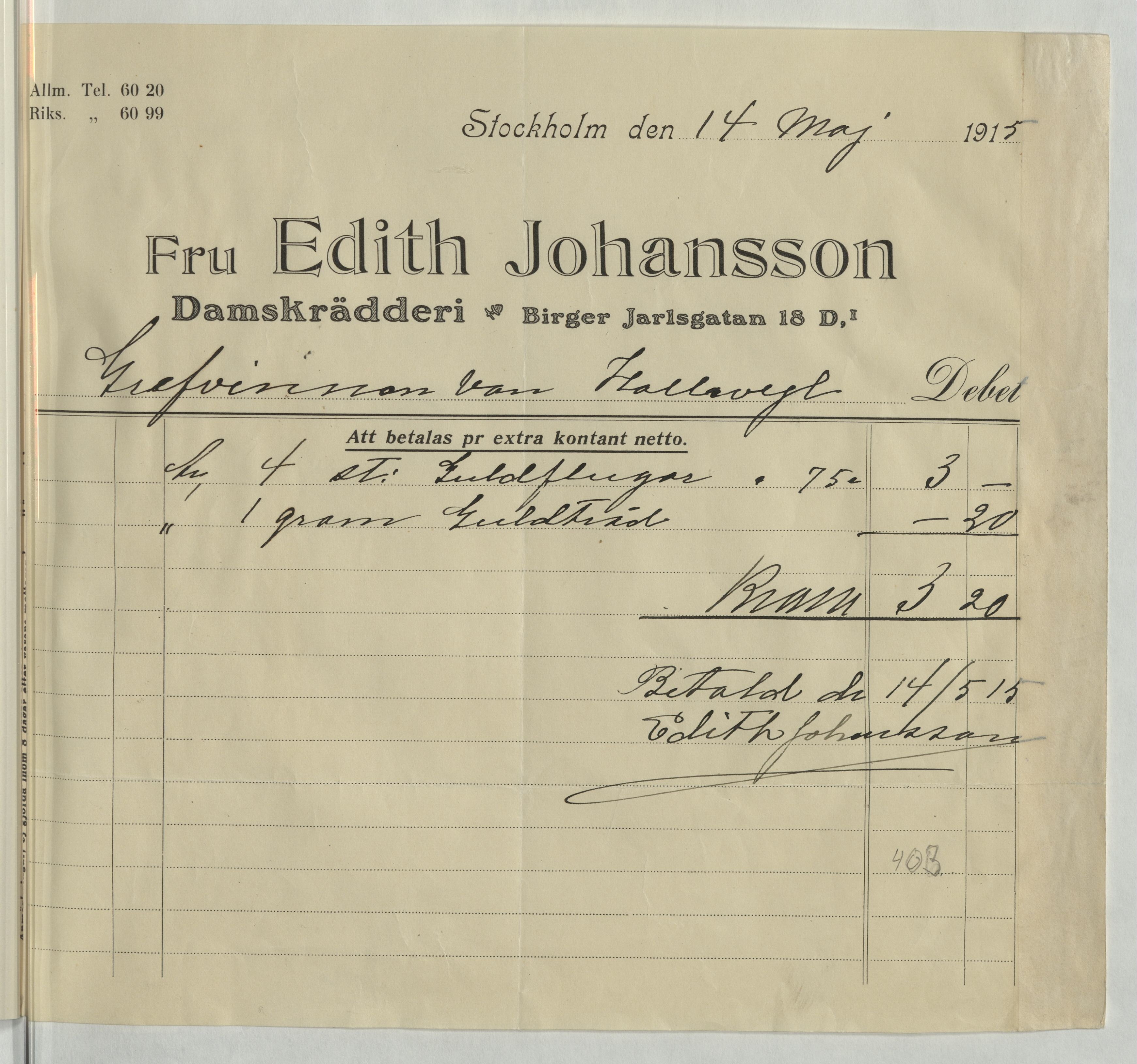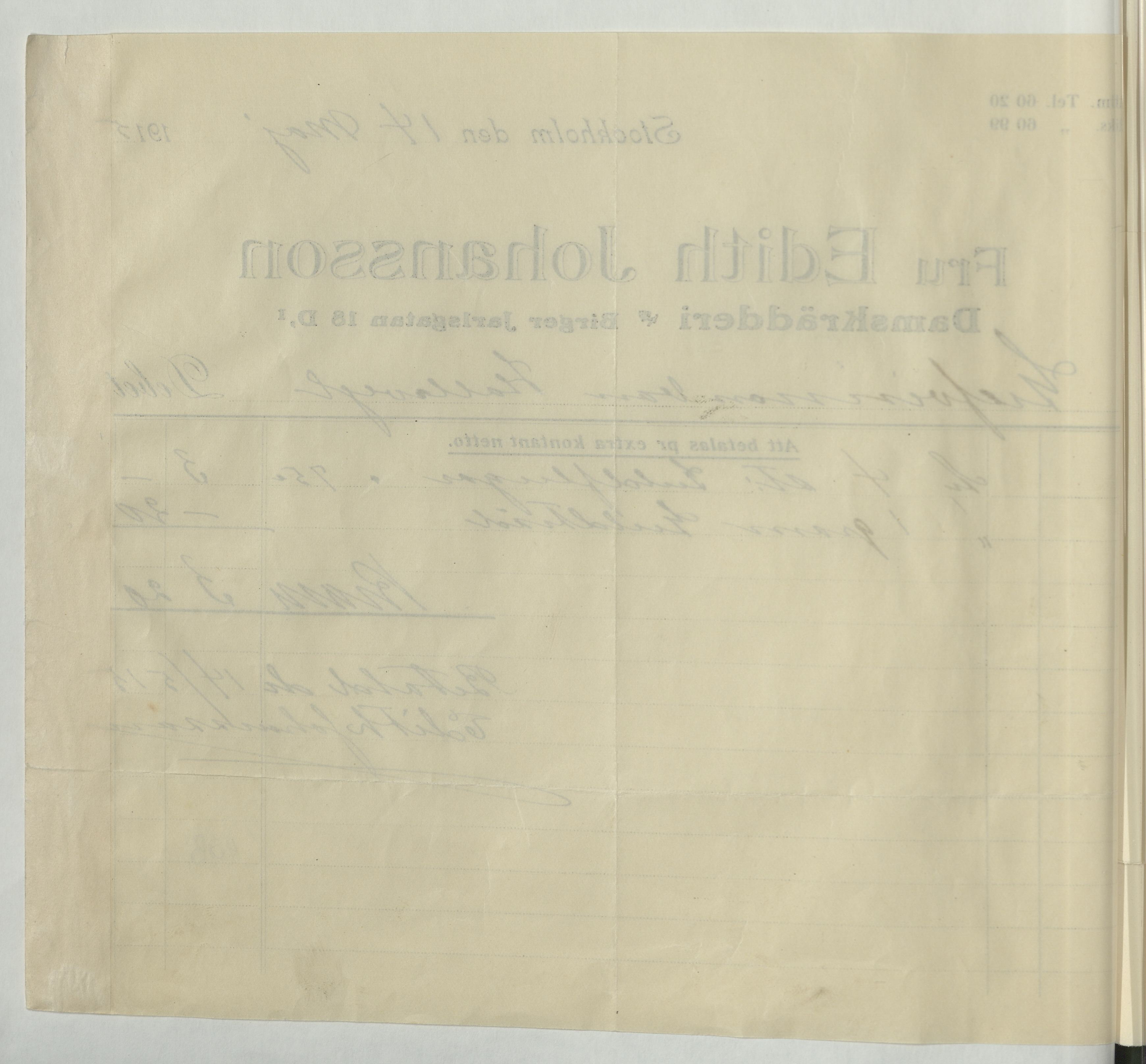 Kvitto från Fru Edith Johansson, Damskrädderi